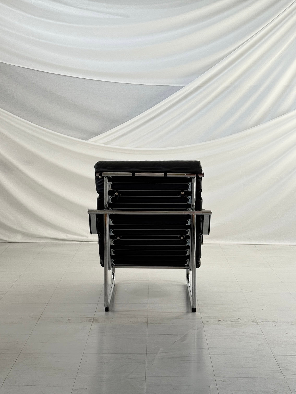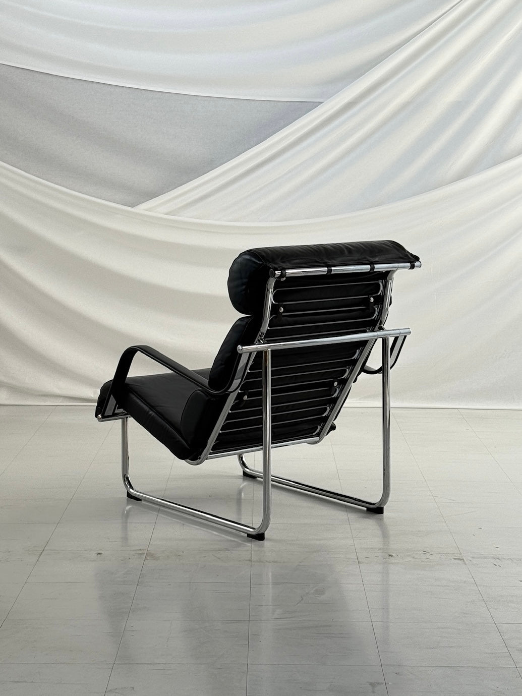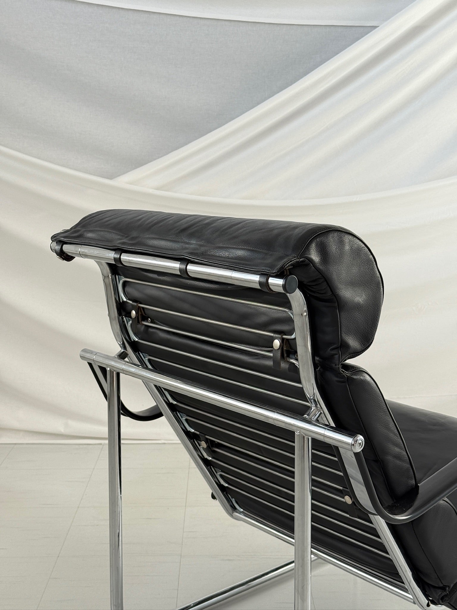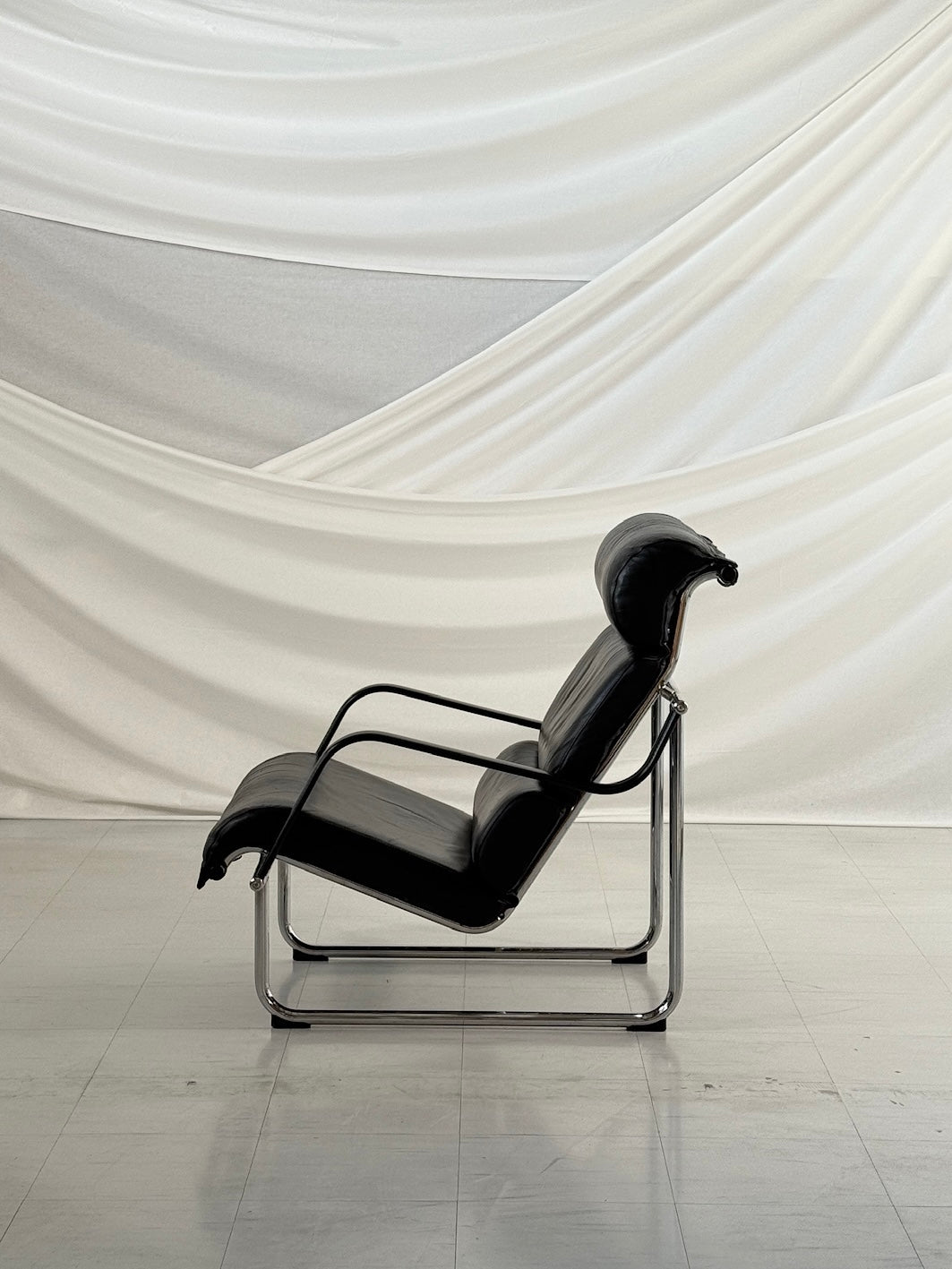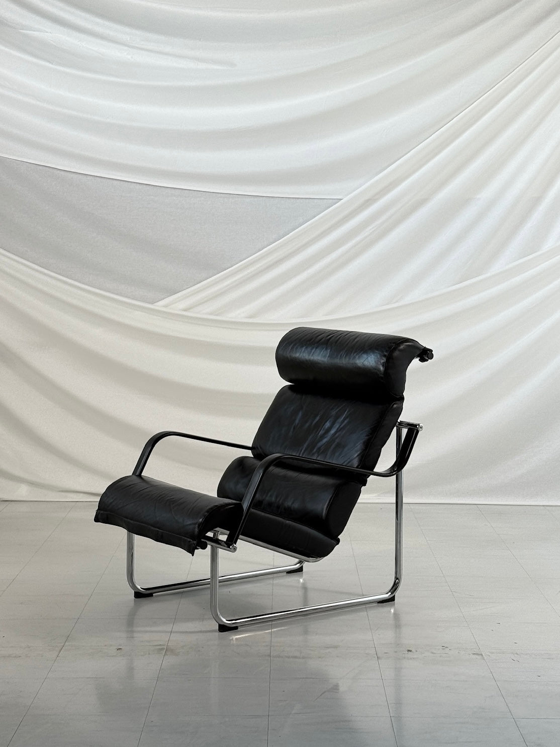 フィンランドの建築家ユルヨ・クッカプロが1970年代にデザインした「レミ」アームチェアは、人間工学と機能的なミニマリズムへの彼のこだわりを反映しています。スチール製のチューブフレームが、パッド入りのレザークッションを優雅に吊り下げることで、軽やかでありながら快適な構造を生み出しています。背もたれと座面の角度を調節できる機能も、クッカプロによる人間中心のデザインアプローチを体現しています。
