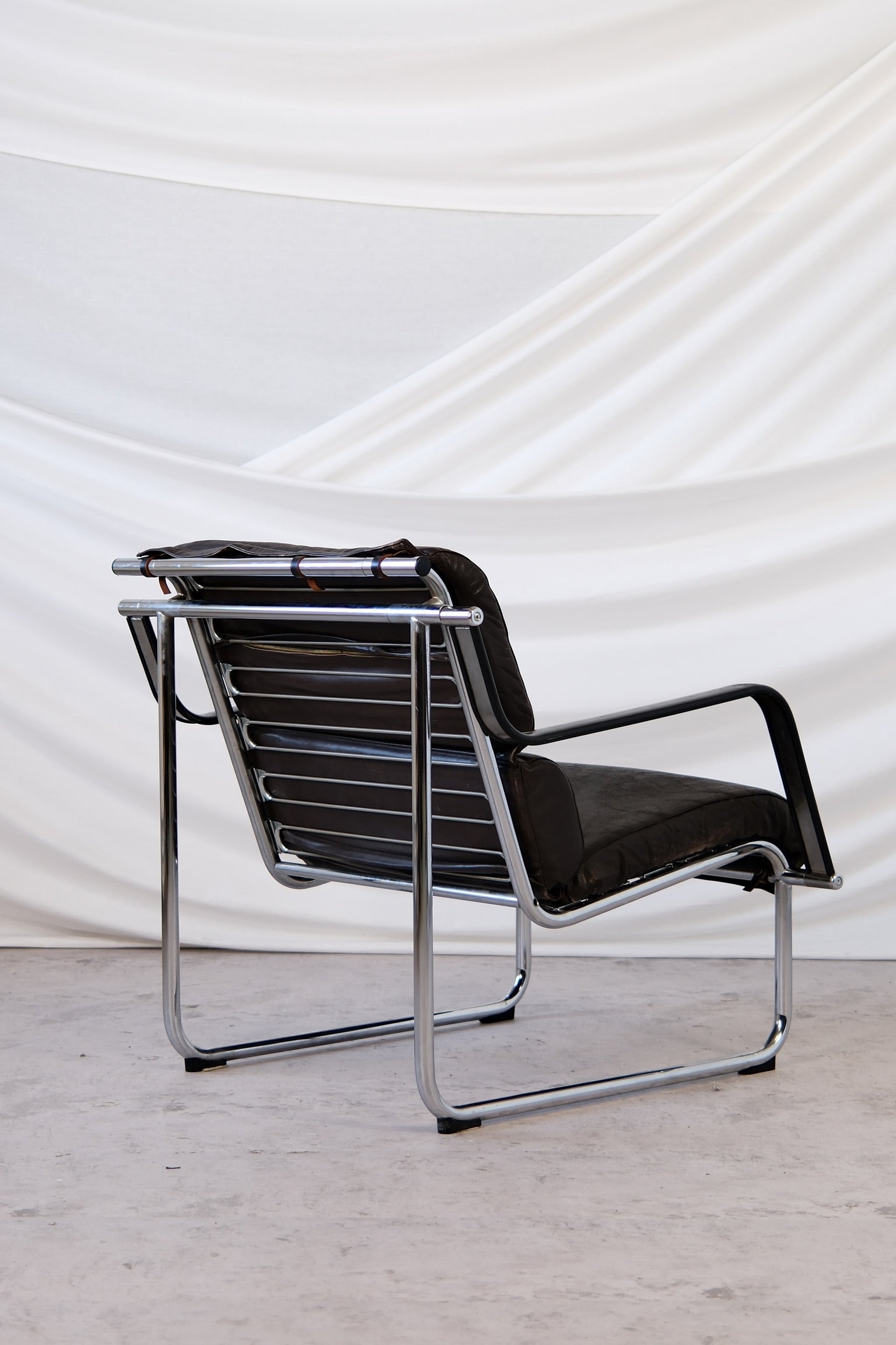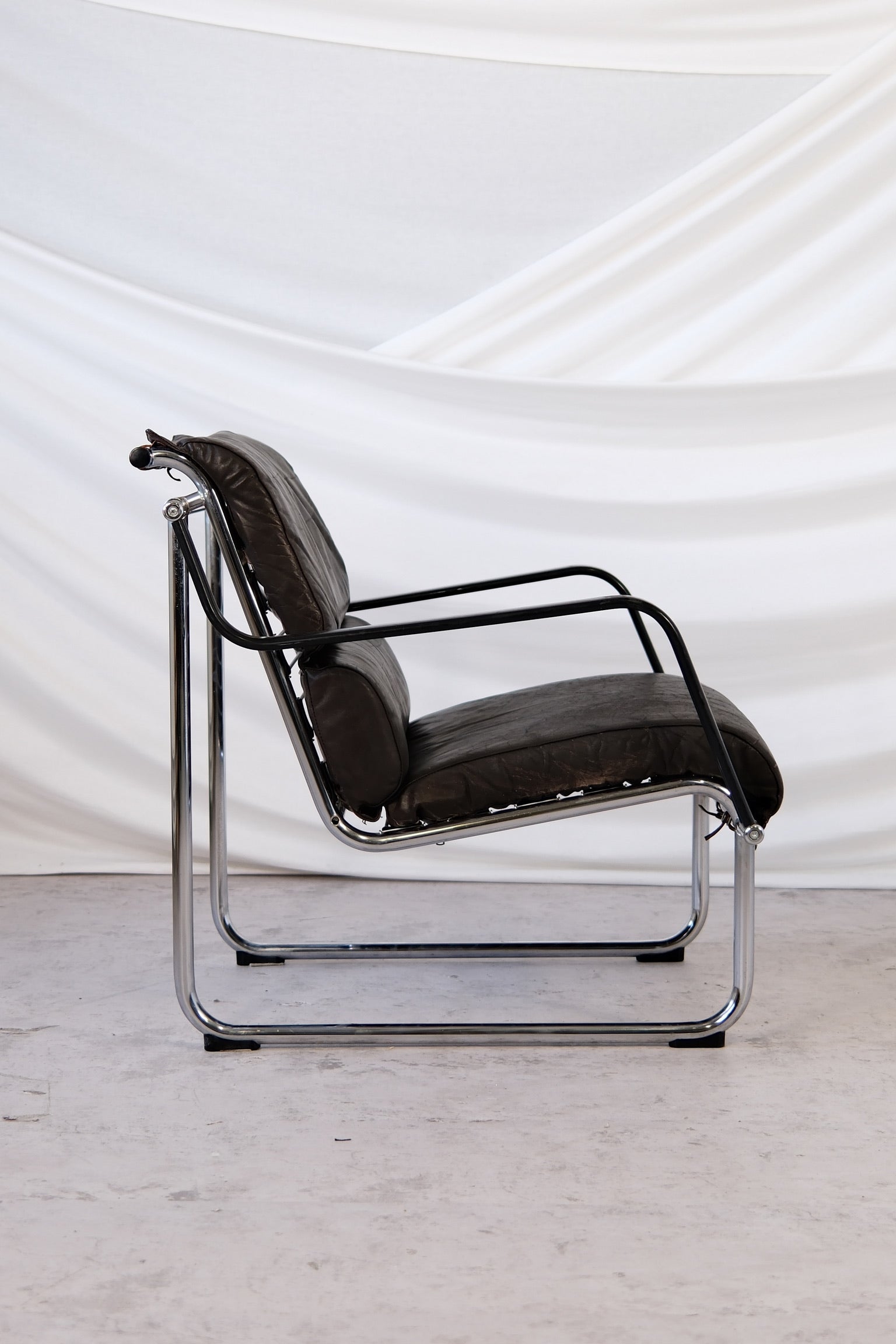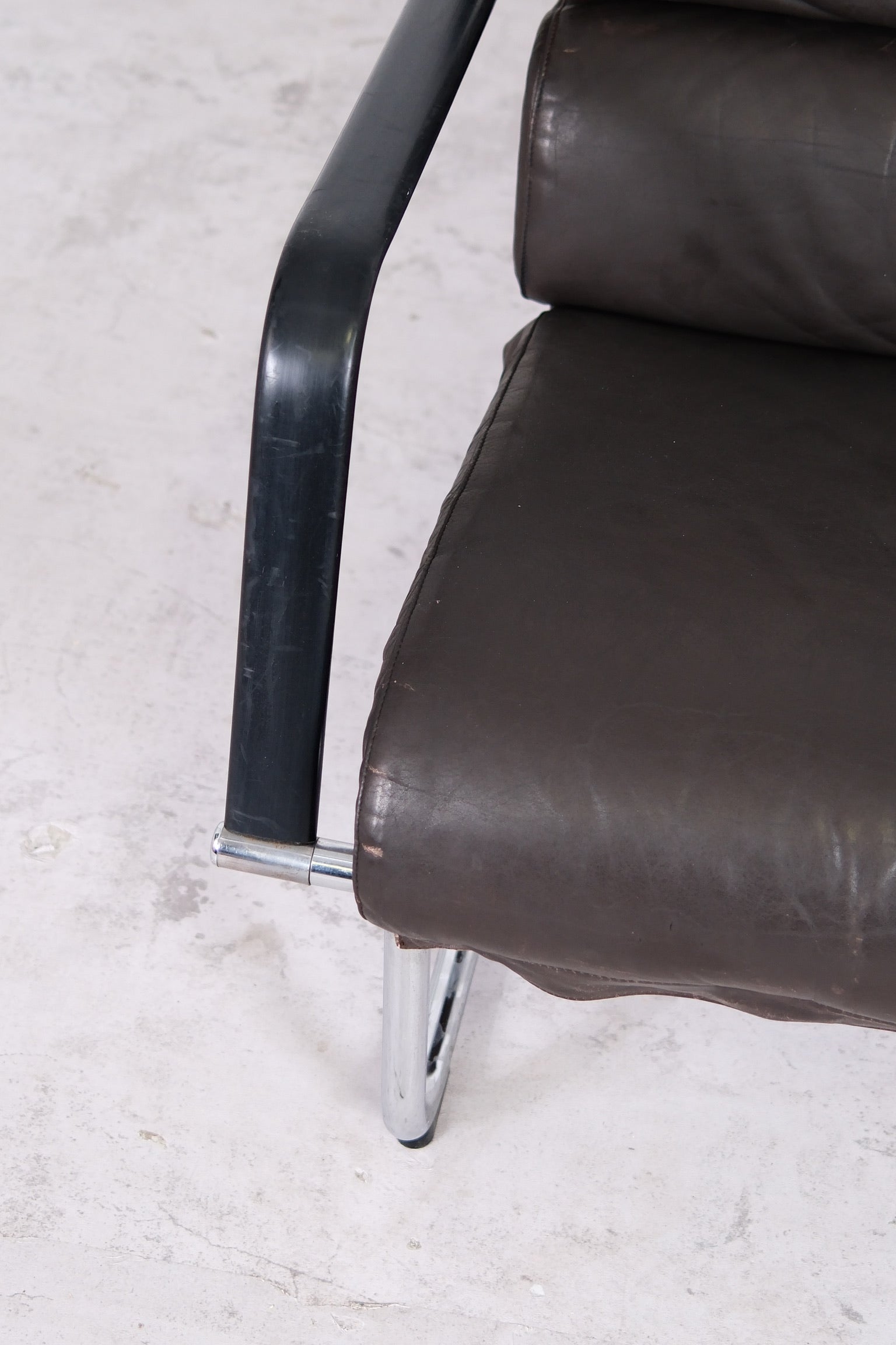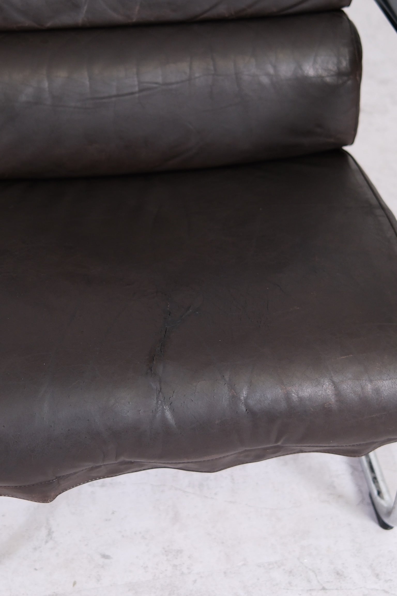 Designed by Yrjö Kukkapuro in the 1960s, the Remmi armchair stands as one of Finland’s most iconic modernist designs. Produced by Avarte, this medium-sized version features a sleek tubular chrome frame paired with deep brown leather upholstery that has developed a beautiful patina over time.