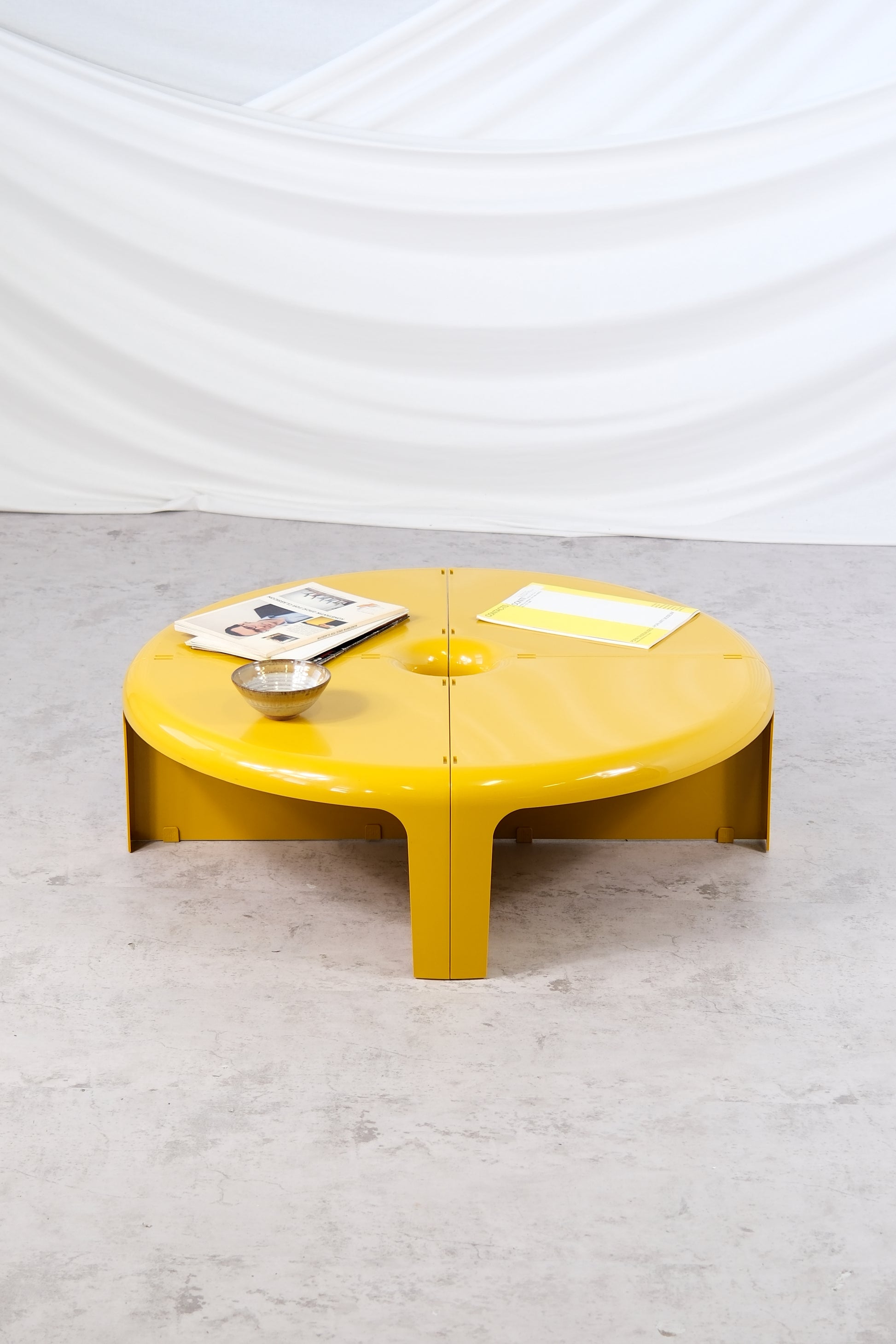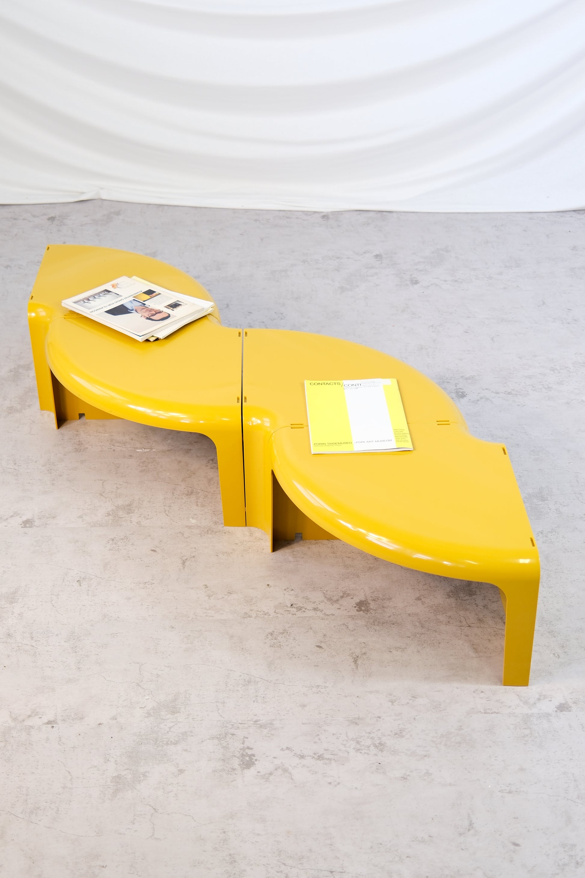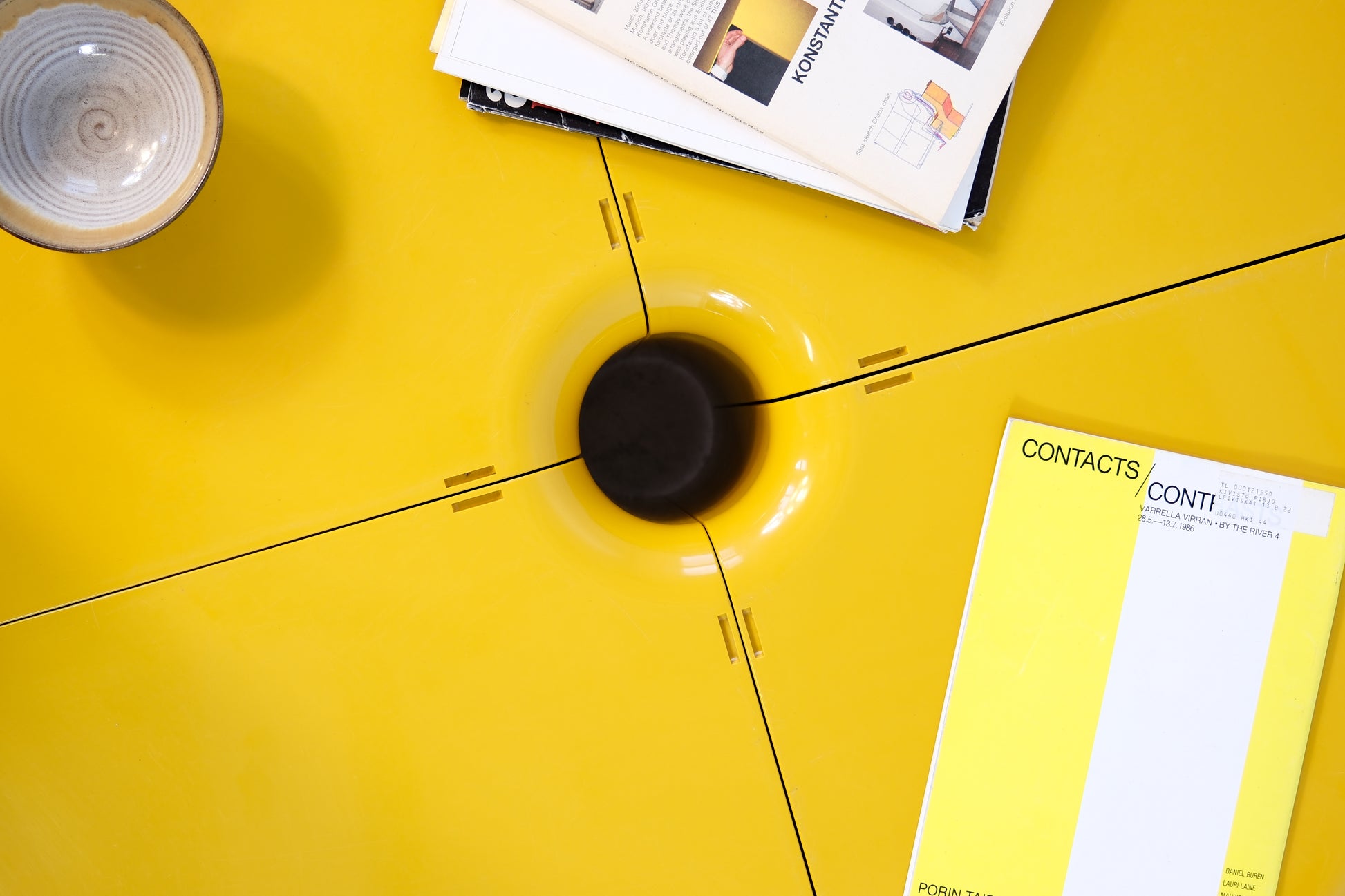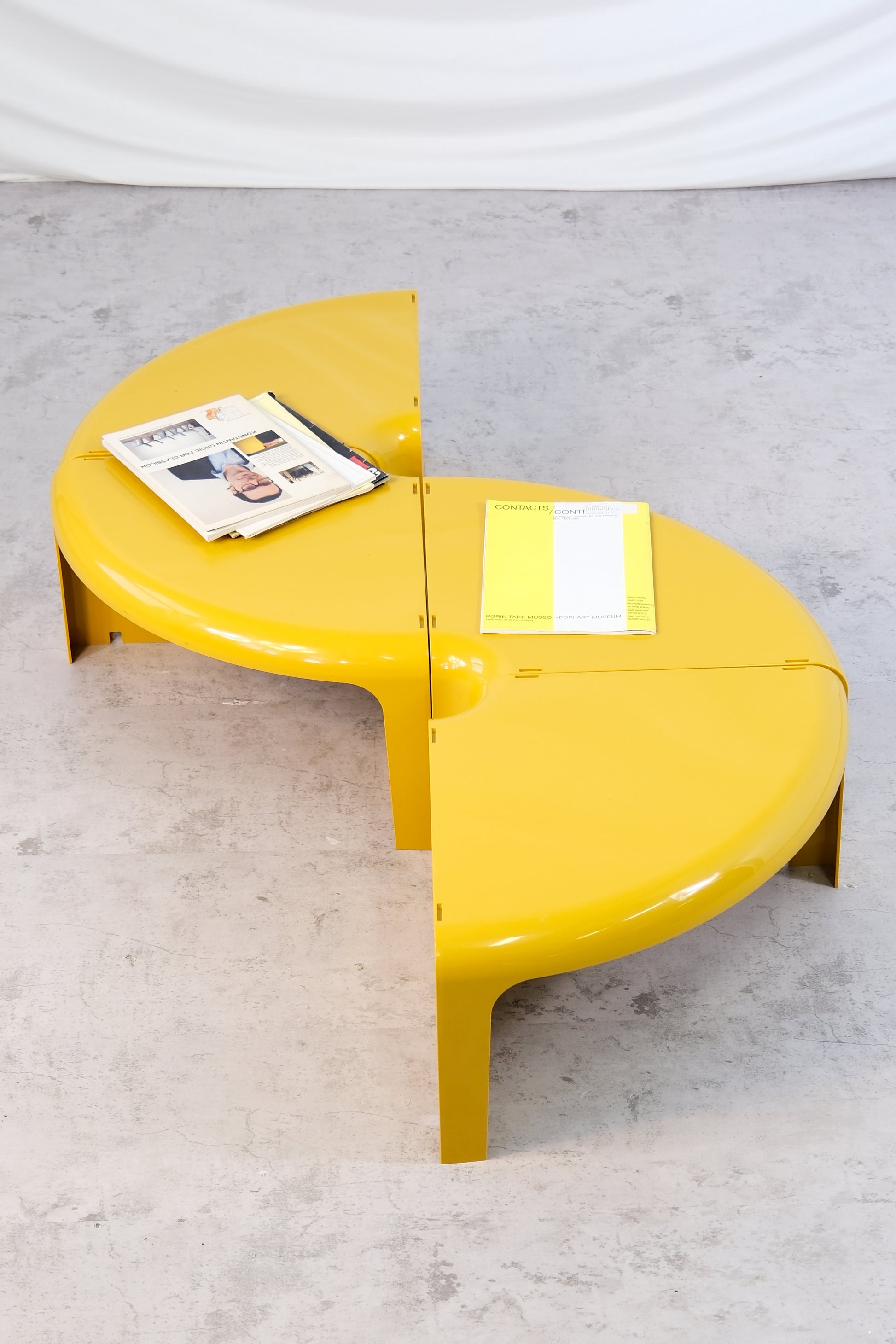 Designed in the 1960s by Italian designer Rodolfo Bonetto, the 4/4 table is a modular classic that balances playfulness with functionality. Made from durable plastic with a glossy yellow finish, the four curved elements can be combined in different ways: as a full round coffee table, separated into pairs to create side tables, or stacked vertically as a sculptural shelving unit.