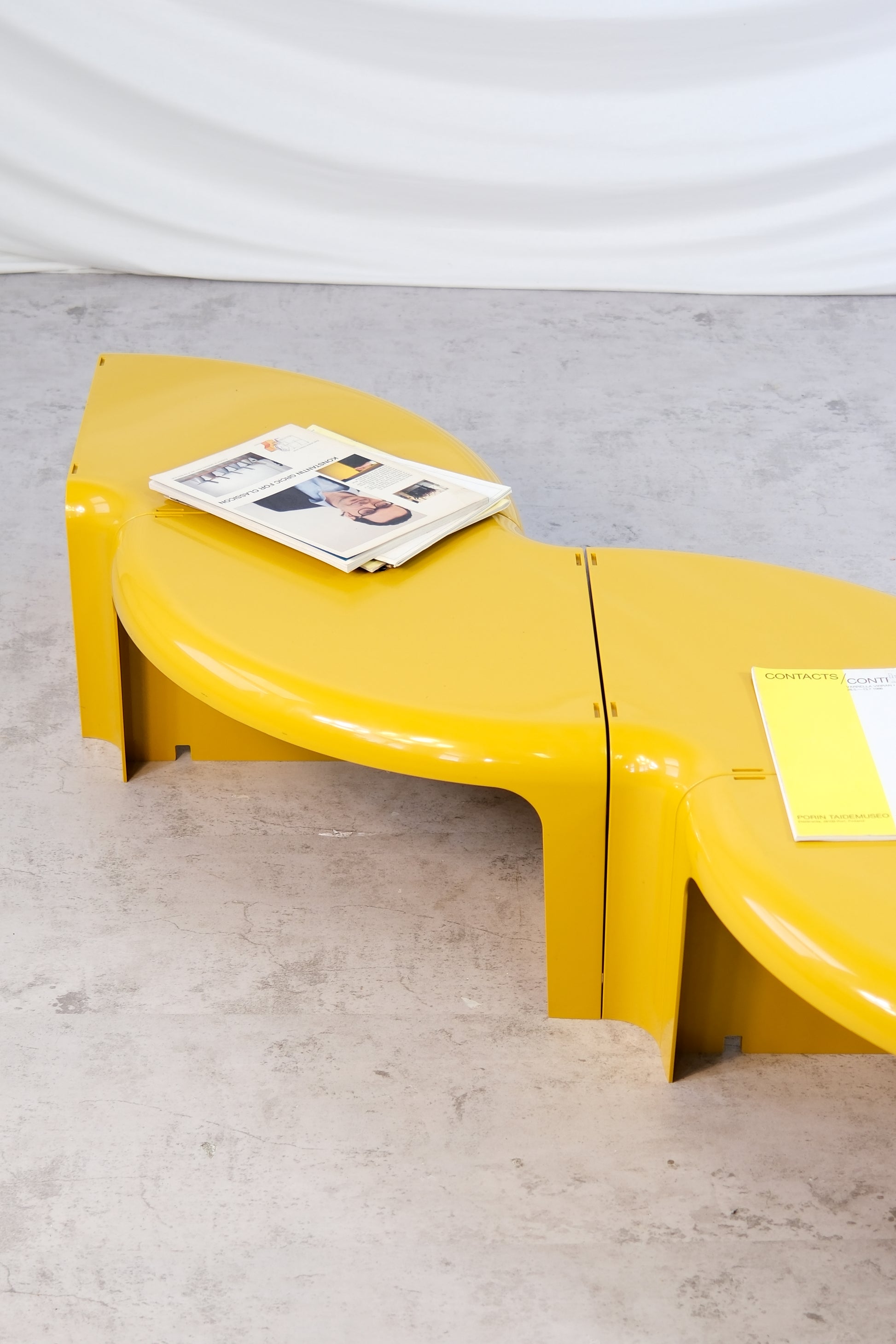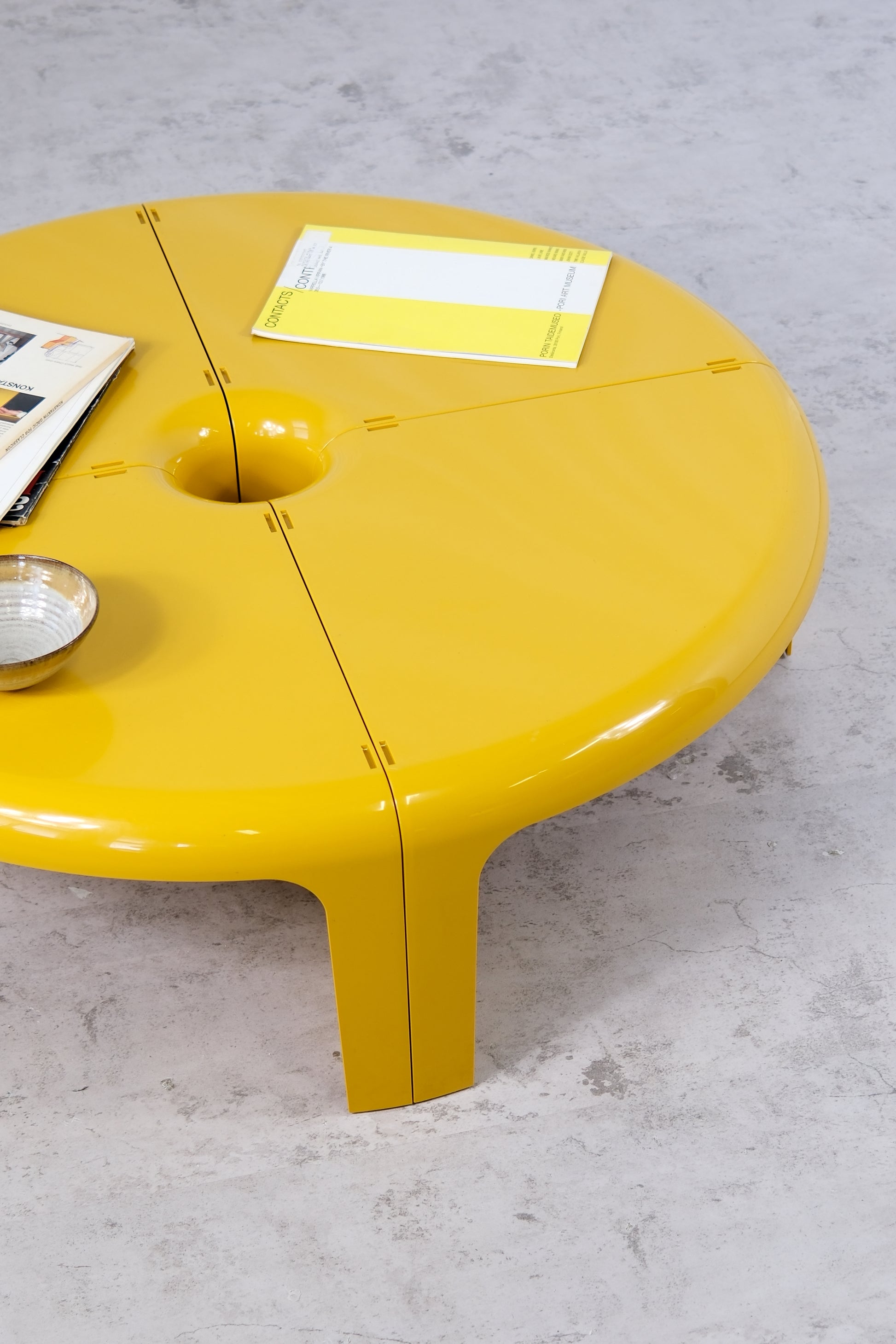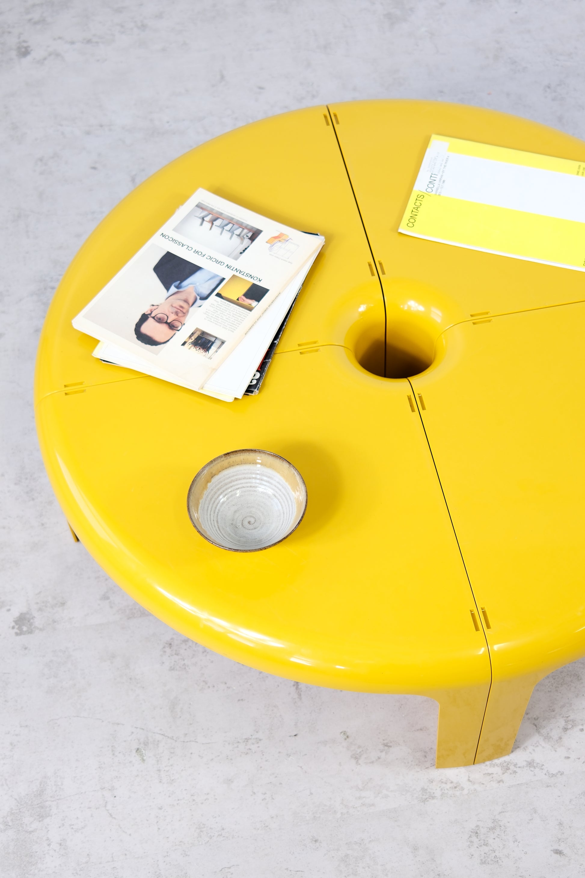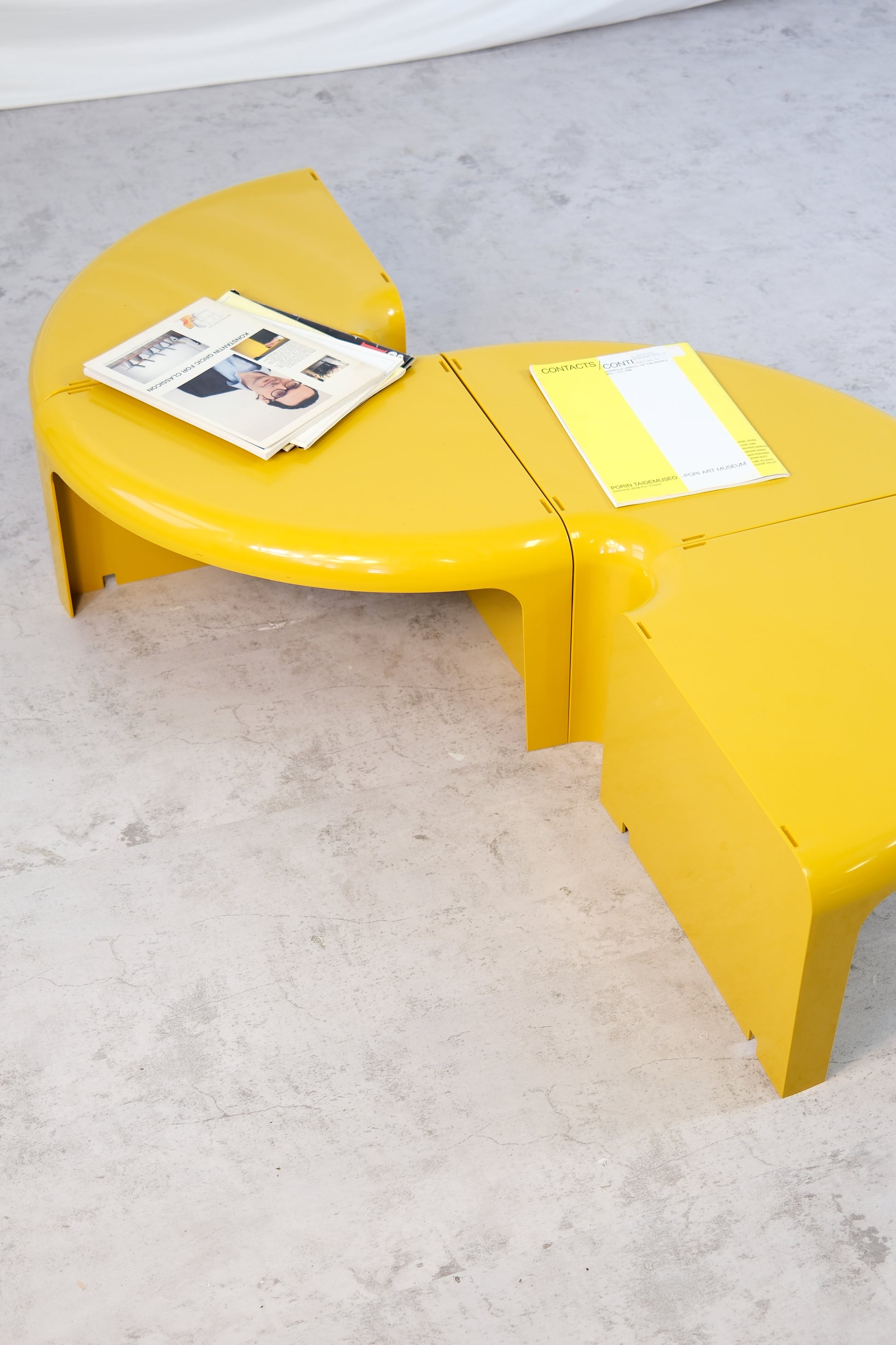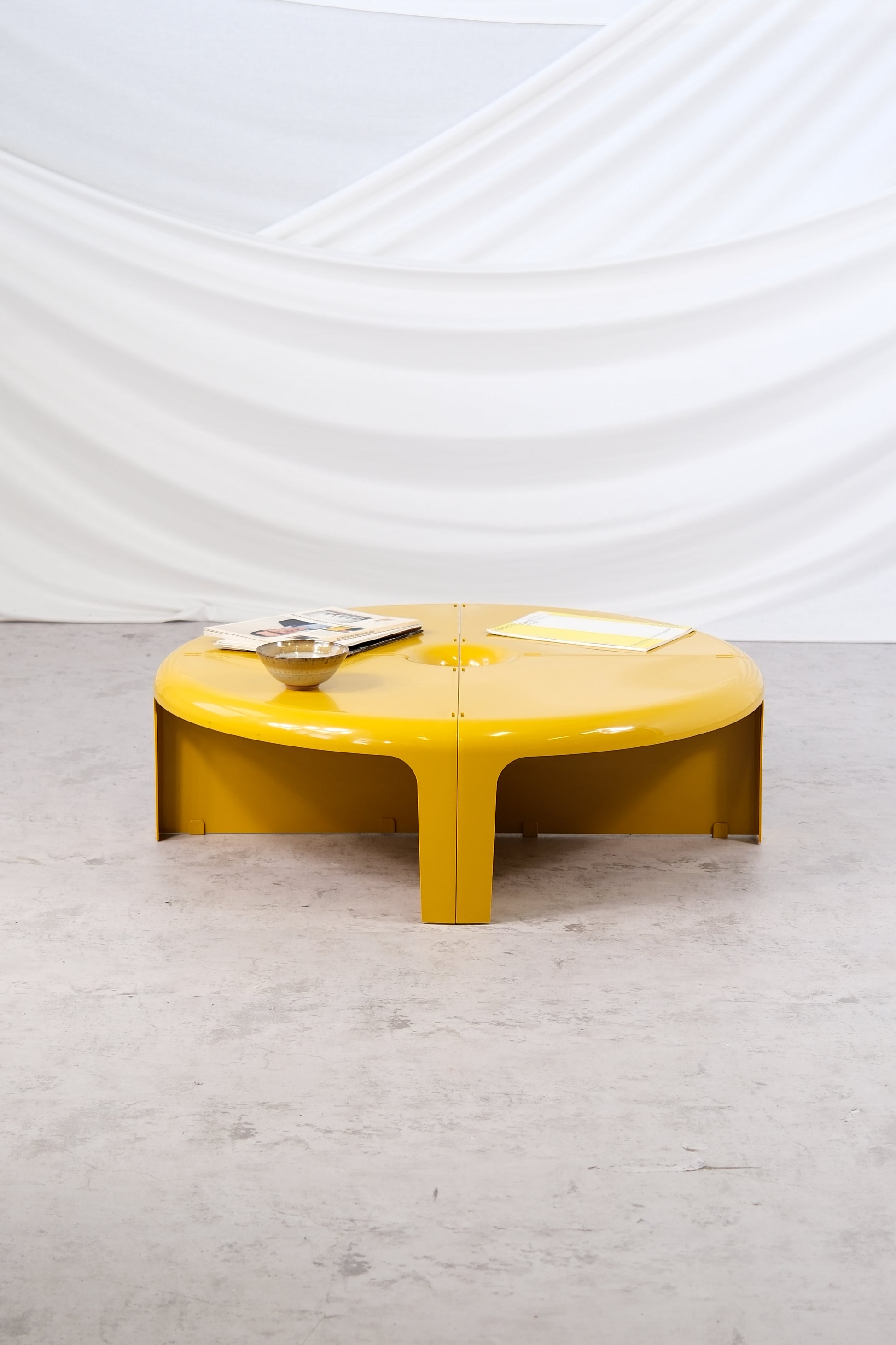 Designed in the 1960s by Italian designer Rodolfo Bonetto, the 4/4 table is a modular classic that balances playfulness with functionality. Made from durable plastic with a glossy yellow finish, the four curved elements can be combined in different ways: as a full round coffee table, separated into pairs to create side tables, or stacked vertically as a sculptural shelving unit.