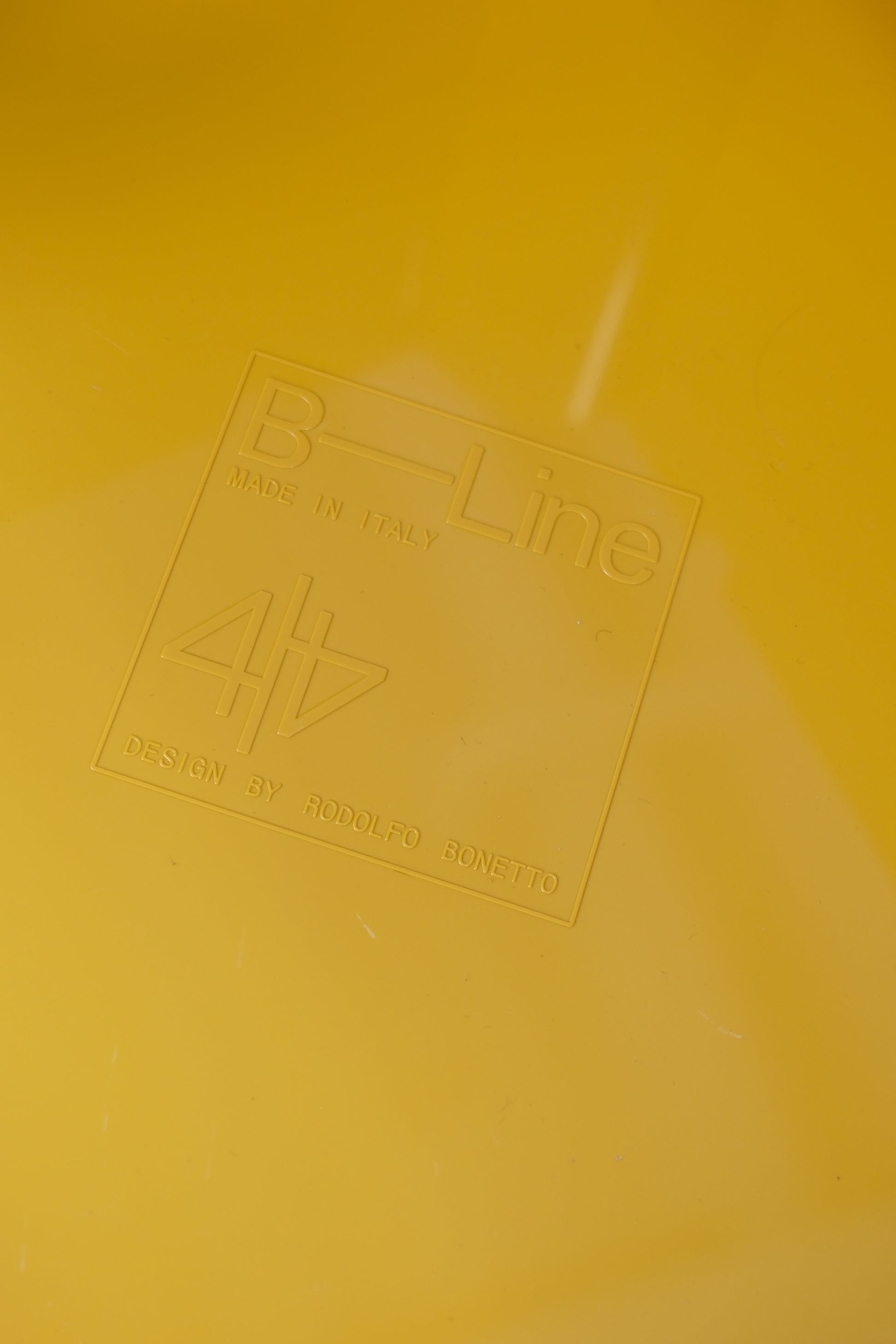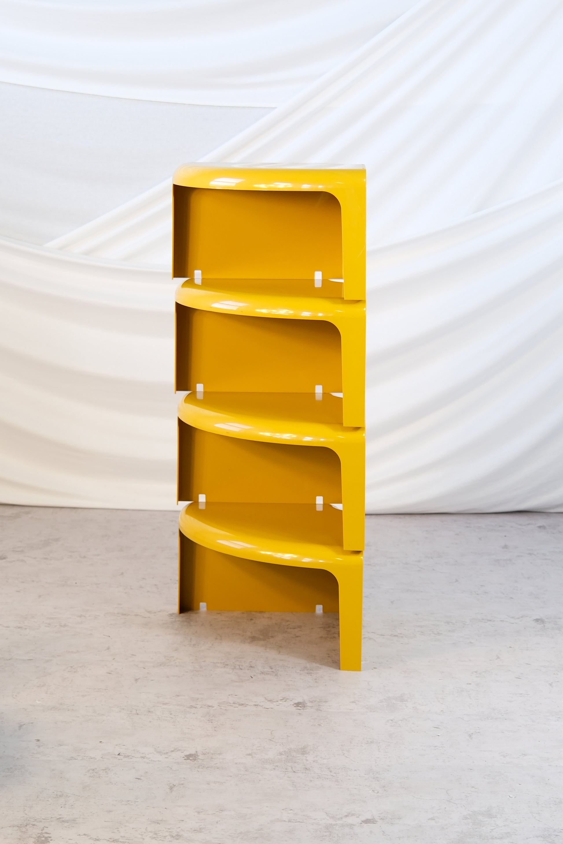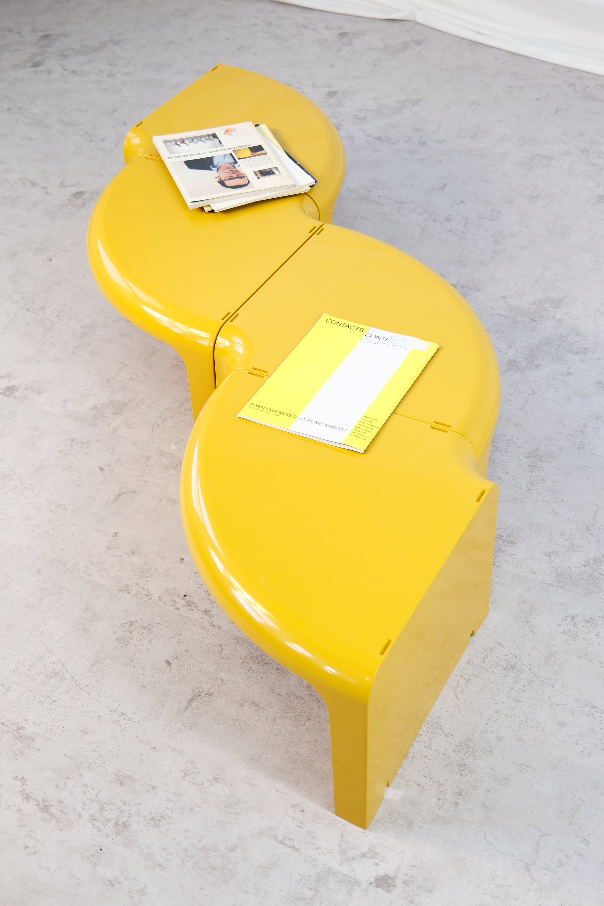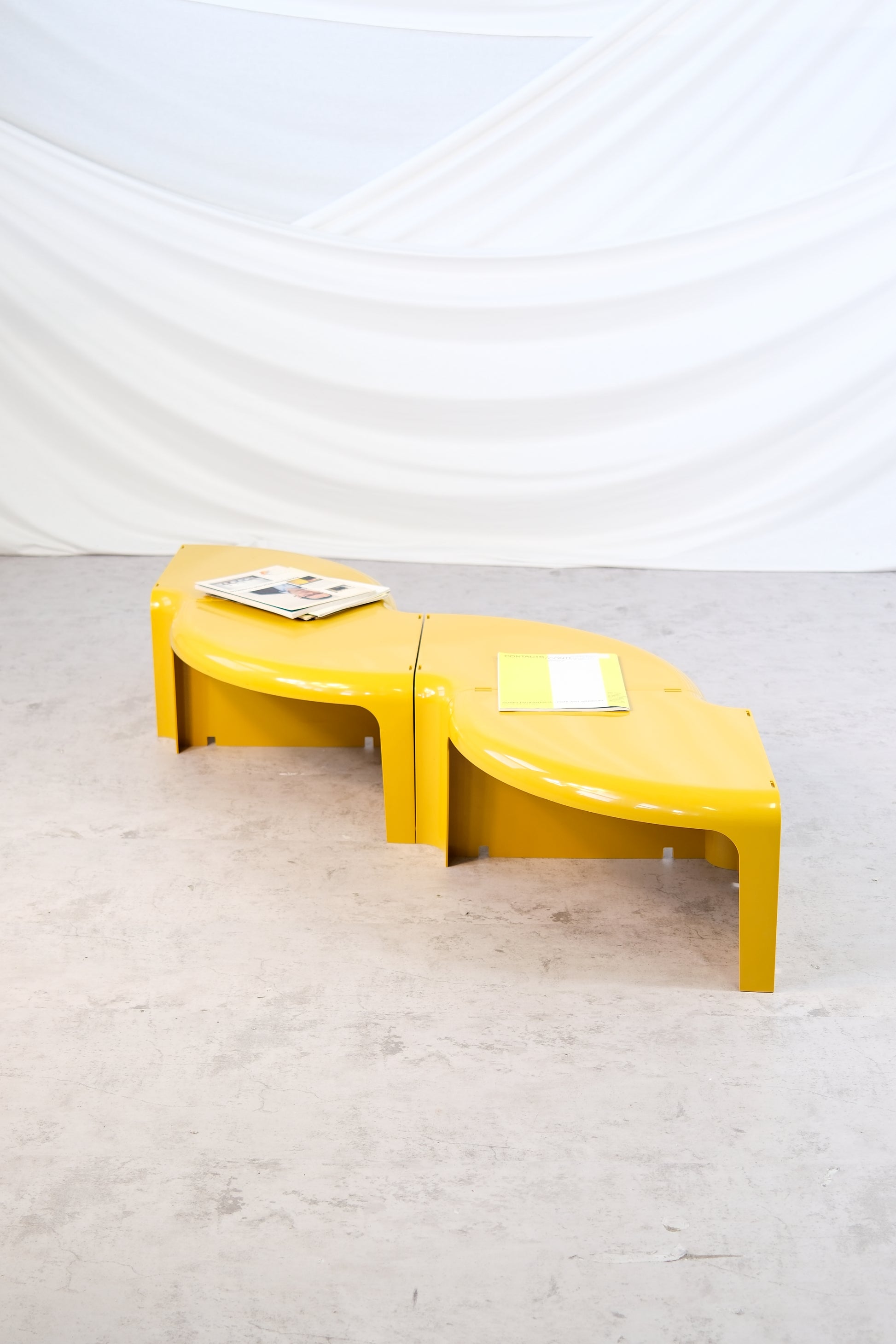 Designed in the 1960s by Italian designer Rodolfo Bonetto, the 4/4 table is a modular classic that balances playfulness with functionality. Made from durable plastic with a glossy yellow finish, the four curved elements can be combined in different ways: as a full round coffee table, separated into pairs to create side tables, or stacked vertically as a sculptural shelving unit.
