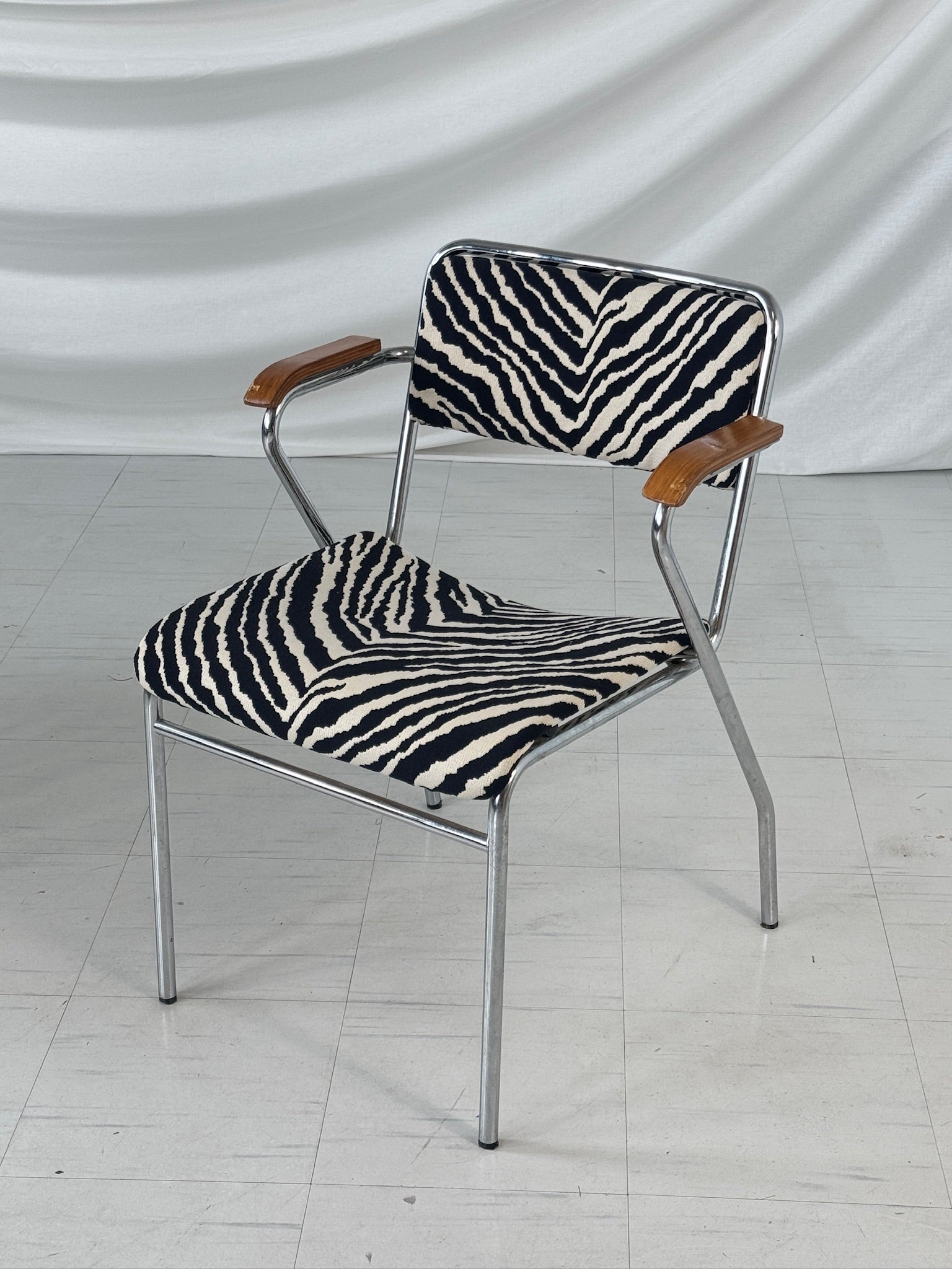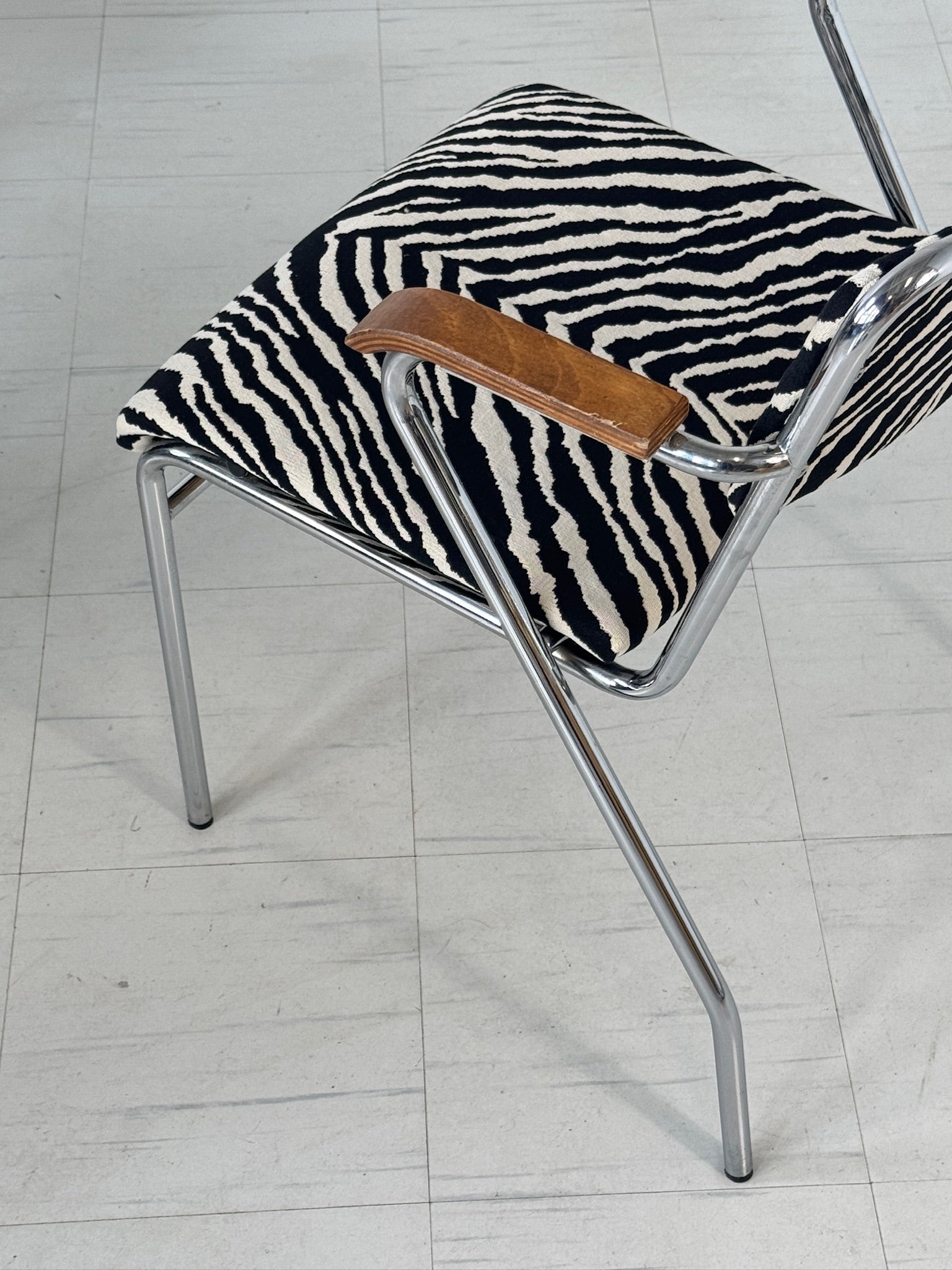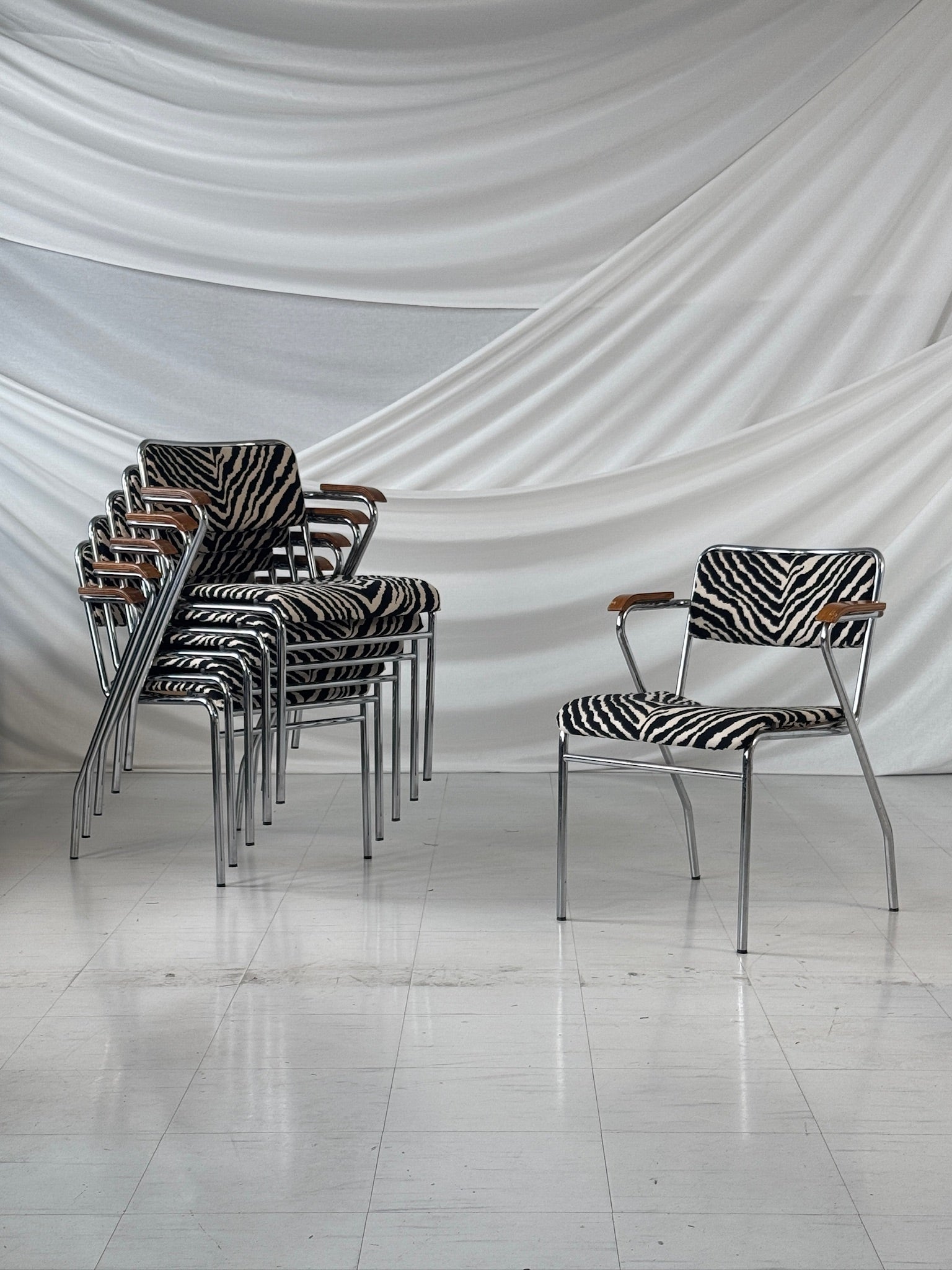 磨き上げられたスチールパイプフレーム、彫刻的な木製アームレスト、そして大胆なゼブラ柄の張地が印象的なヴィンテージチェア10脚セット。天然木、クローム、そしてグラフィックファブリックのダイナミックなコントラストが、遊び心と洗練さを兼ね備えた個性的なチェアを生み出しています。