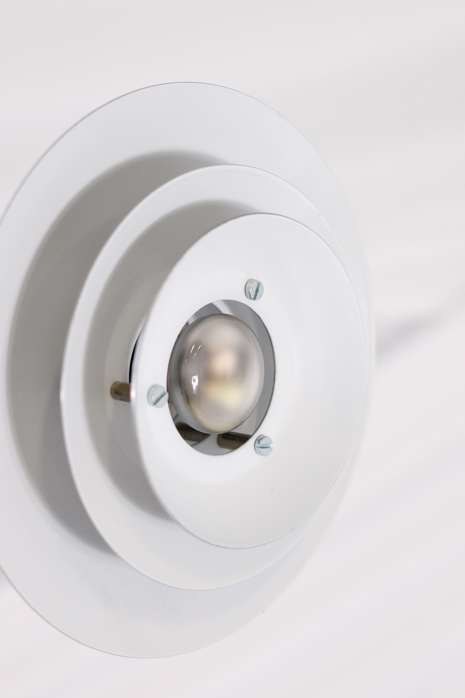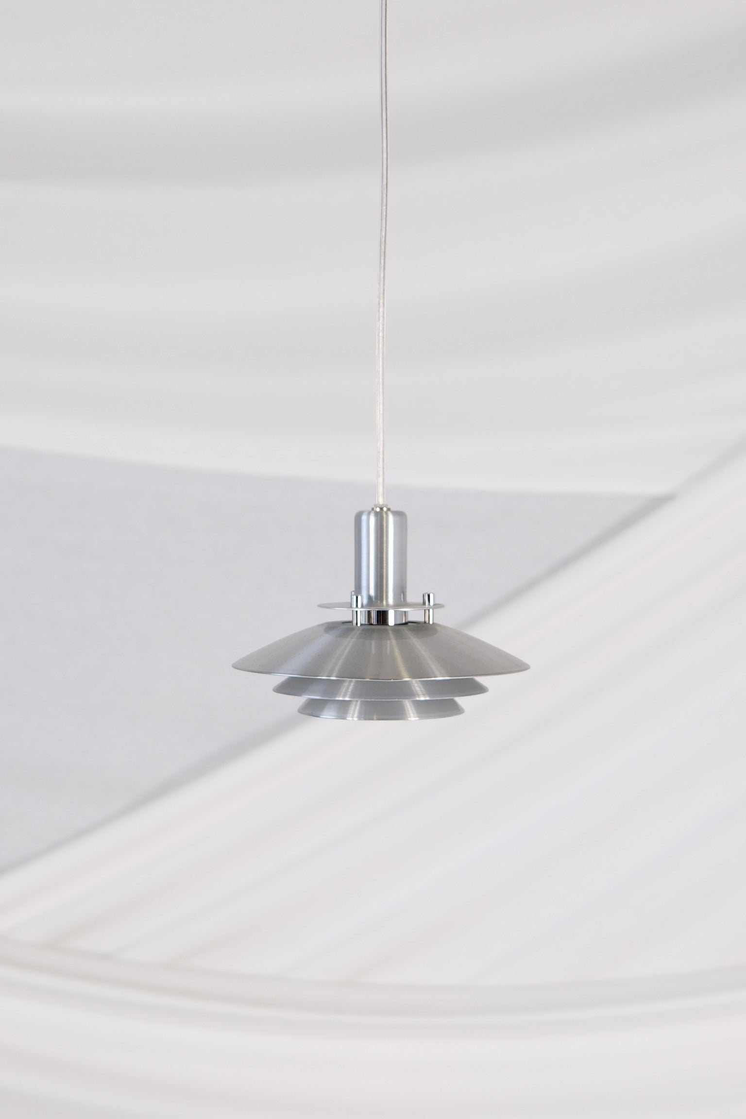 1970年代のミニマルなデンマーク製ヴィンテージペンダントランプ。重層的なクロームシェードと、すっきりとした建築的なフォルムが特徴です。コンパクトなサイズながらも印象的なフォルムは、当時のスカンジナビア・モダニズムのアプローチ、そして時代を超越した美しさを持つ機能的なデザインを反映しています。