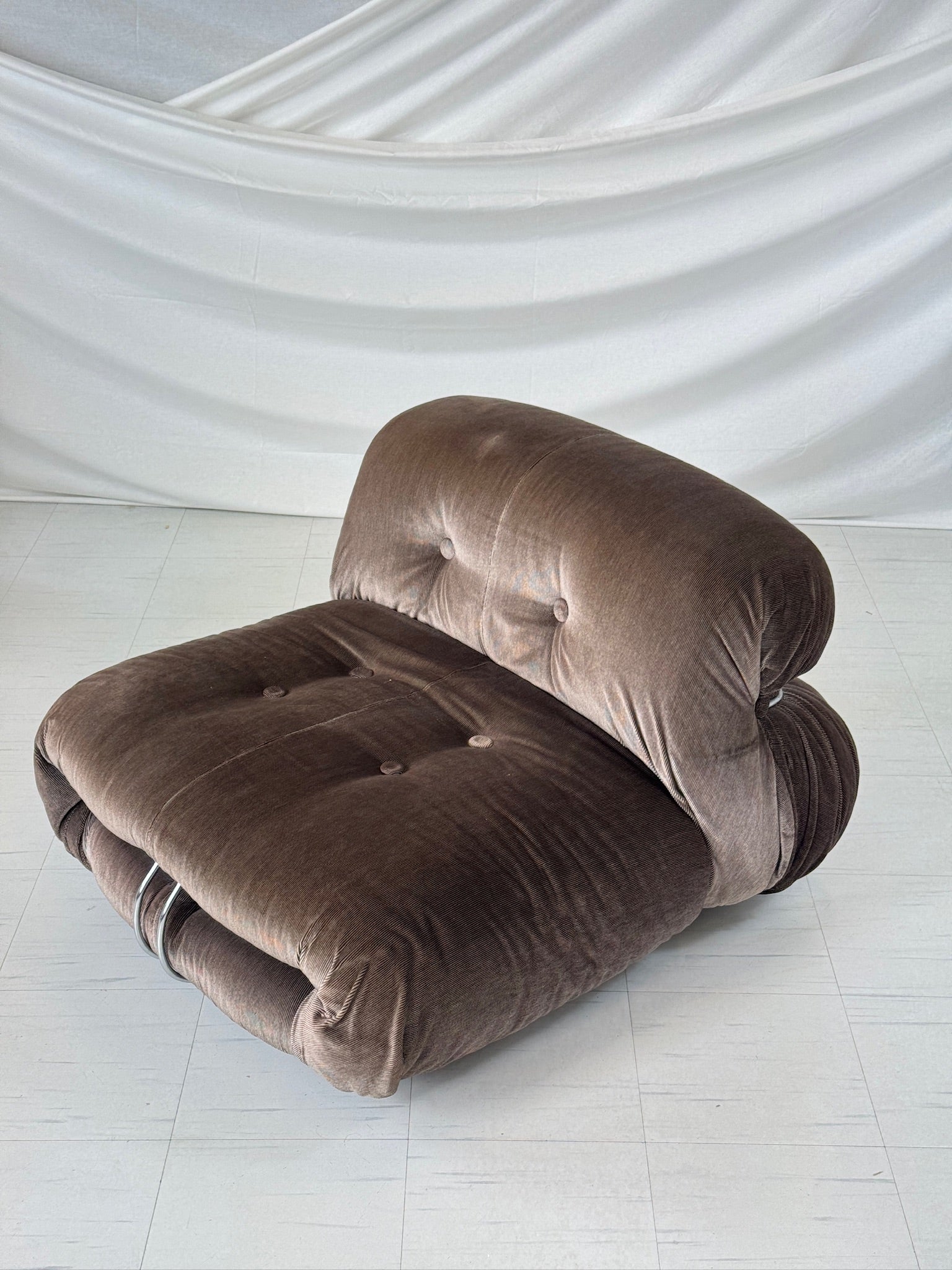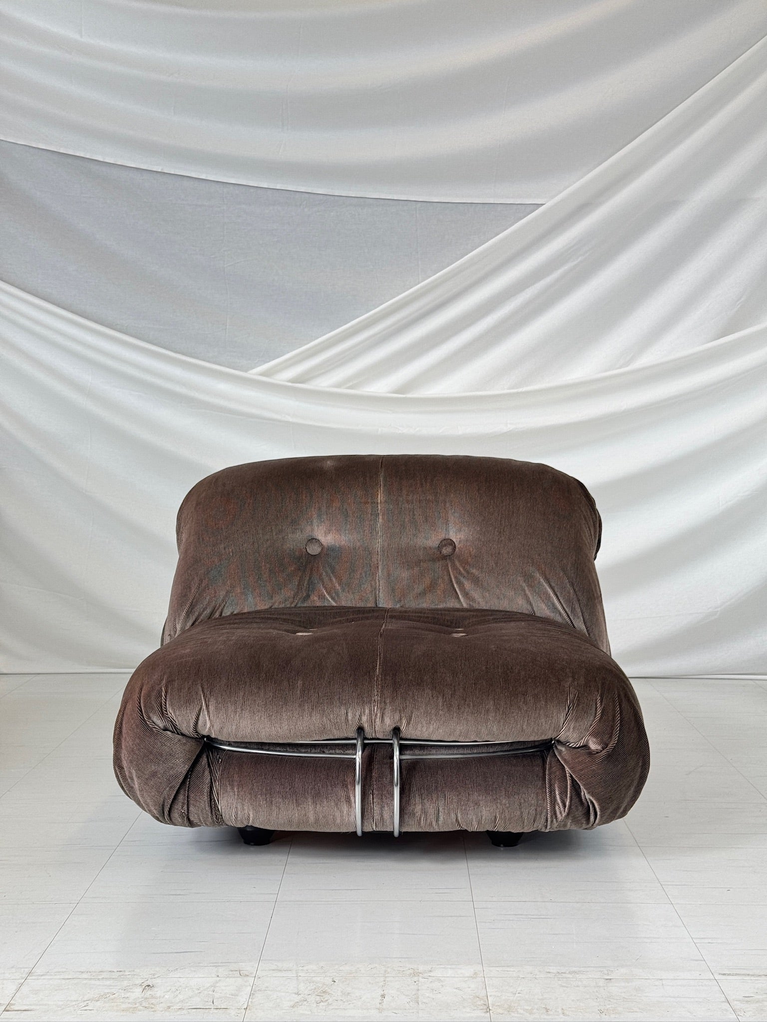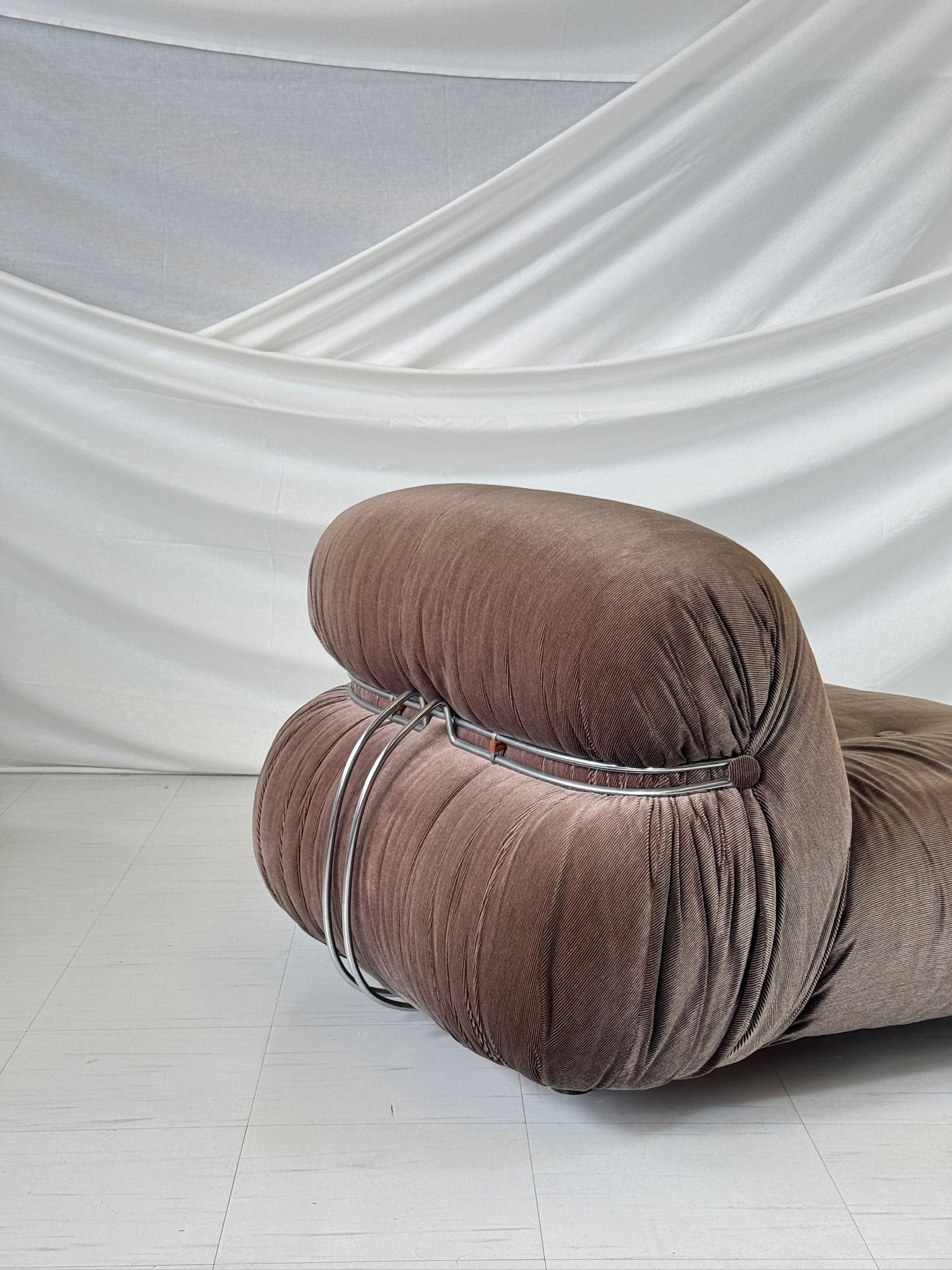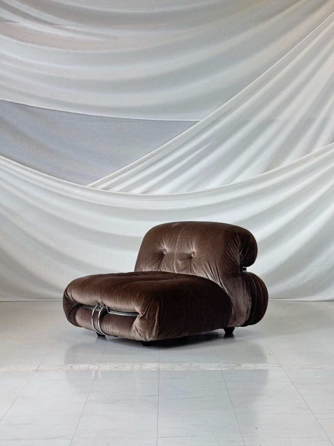 1969年にアフラ&トビア・スカルパによってデザインされたソリアナアームチェアは、イタリアのモダニズムの象徴として高く評価され、1970年に名誉あるコンパッソ・ドーロ賞を受賞しました。そのユニークな構造は、外側のクロームフレームで包まれた、ふかふかの雲のようなクッションで、彫刻的な優雅さとゆったりとした座り心地が融合されています。