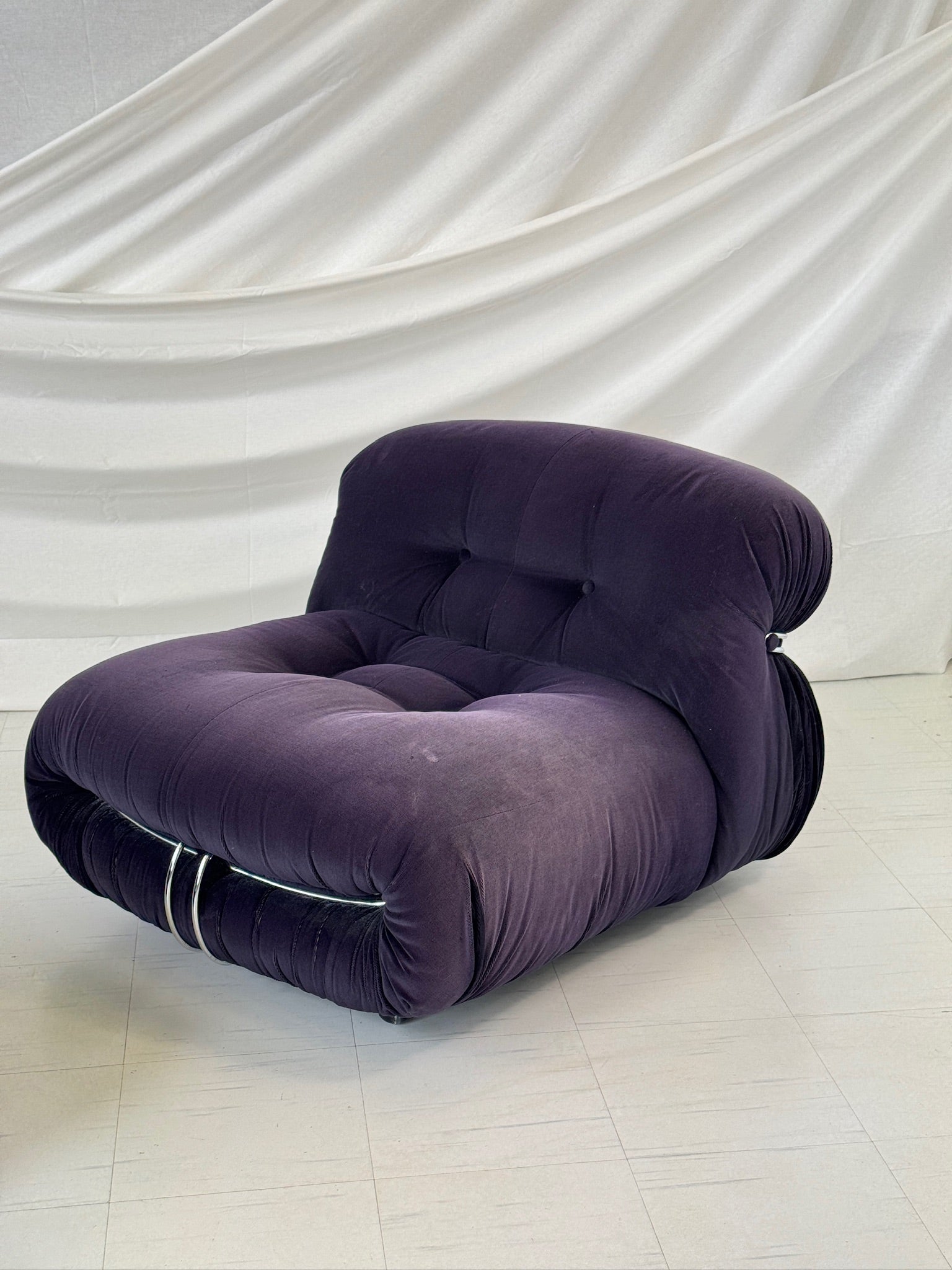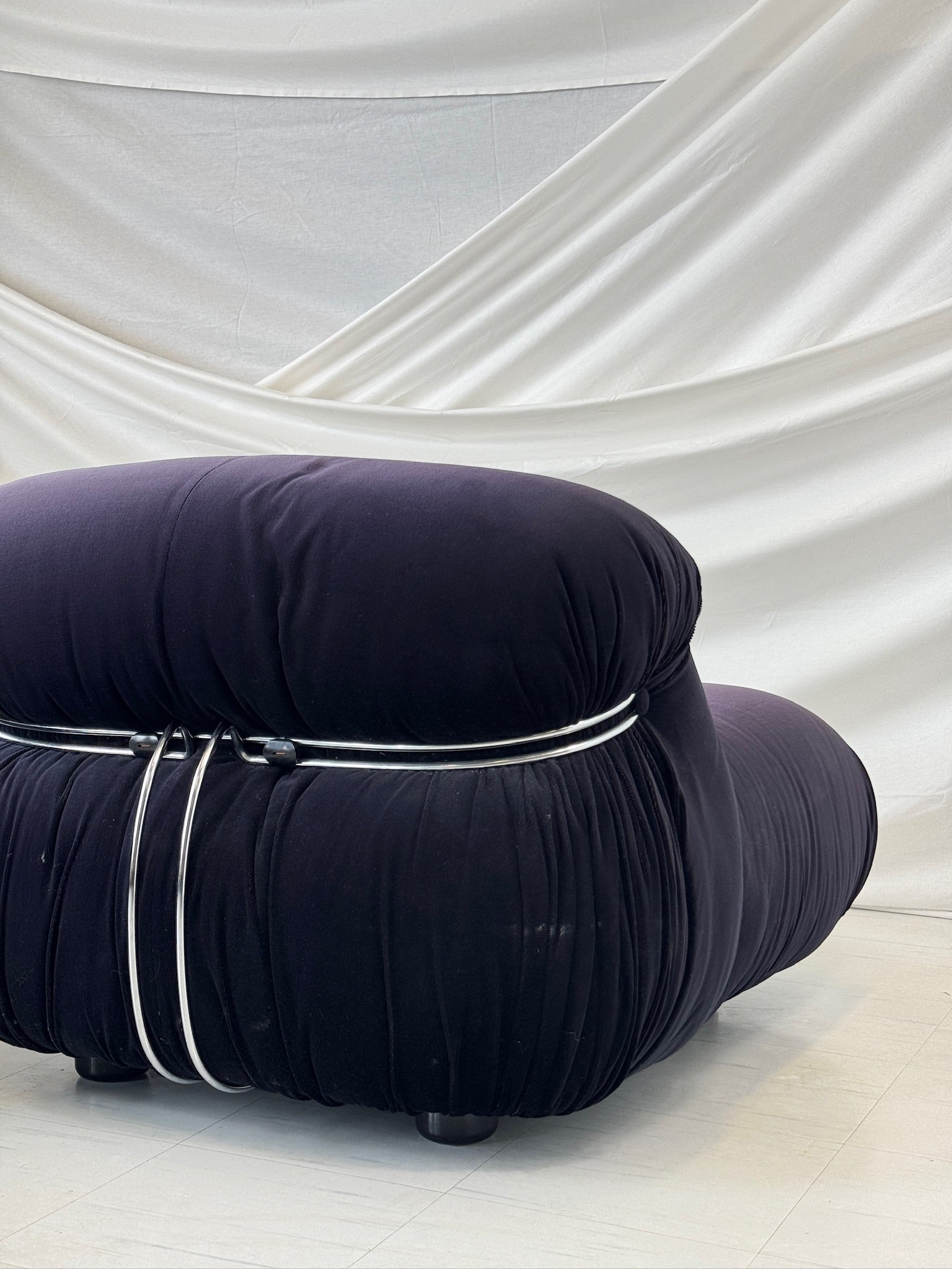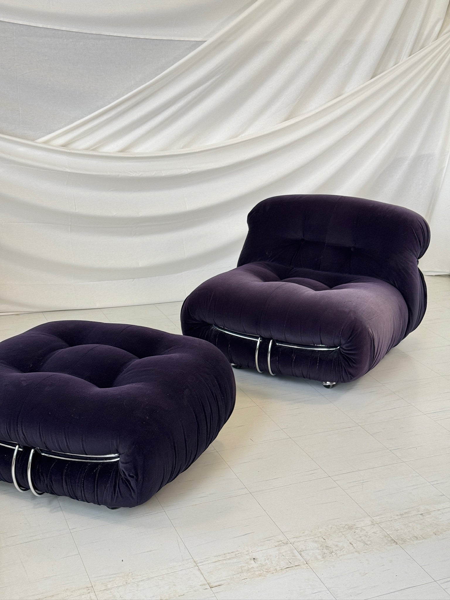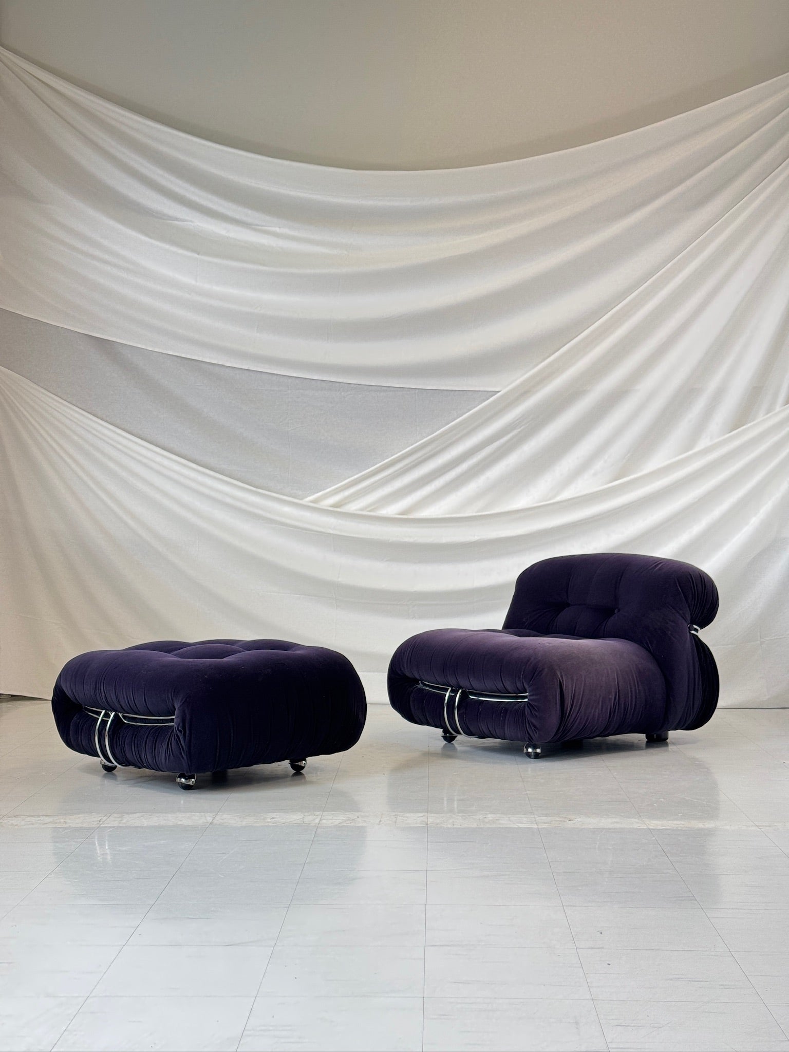1969年に著名なアフラ&トビア・スカルパによってデザインされた「ソリアナ」アームチェアとオットマンは、イタリアン・モダニズムの象徴です。彫刻的なフォルム、つまり雲のような柔らかなクッションは、磨かれたクロームの留め具で締め付けられ、座る人を贅沢な快適さで包み込みます。1970年に権威あるコンパッソ・ドーロ賞を受賞したこのデザインは、当時の革新的な精神を今もなお証明しています。