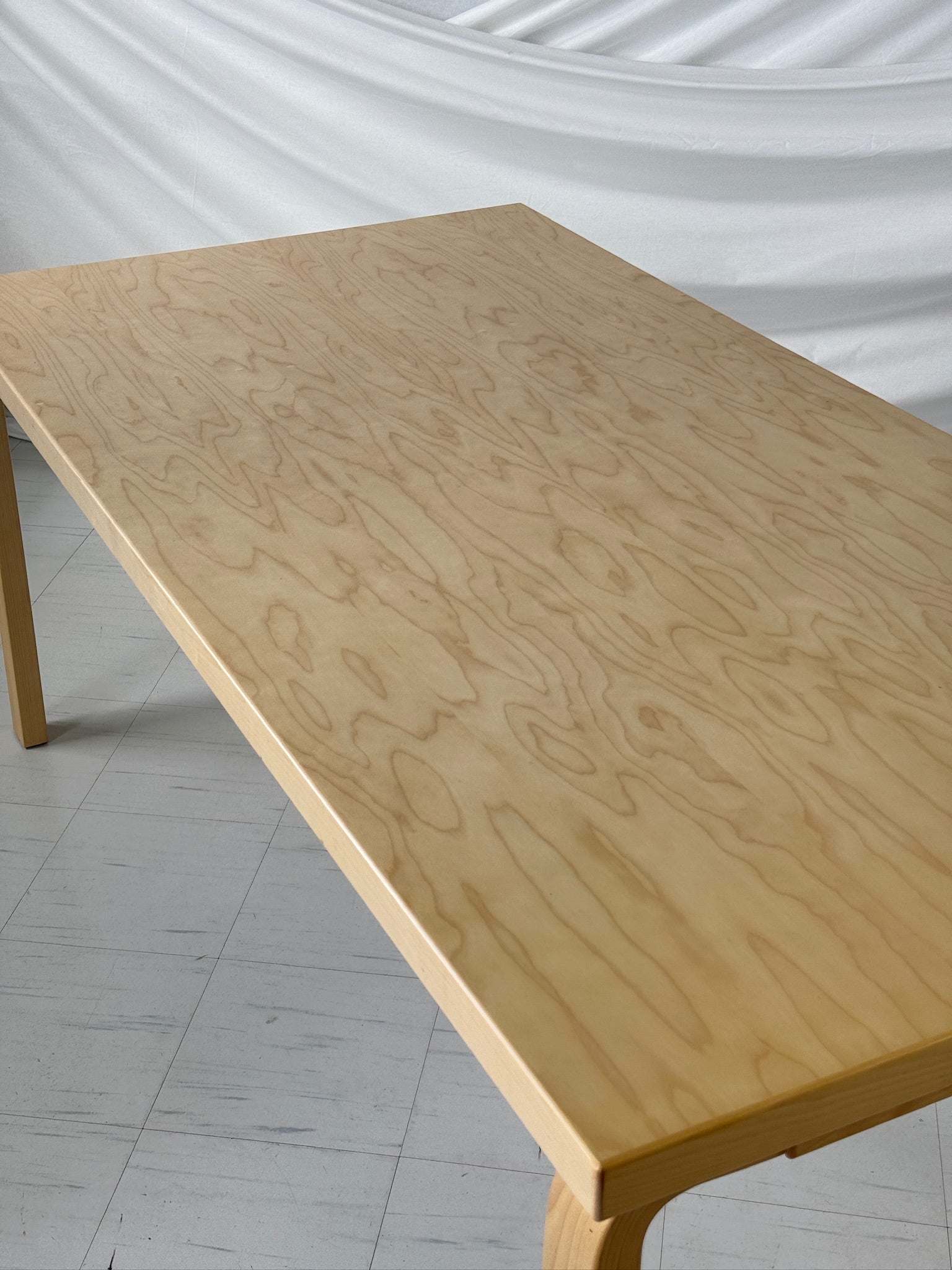 1935年にアルヴァ・アアルトによってデザインされたテーブル83は、機能的なフィンランドデザインを象徴する、時代を超えた逸品です。このアニバーサリーエディションは、アルテックのブランド創立80周年を記念して制作され、希少な「ロイムコイヴ」(カーリーバーチ)の突板が使用されています。ロイムコイヴは、豊かな波打つ木目が特徴の、フィンランドで非常に人気の高い木材です。