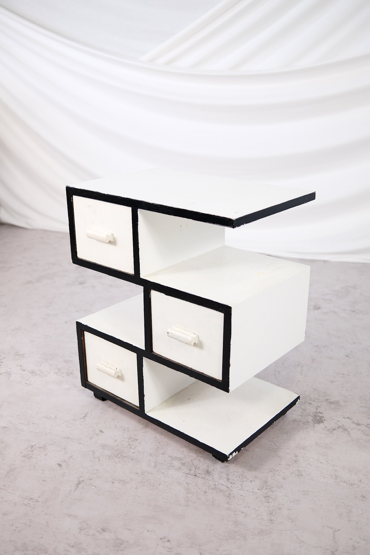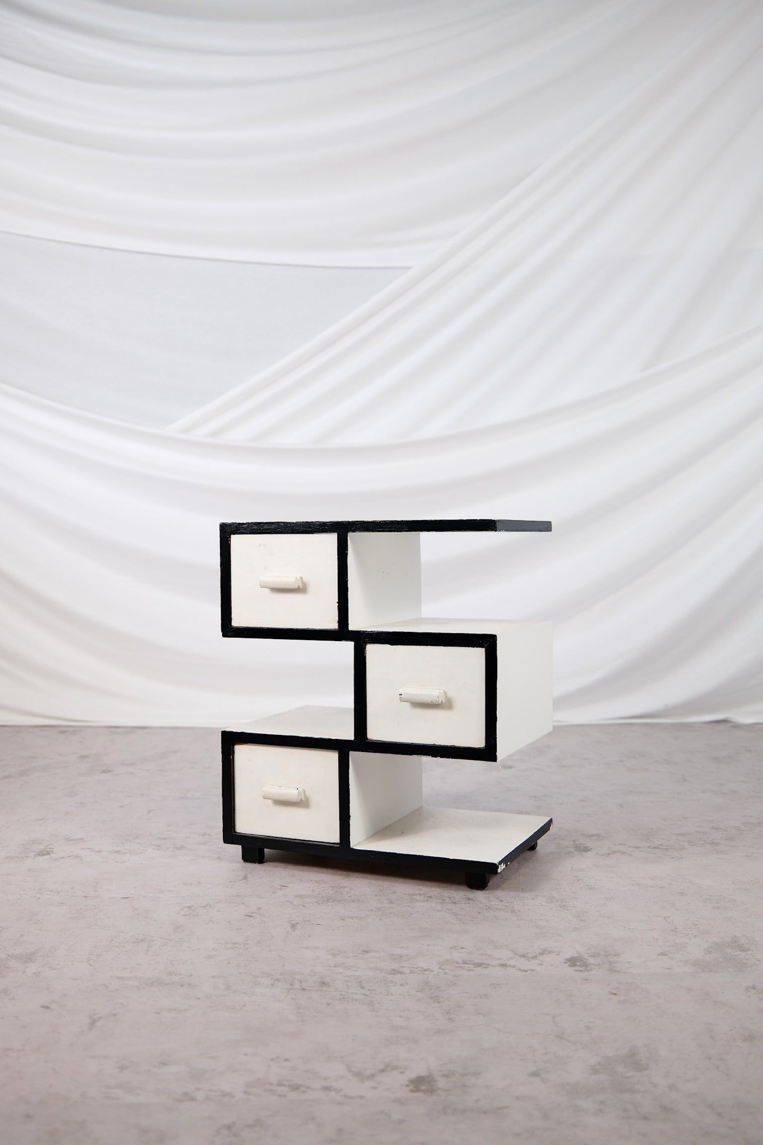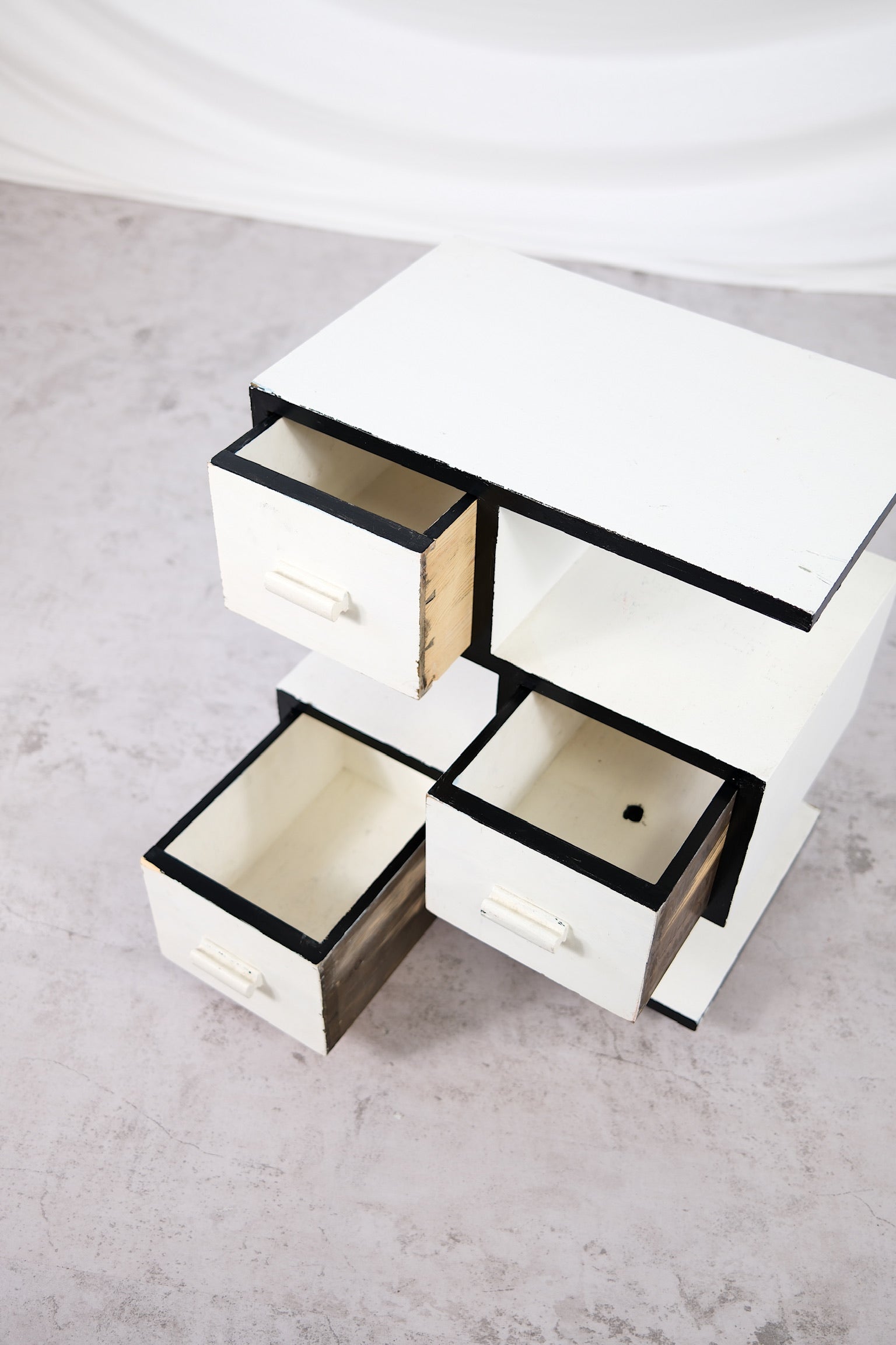 ミッコ・ヌッポネンがデザインした、希少で個性的な収納キャビネット。フィンランドで手作りされたこのキャビネットは、彫刻的なS字型の構造と、ミニマルな取っ手が付いた4つの引き出しが特徴的です。ナイトスタンド、サイドテーブル、あるいは様々なインテリアの個性的な収納ユニットとして、多用途にお使いいただけます。