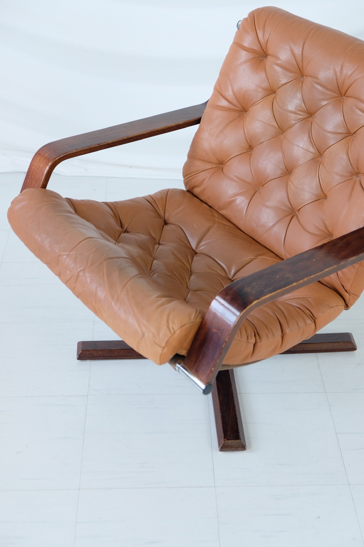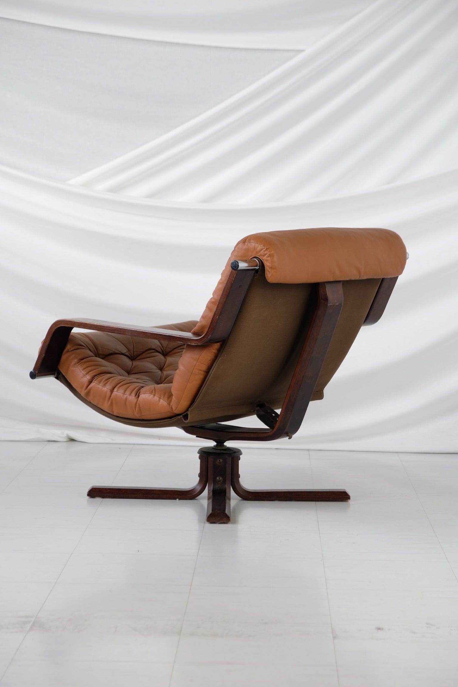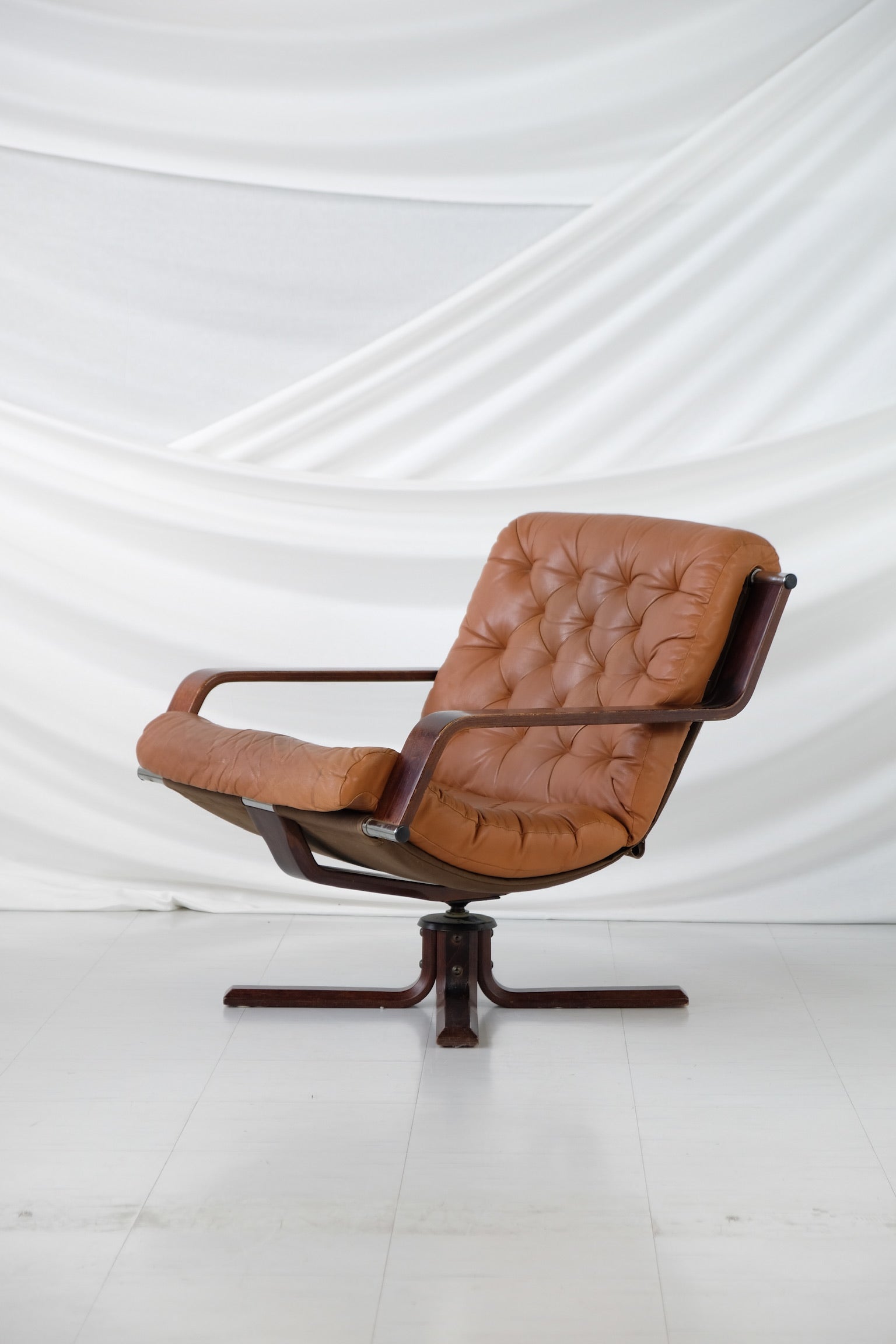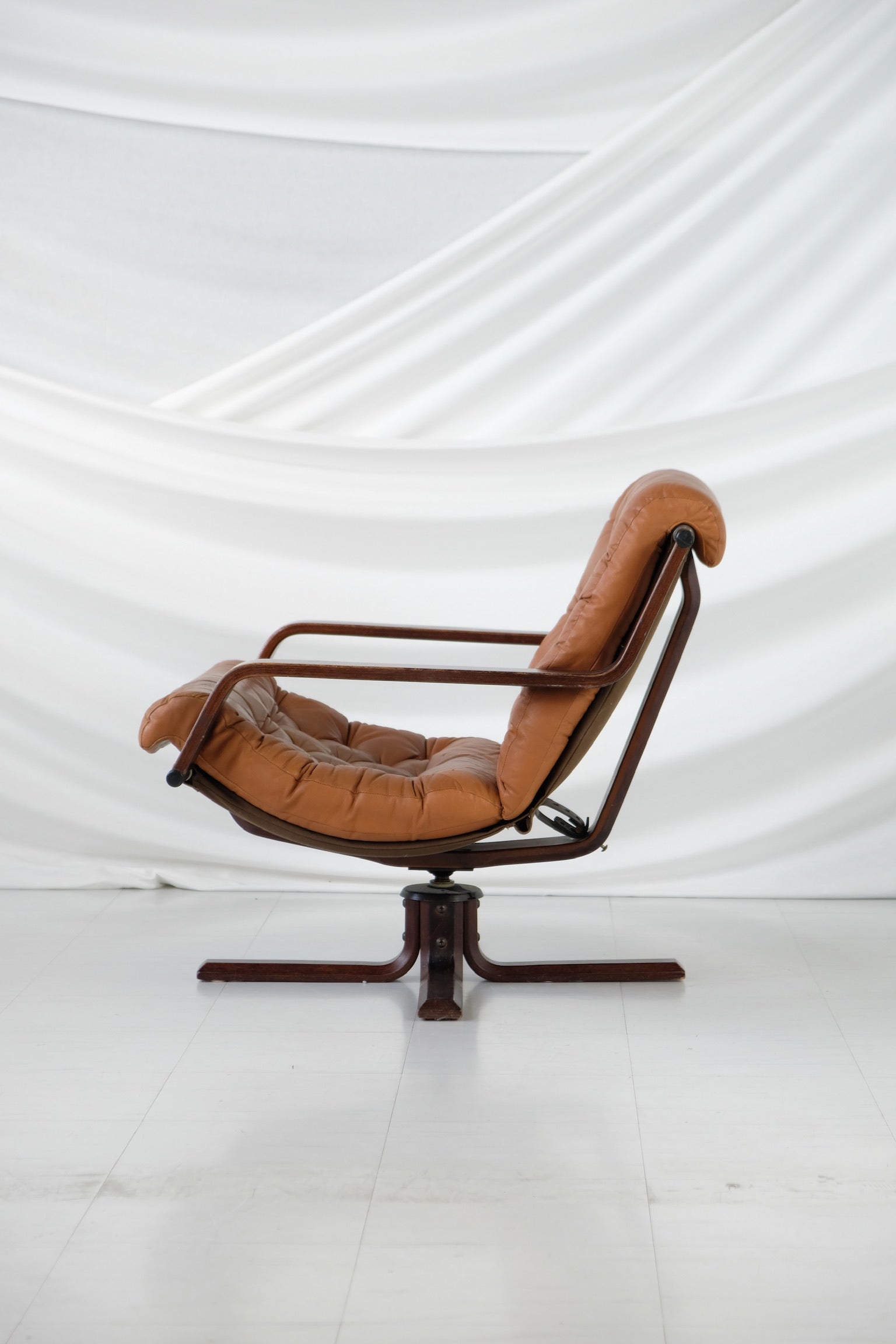 エレガント ノルウェー、ヴァトネ・モブラー社製の1970年代製回転ラウンジチェア。温かみのあるステイン仕上げの彫刻的な曲げ木フレームに、取り外し可能なコニャック色の贅沢なレザークッションがセットされています。深いボタンタフティングが施されています。職人技と快適さで知られるヴァトネ・モブラー社の製品は、北欧デザインの定番として人気を博しています。回転ベースは機能性と時代を超越したスタイルを兼ね備え、リビングルーム、オフィス、読書コーナーなどに最適です。