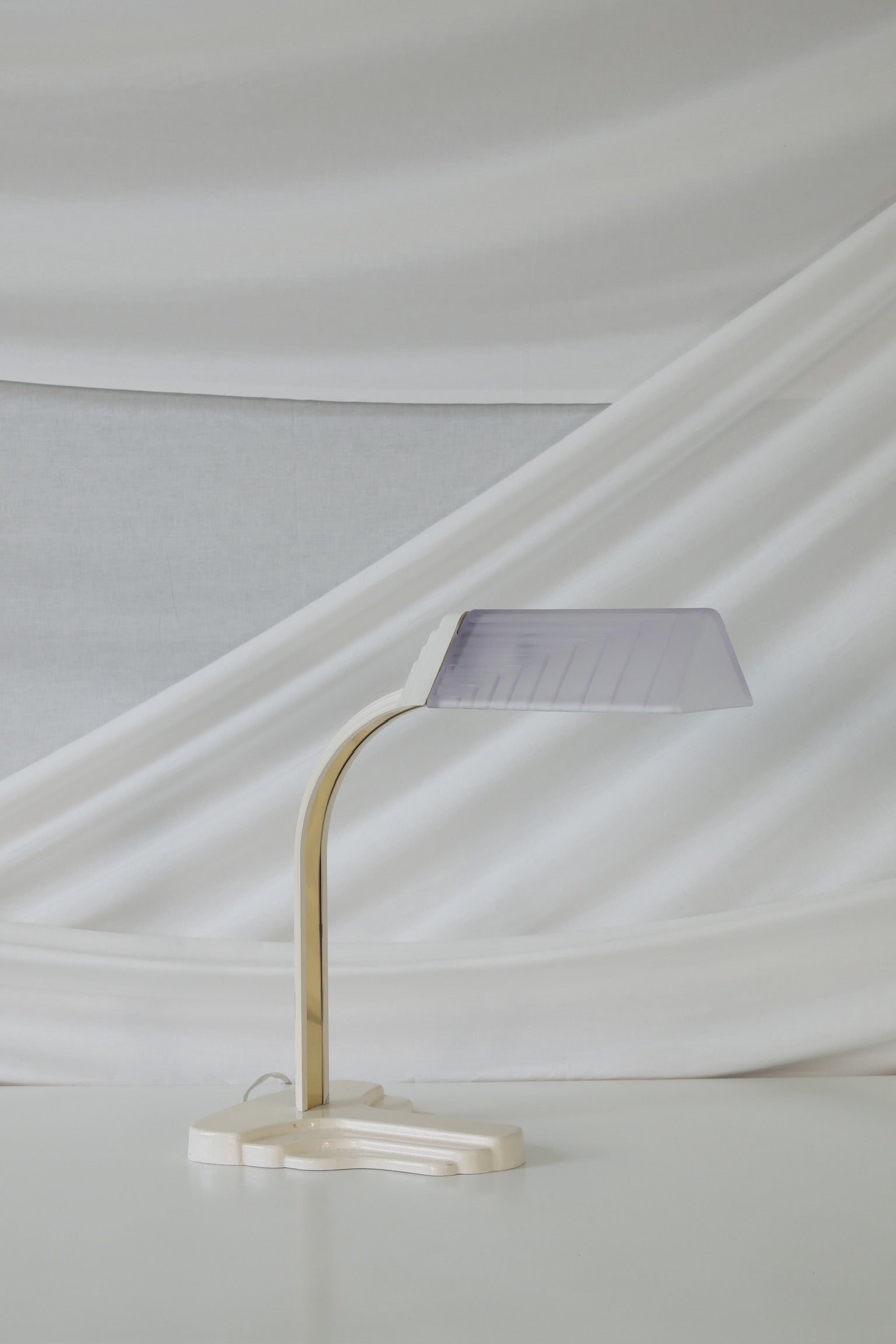 ヴィンテージ品としては良好なコンディションで、経年によるわずかな摩耗が見られます。ガラスシェードは清潔で無傷、鋳鉄製のベースは良好な状態を保っています。完全に機能します。詳細については、詳細な写真をご請求ください。