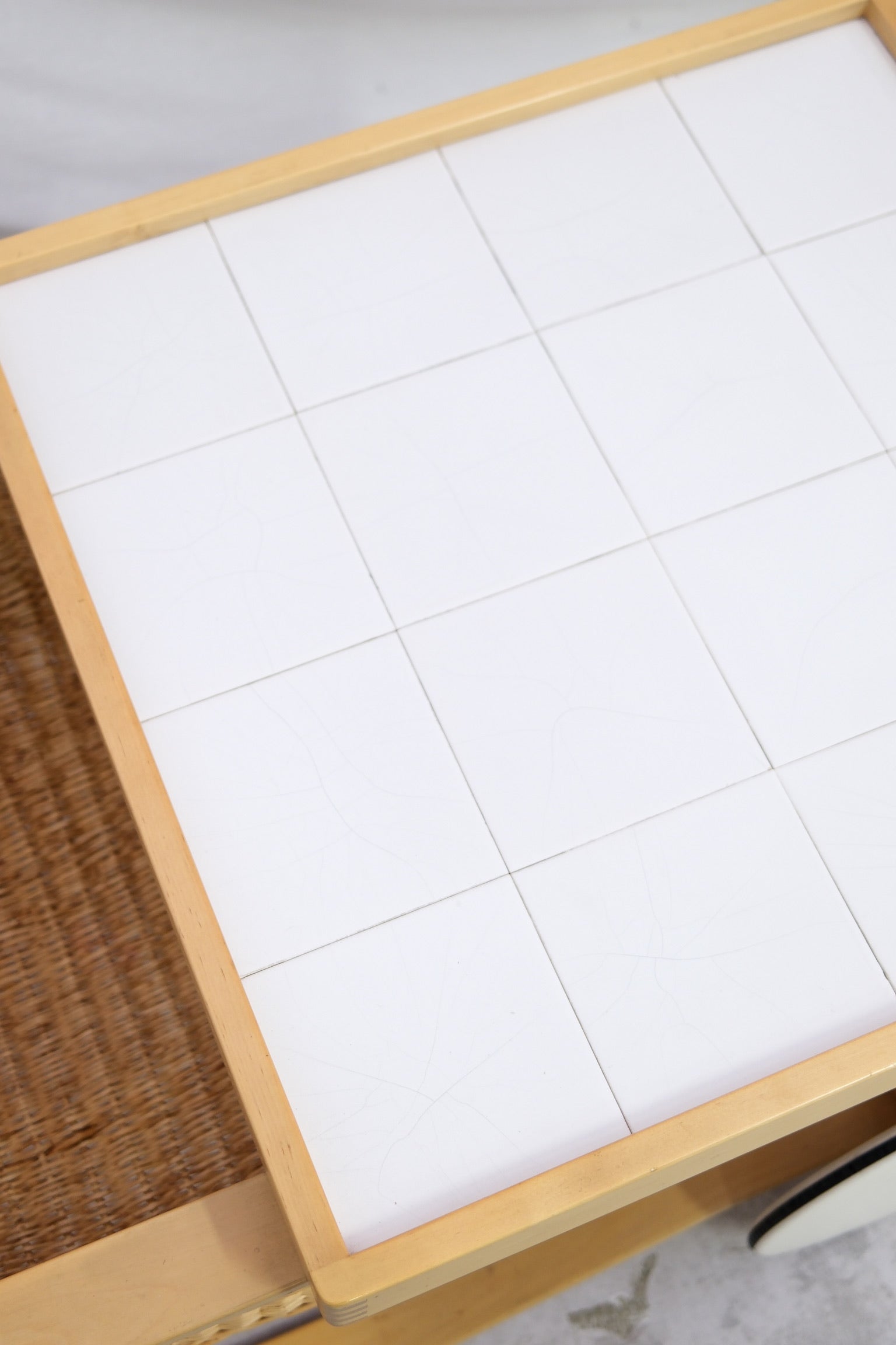 This example features a birch frame with white ceramic tiles on the top surface and a woven rattan basket underneath for storage. The large wheels and curved handle make it easy to move and versatile in use. It works beautifully as a bar trolley, side table, or mobile storage piece.