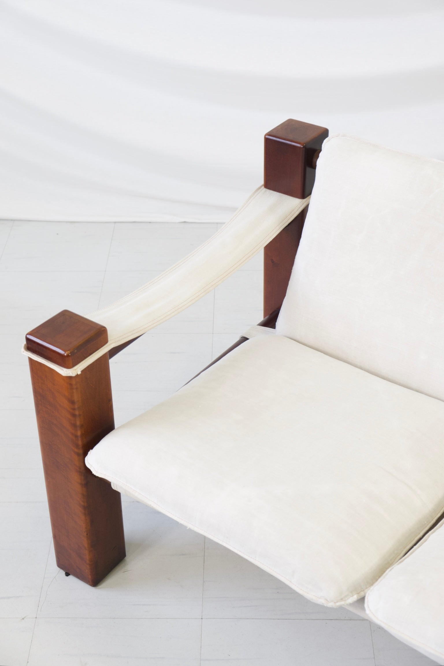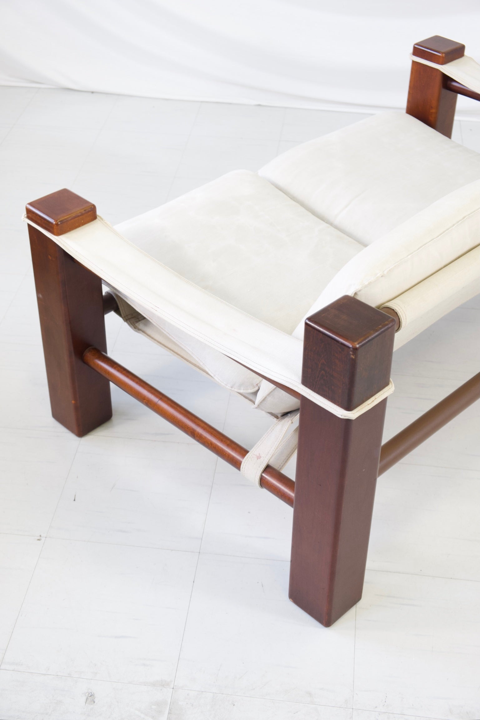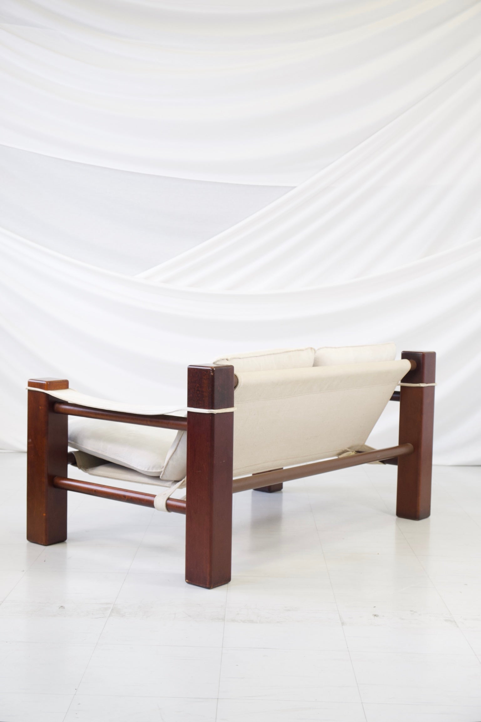 1970年代の彫刻的なヴィンテージサファリソファ。ブラジルのモダニズムデザインにインスパイアされたデザインです。大胆な建築的ラインを描く無垢のステインウッドフレームに、天然リネンのスリングシート、背もたれ、アームレストを組み合わせました。ゆったりとしたリネンのクッションが、力強く構造的なフレームに快適さとリラックス感を添えています。