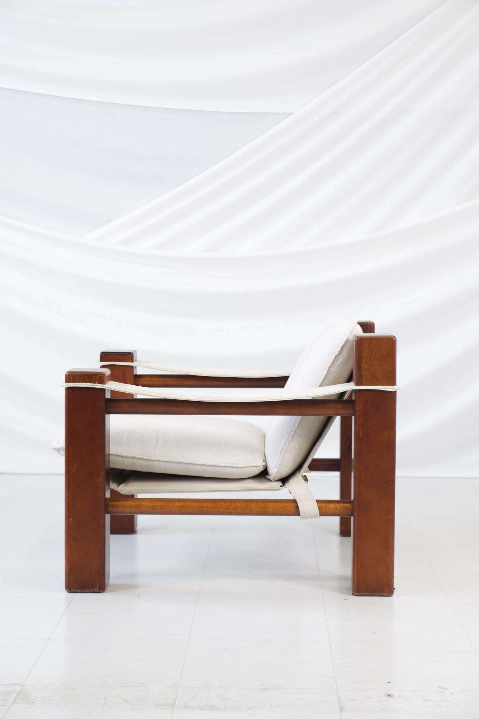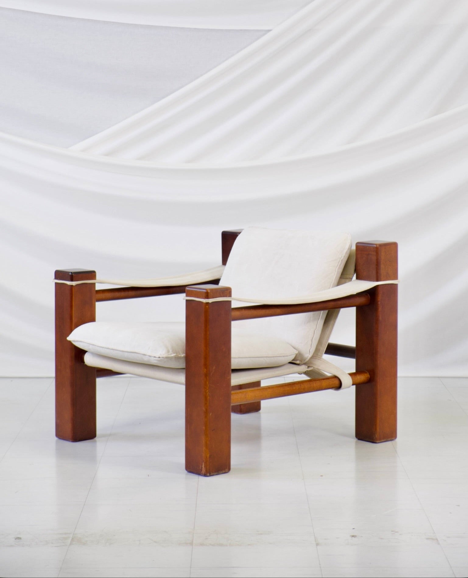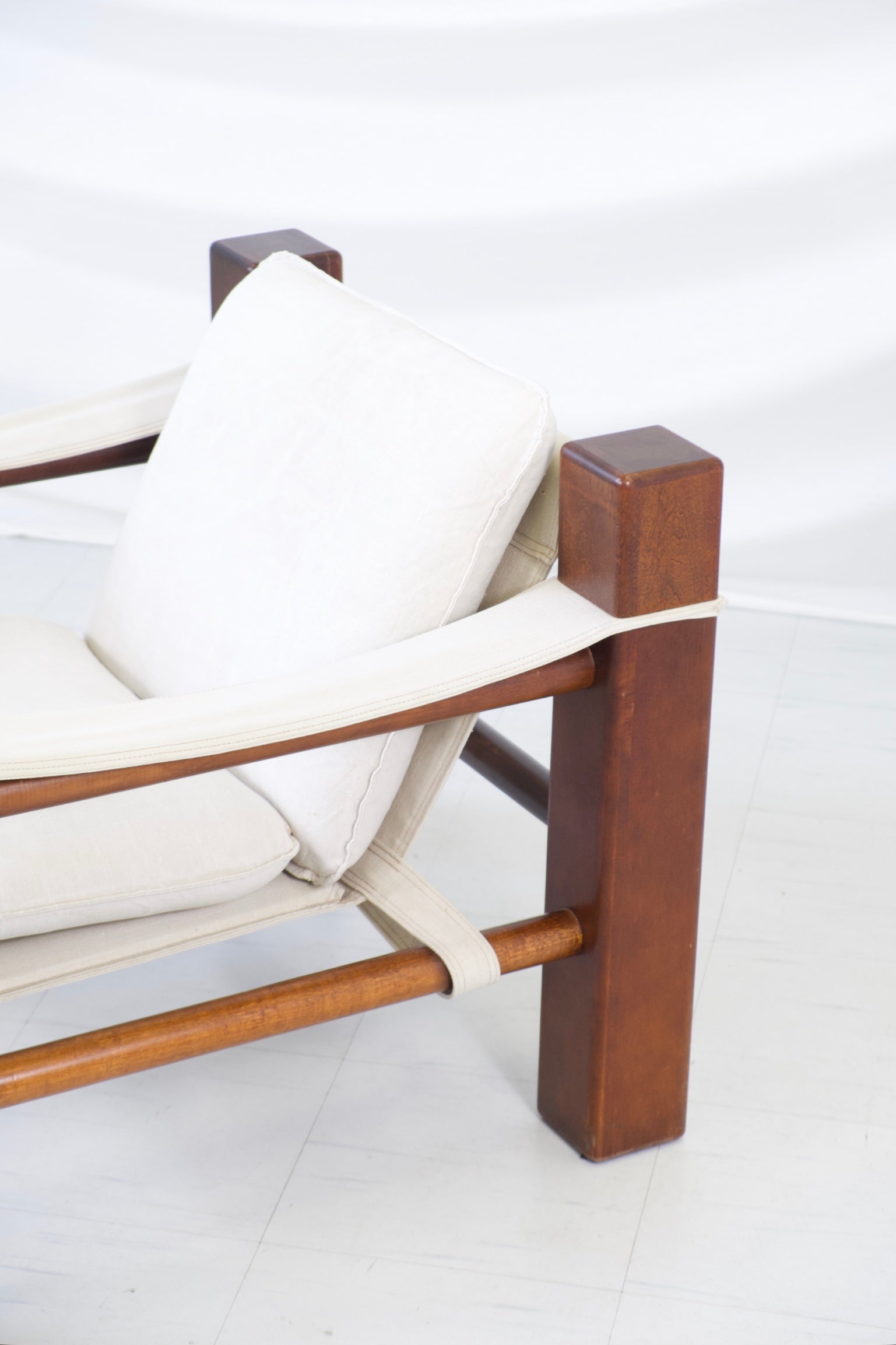 1970年代の彫刻的なヴィンテージサファリアームチェア。ブラジルのモダニズムデザインにインスパイアされたデザインです。大胆な建築的ラインを描く無垢のステインウッドフレームに、天然リネンのスリングシート、背もたれ、アームレストが組み合わされています。ゆったりとしたリネンのクッションが、力強く構造的なフレームに快適さとリラックス感を添えています。