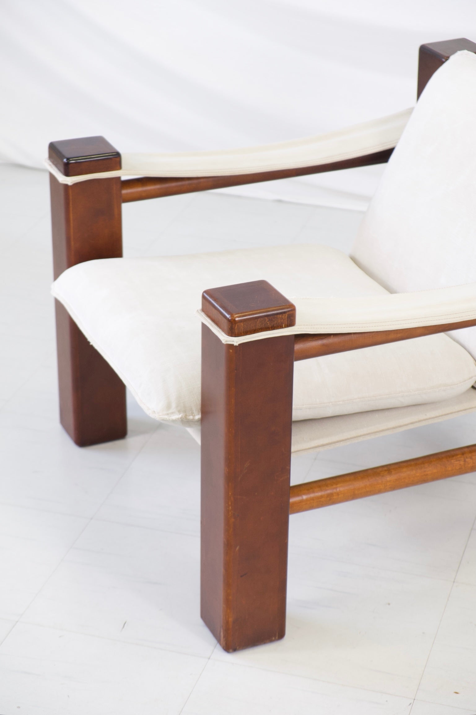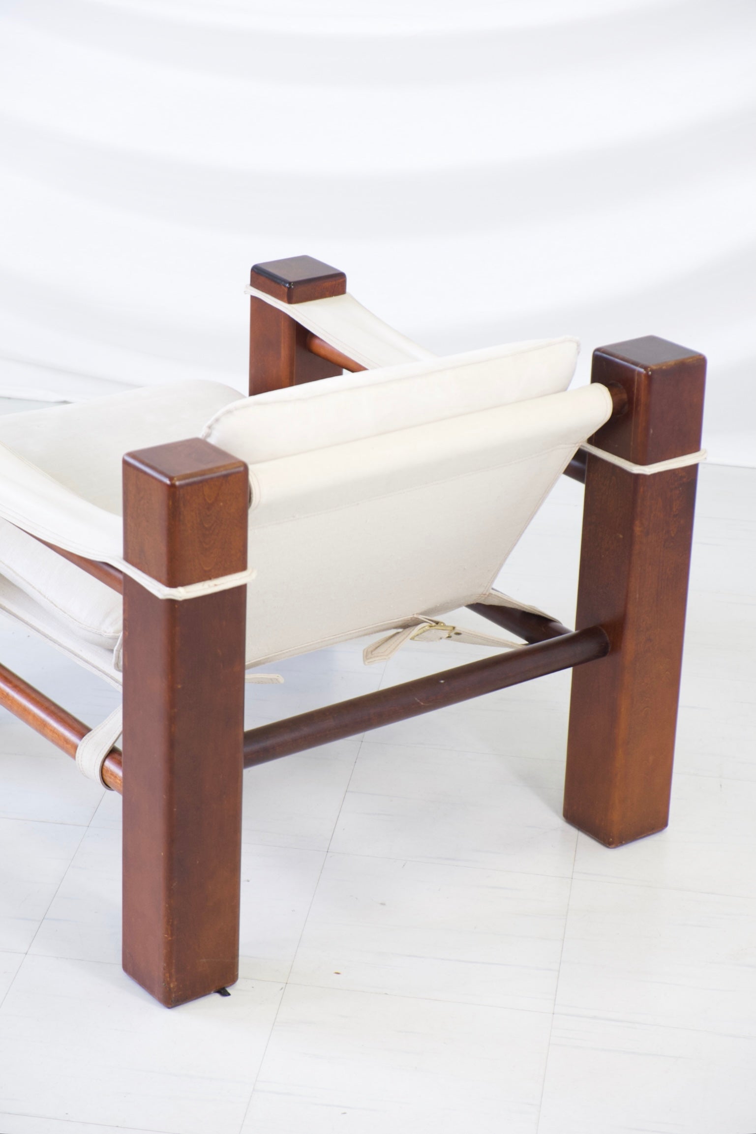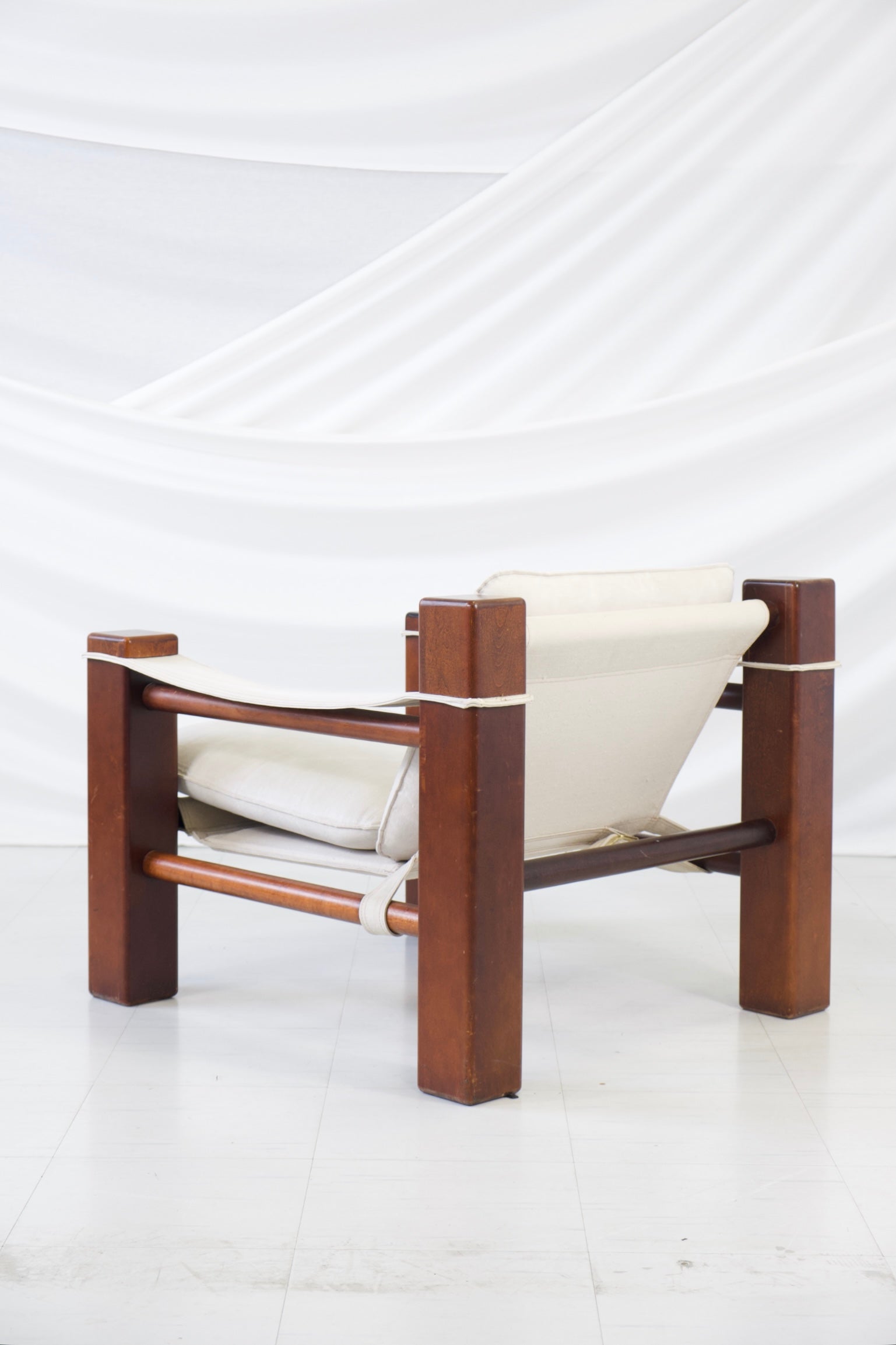 1970年代の彫刻的なヴィンテージサファリアームチェア。ブラジルのモダニズムデザインにインスパイアされたデザインです。大胆な建築的ラインを描く無垢のステインウッドフレームに、天然リネンのスリングシート、背もたれ、アームレストが組み合わされています。ゆったりとしたリネンのクッションが、力強く構造的なフレームに快適さとリラックス感を添えています。