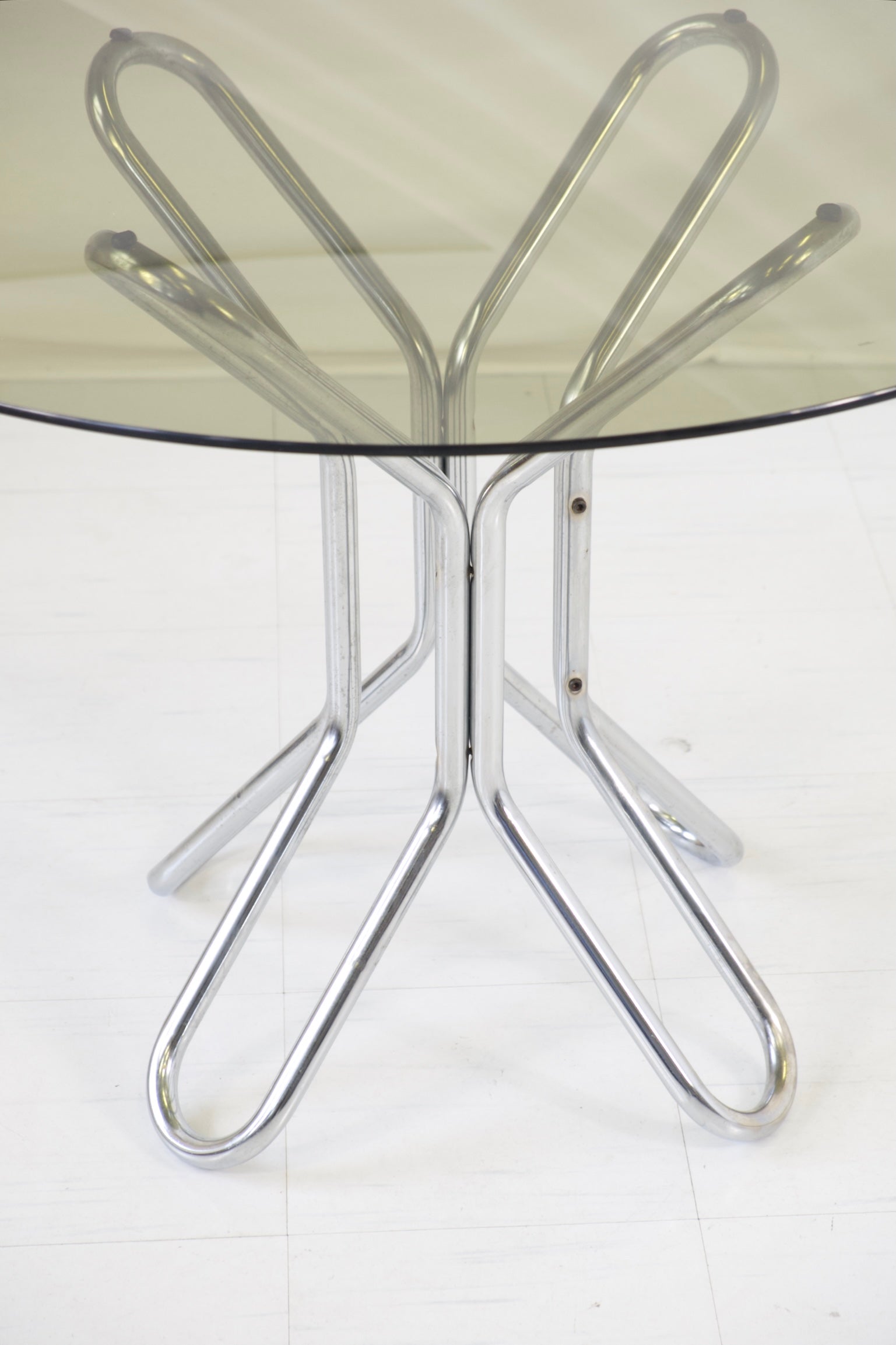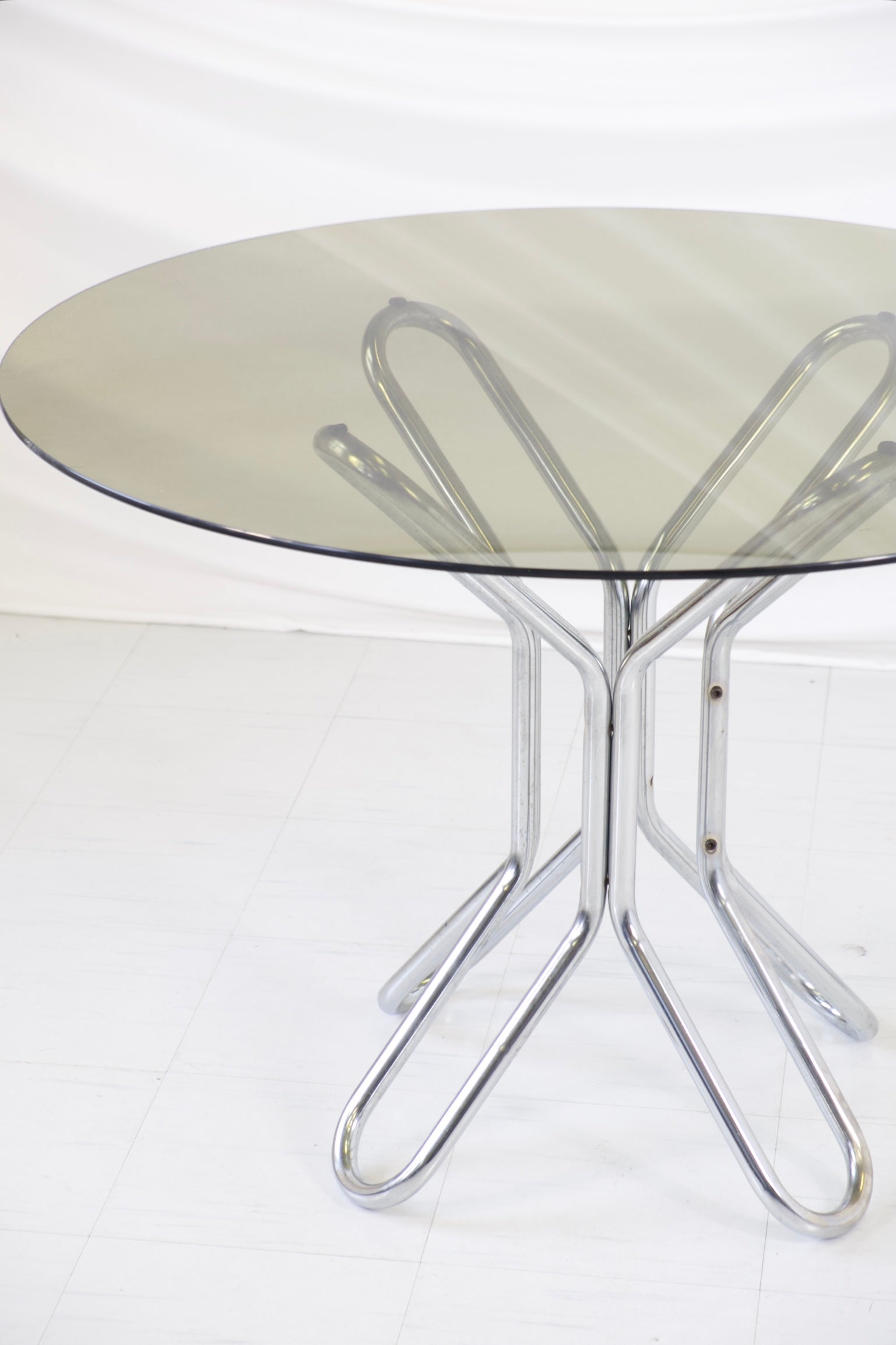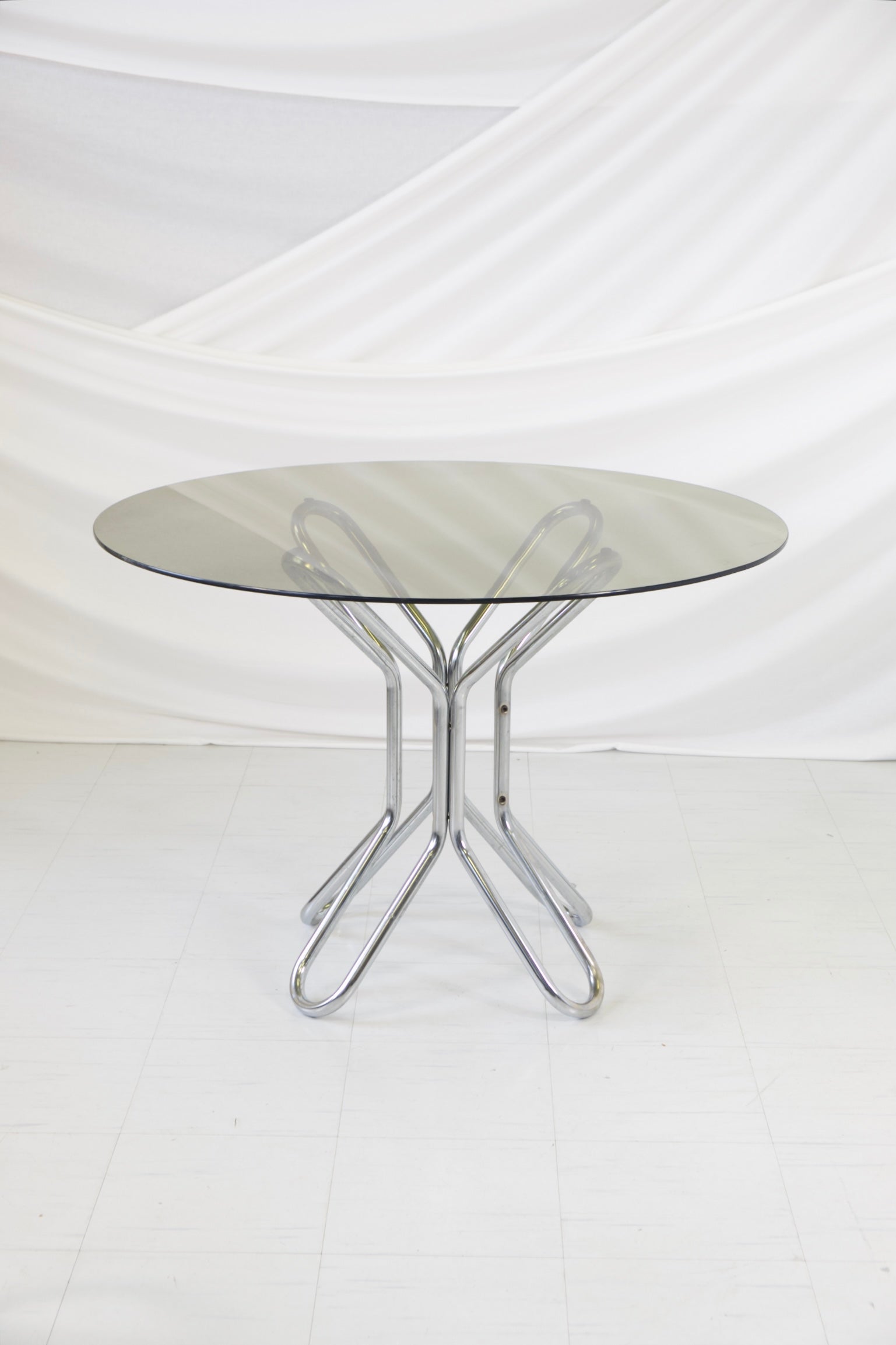 彫刻的なクロームメッキのスチールパイプベースとスモークガラスの天板を備えた円形ダイニングテーブル。絡み合うベースが印象的な建築的なシルエットを生み出し、機能性と芸術性を兼ね備えた作品です。