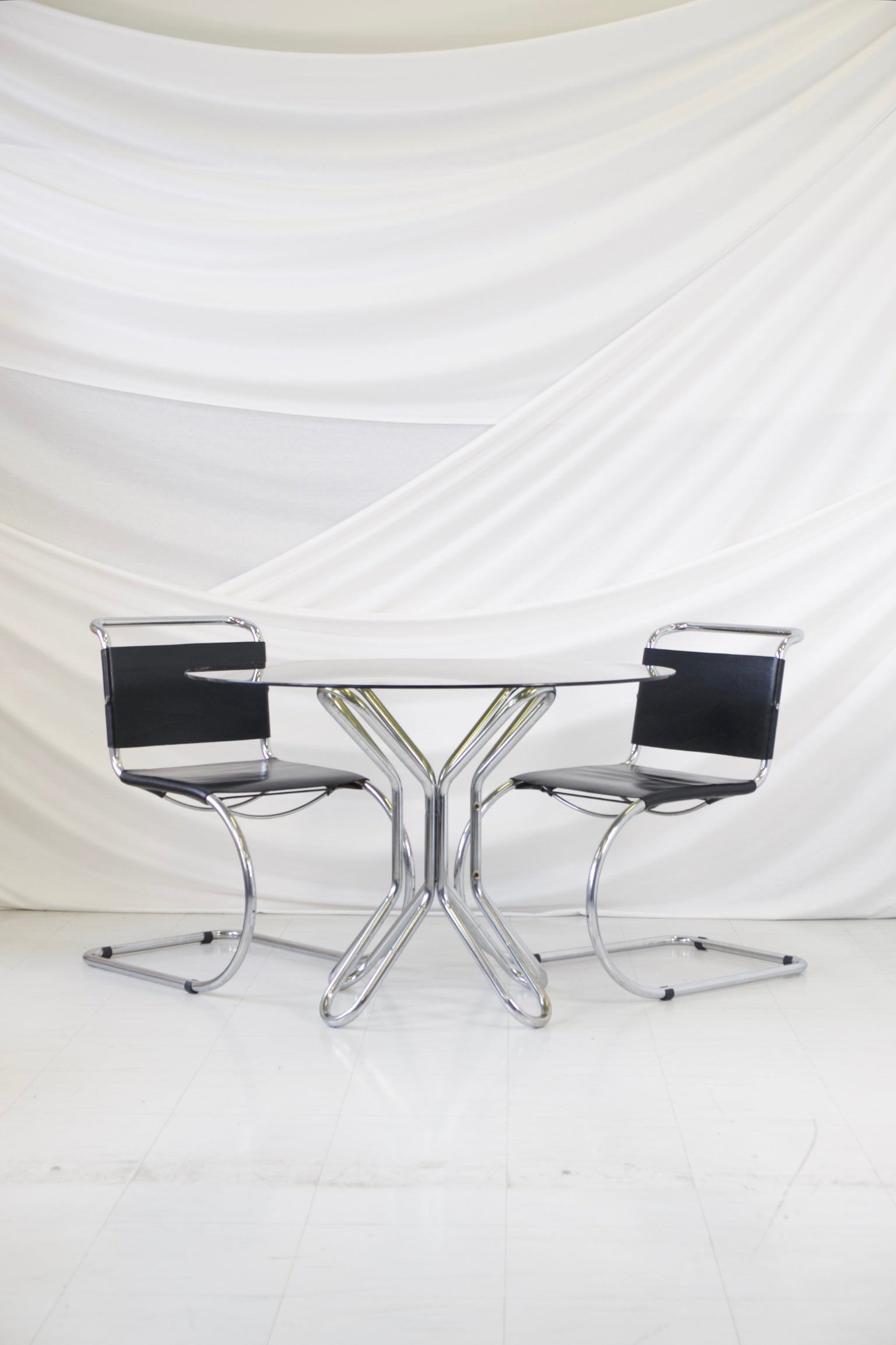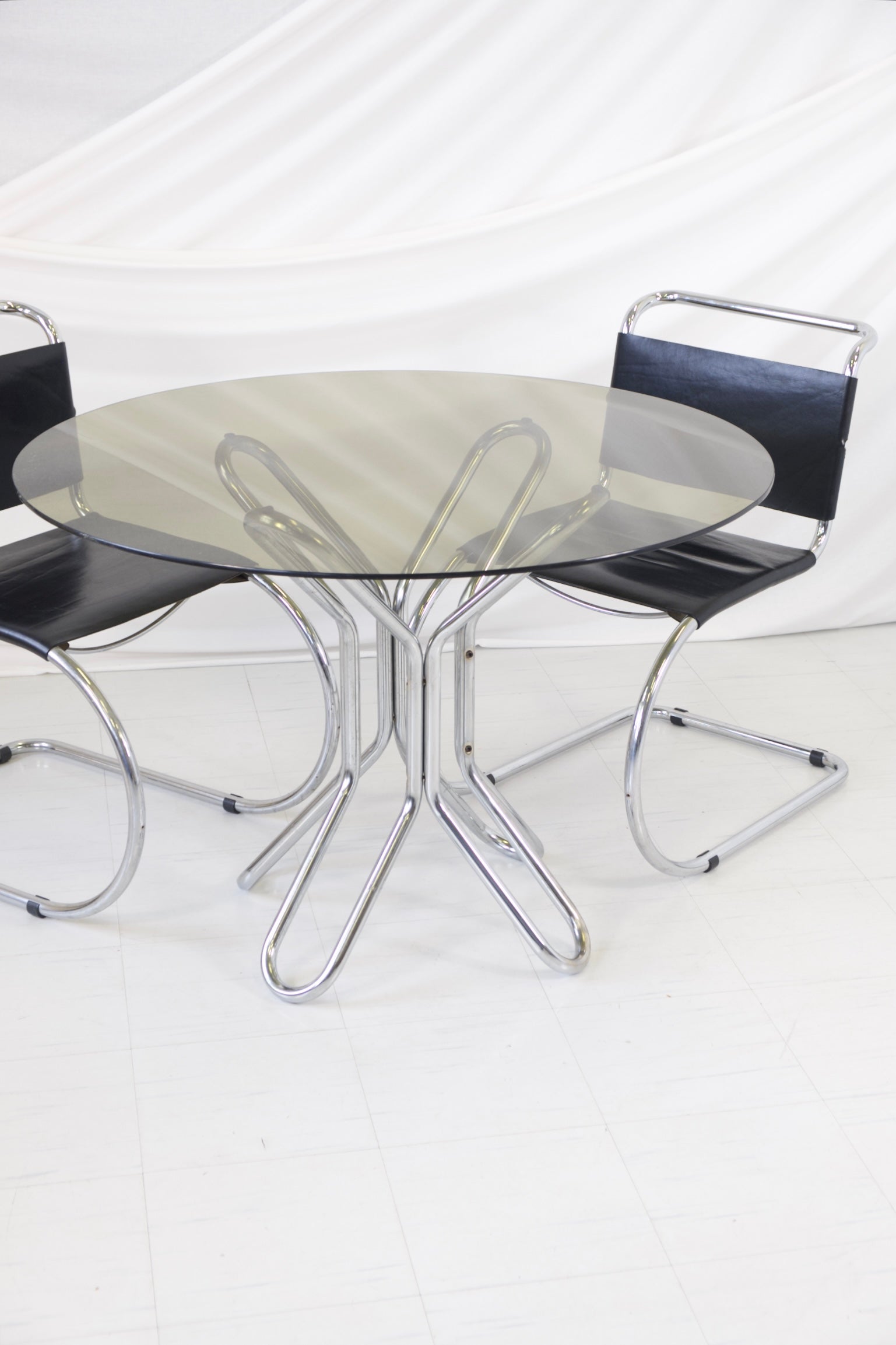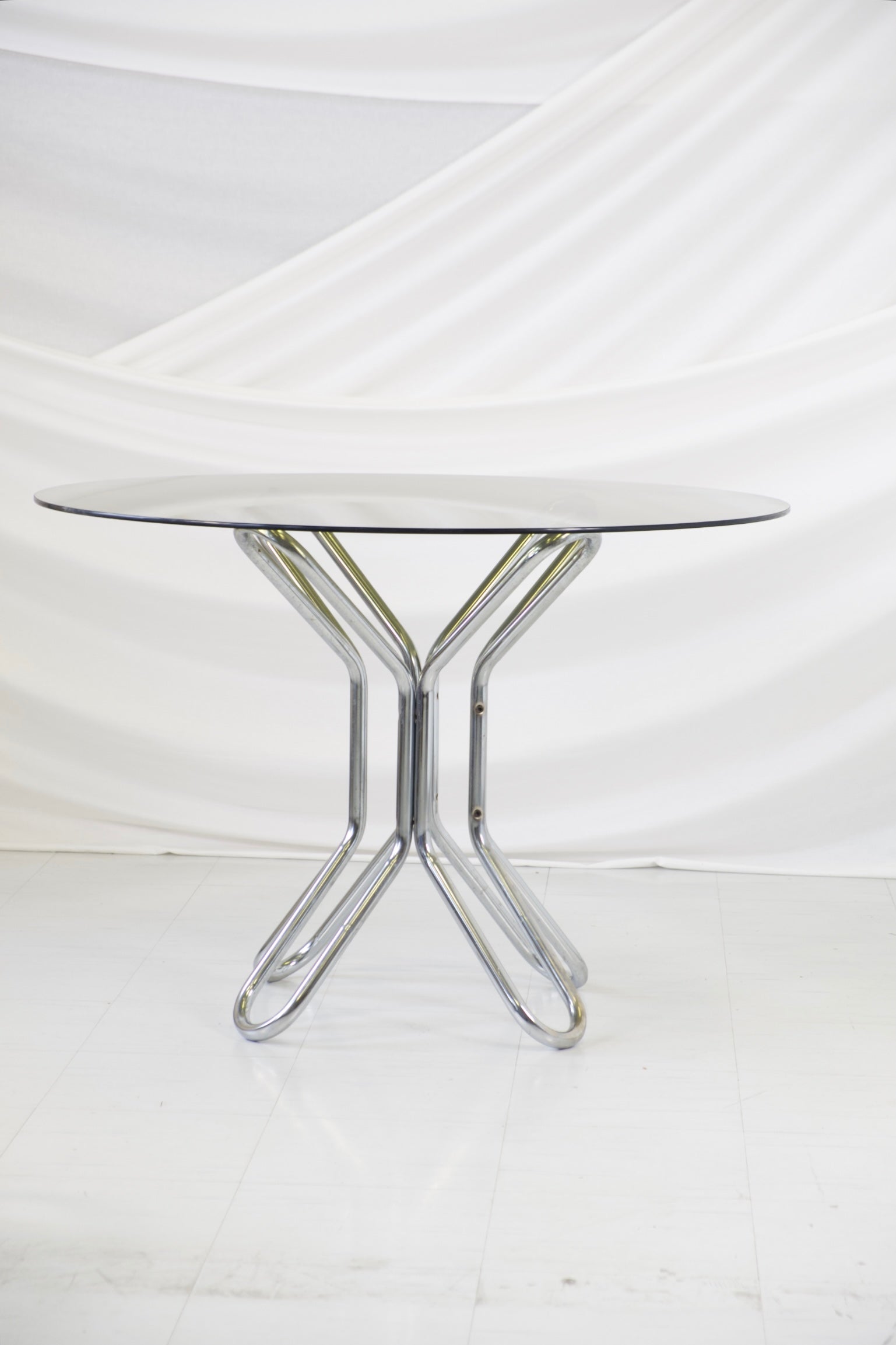 彫刻的なクロームメッキのスチールパイプベースとスモークガラスの天板を備えた円形ダイニングテーブル。絡み合うベースが印象的な建築的なシルエットを生み出し、機能性と芸術性を兼ね備えた作品です。