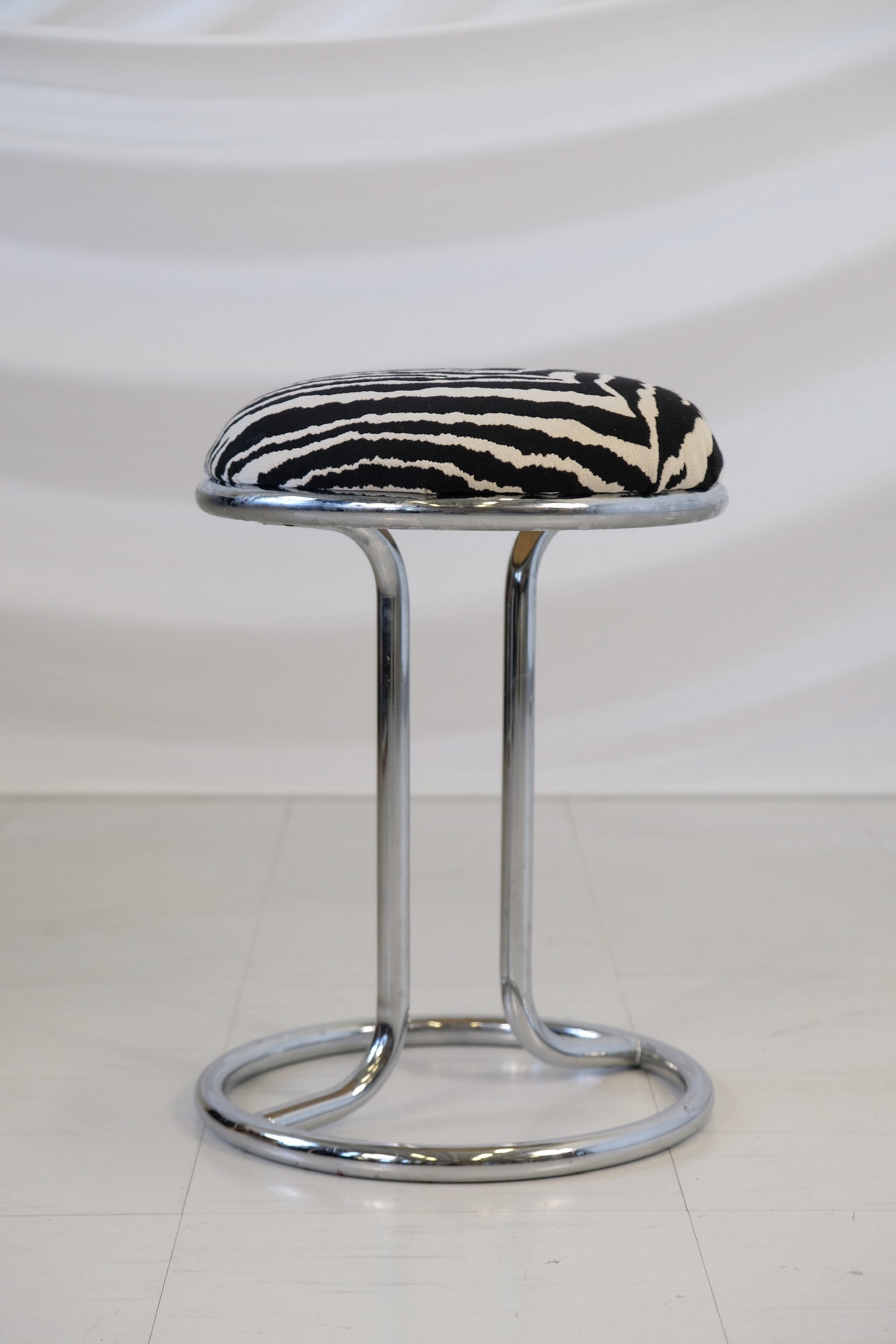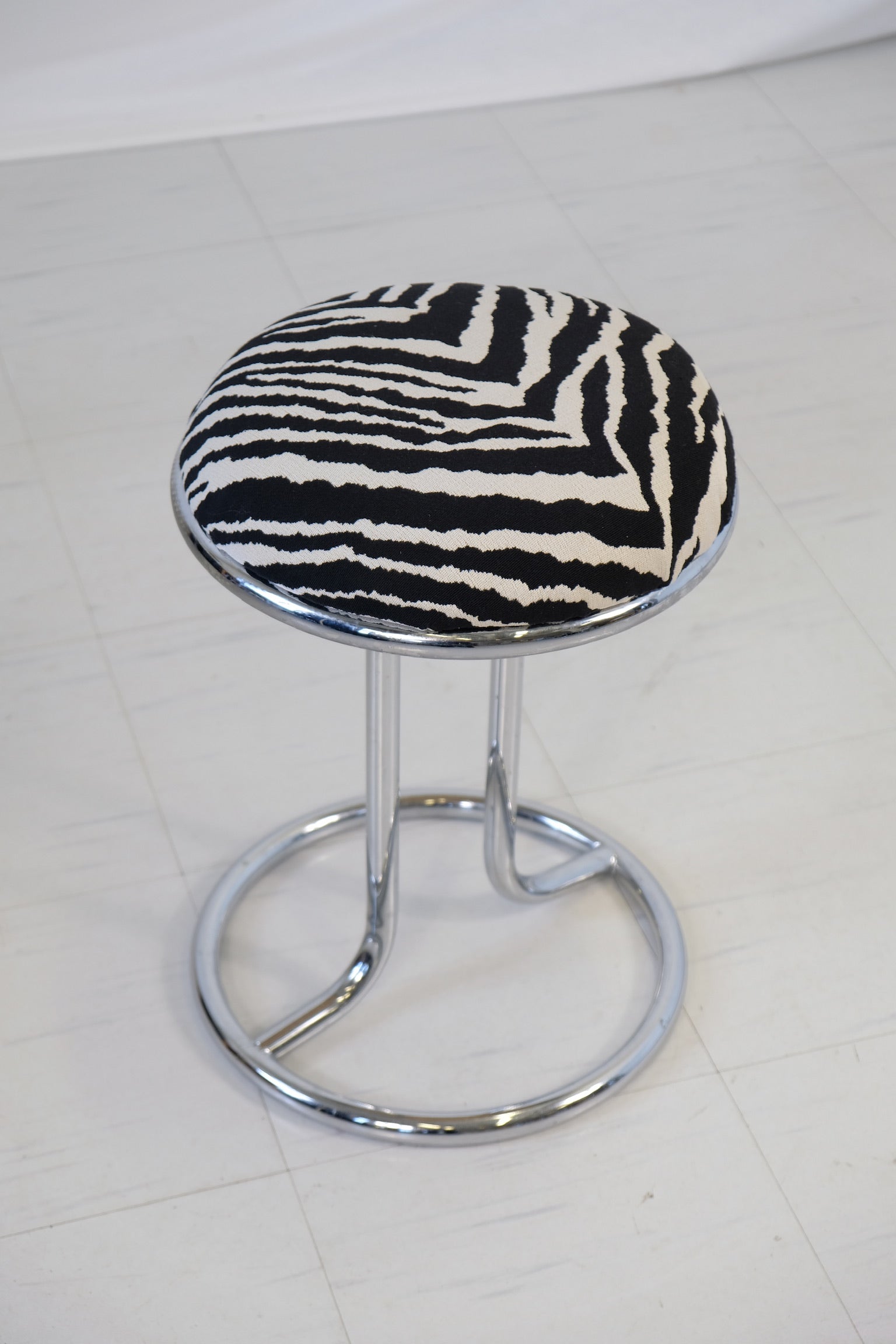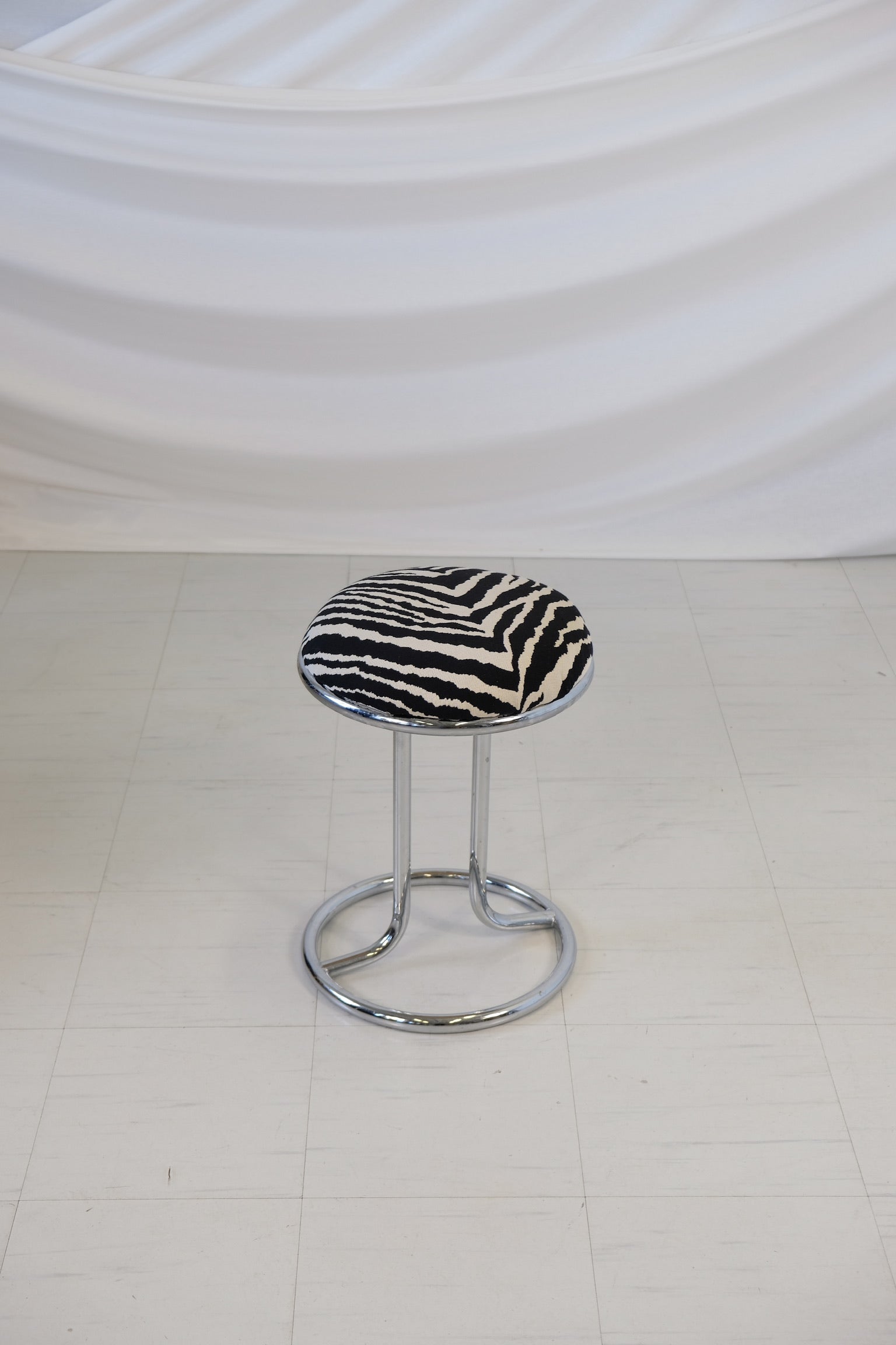 これらの印象的なスツールは、磨かれたクロムフレームと大胆なゼブラ柄の張り地でレトロシックを体現しています。