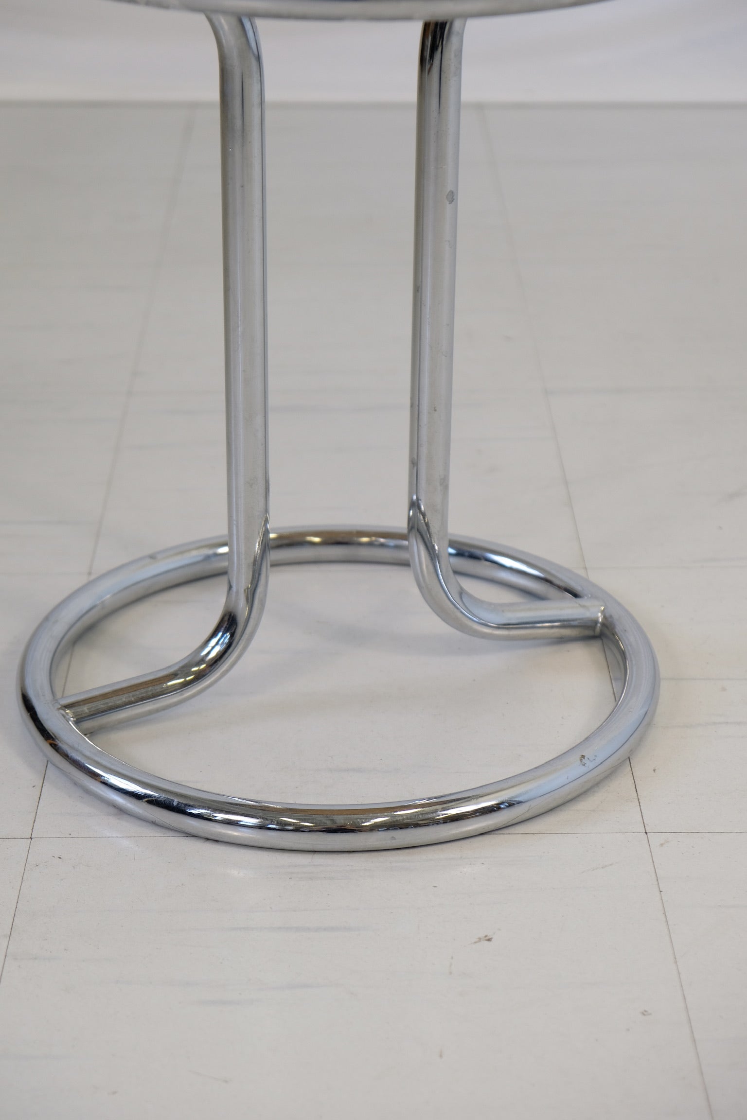 クロームベースは構造的に健全で、経年による軽微な表面摩耗と最小限の酸化が見られます。張り地は、接触頻度の高い部分にわずかな擦れや色あせが見られますが、無傷です。大きな損傷は見当たりません。詳細については、詳細な写真をご請求ください。