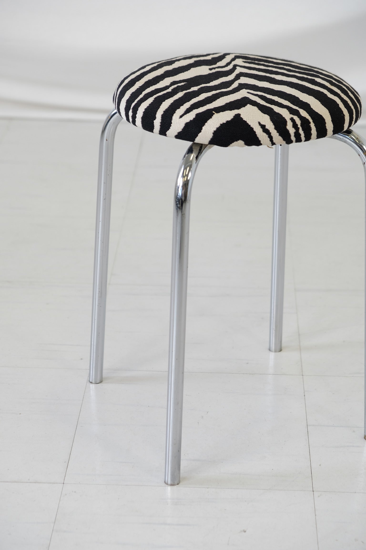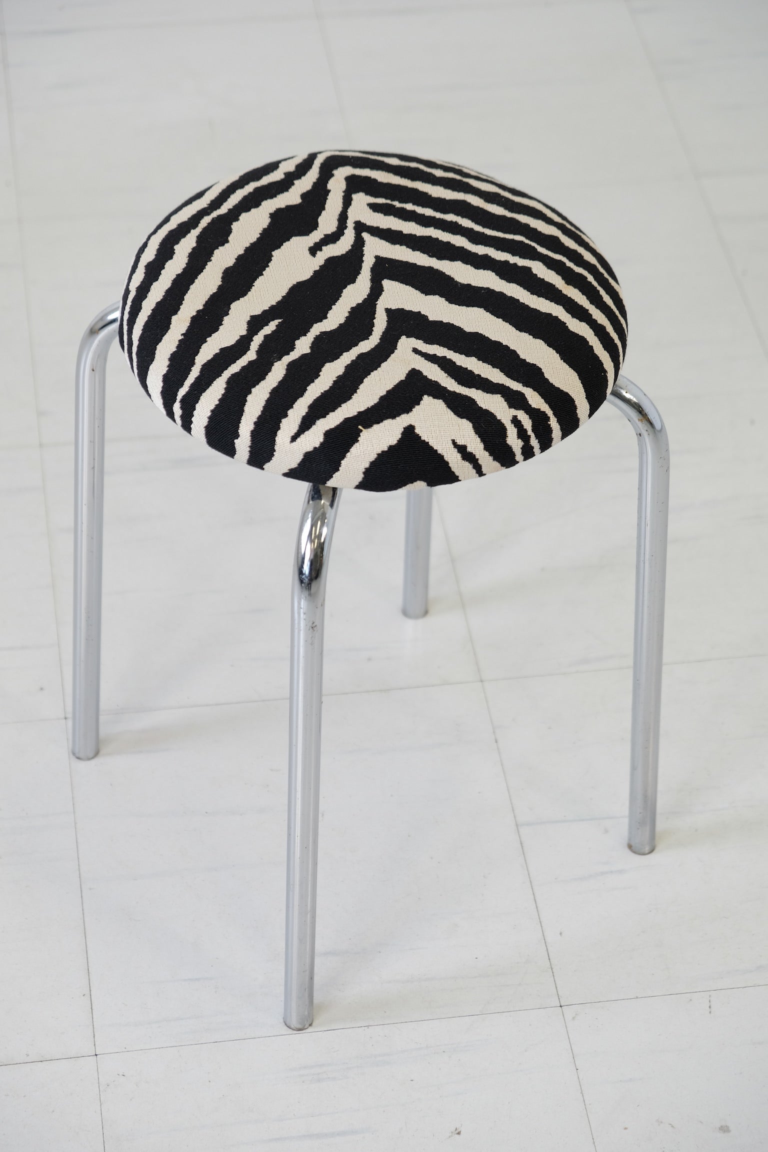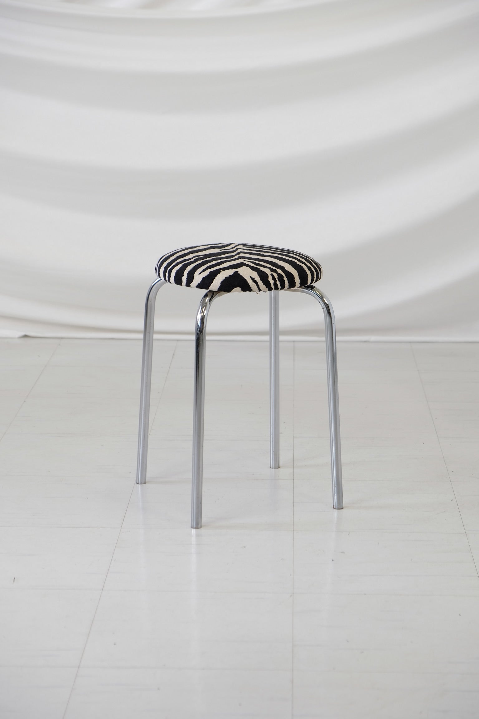 磨き上げられたクロームフレームと大胆なゼブラ柄の張地が特徴的な、レトロシックな雰囲気を漂わせる印象的なスツール。どんな空間にも華やかでヴィンテージなアクセントを添えてくれます。1960年代から70年代のデザインにインスパイアされた、洗練されたメタルとグラフィカルなアニマルプリントの組み合わせは、遊び心と洗練さを兼ね備えた当時の精神を体現しています。