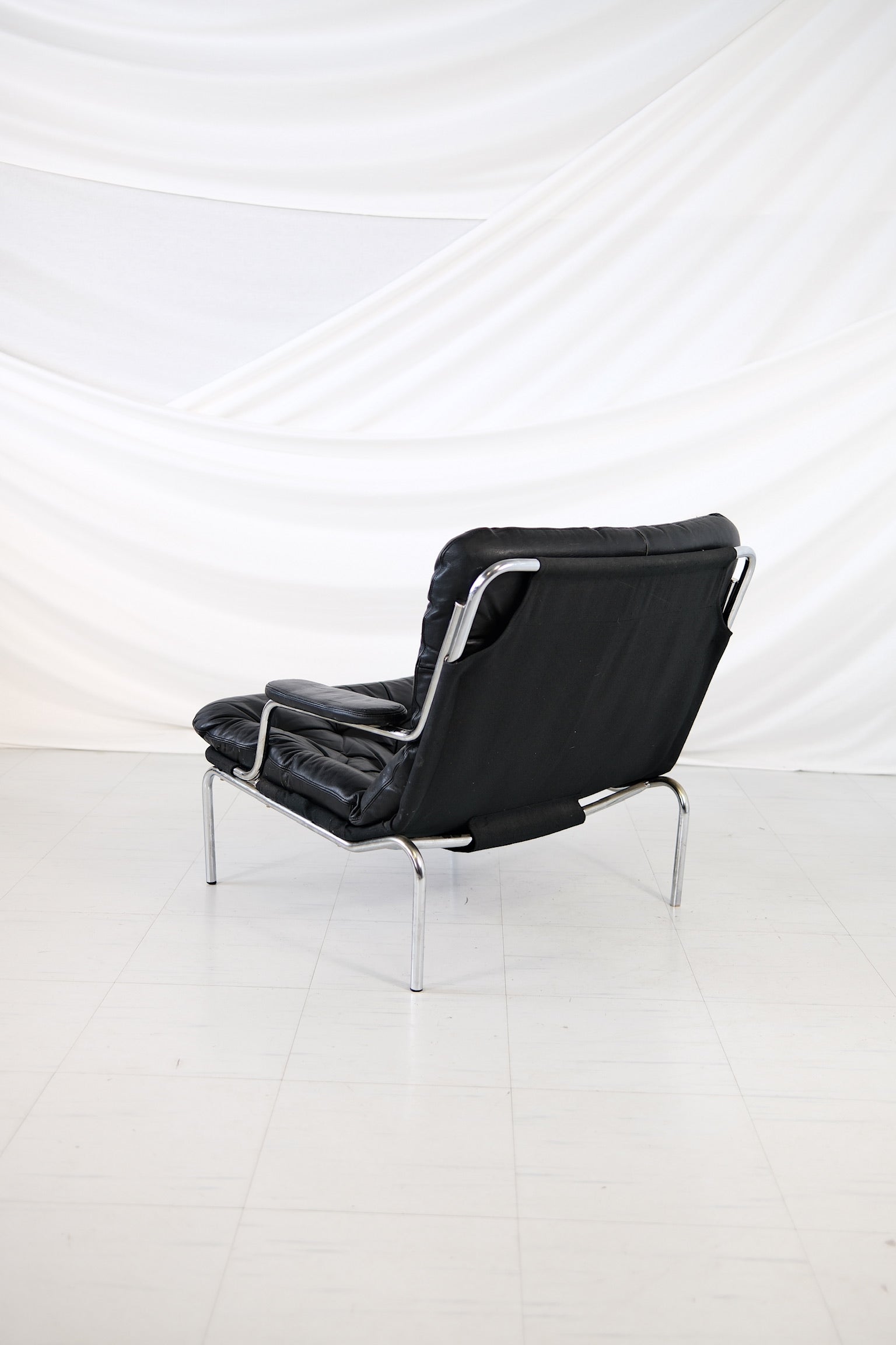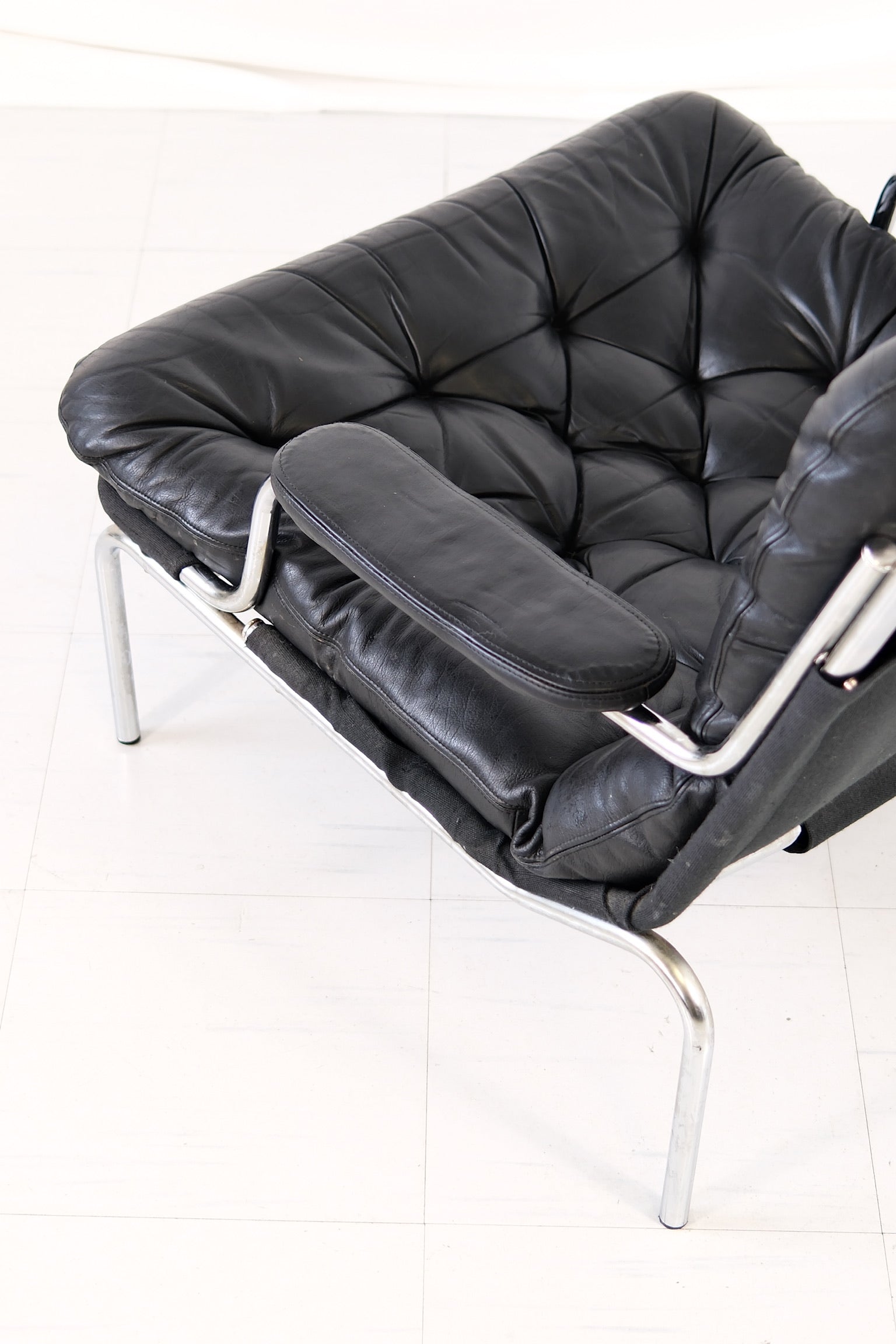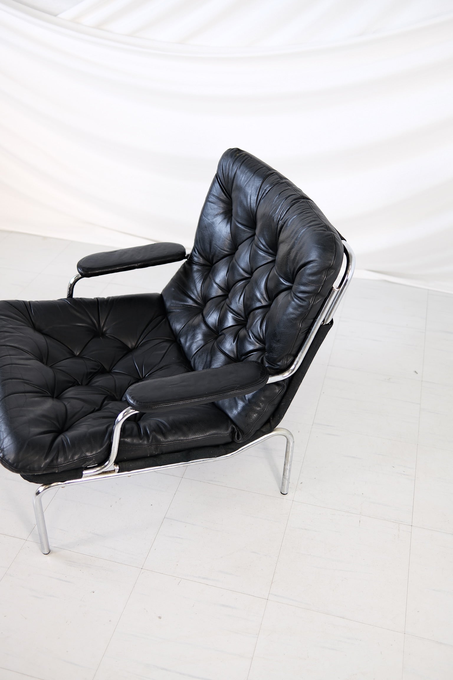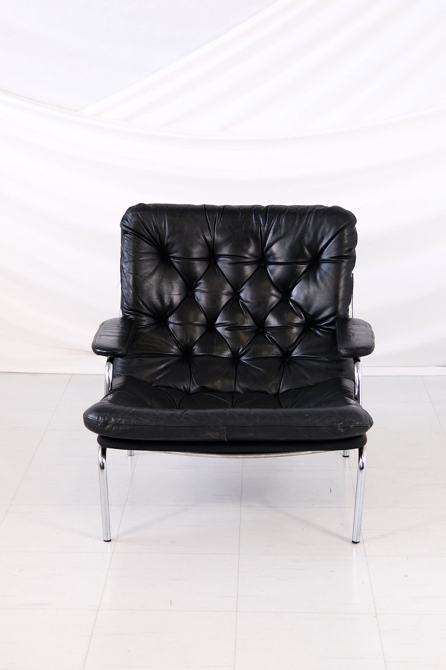 1970年代の美しいヴィンテージデンマーク製レザーアームチェア。洗練されたモダンなデザインと卓越した職人技が見事に調和しています。深みのあるタフテッドブラックレザークッションと、ミニマルなクローム仕上げのチューブラーフレームが、時代を超越した洗練された印象を与える印象的なシルエットを生み出しています。