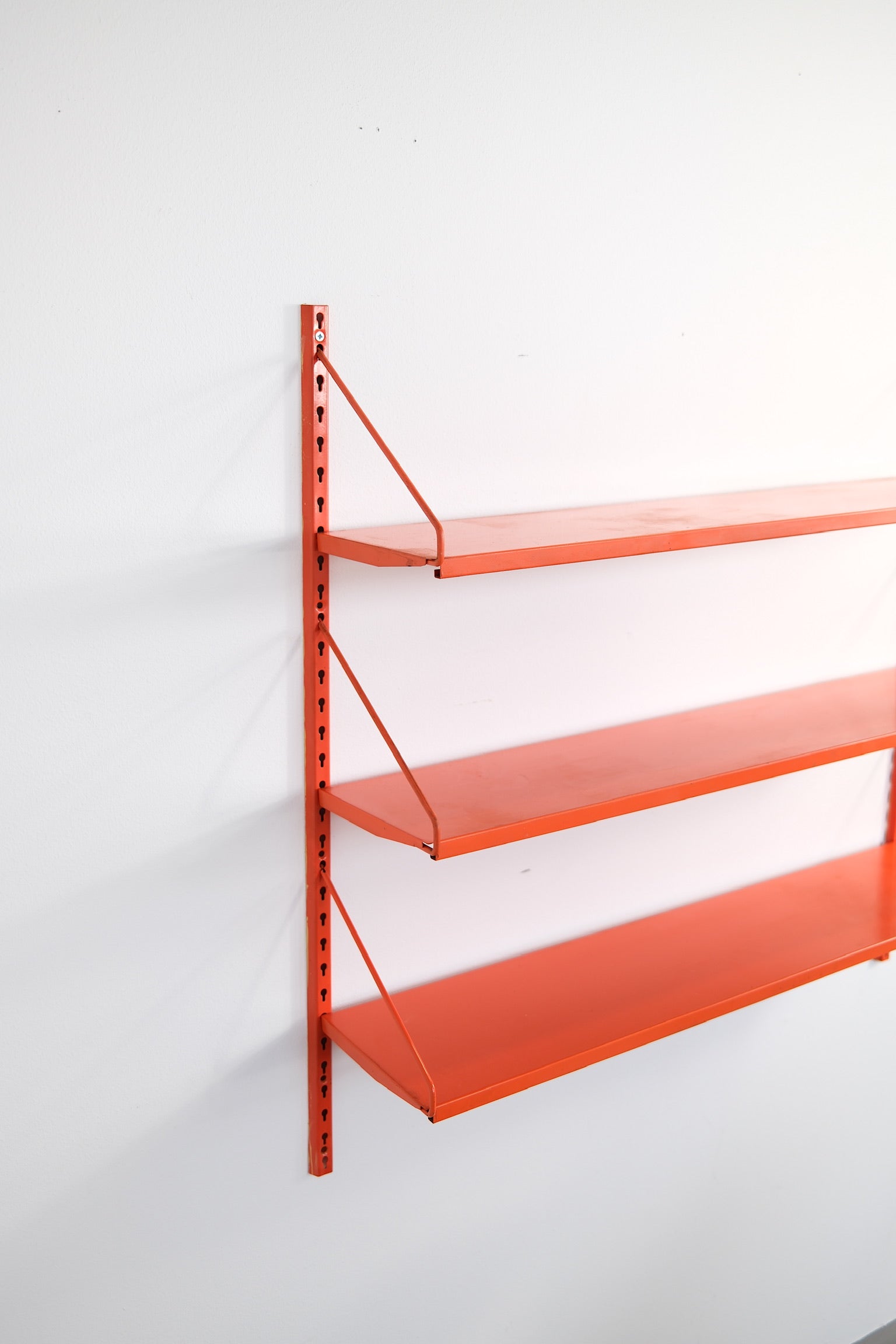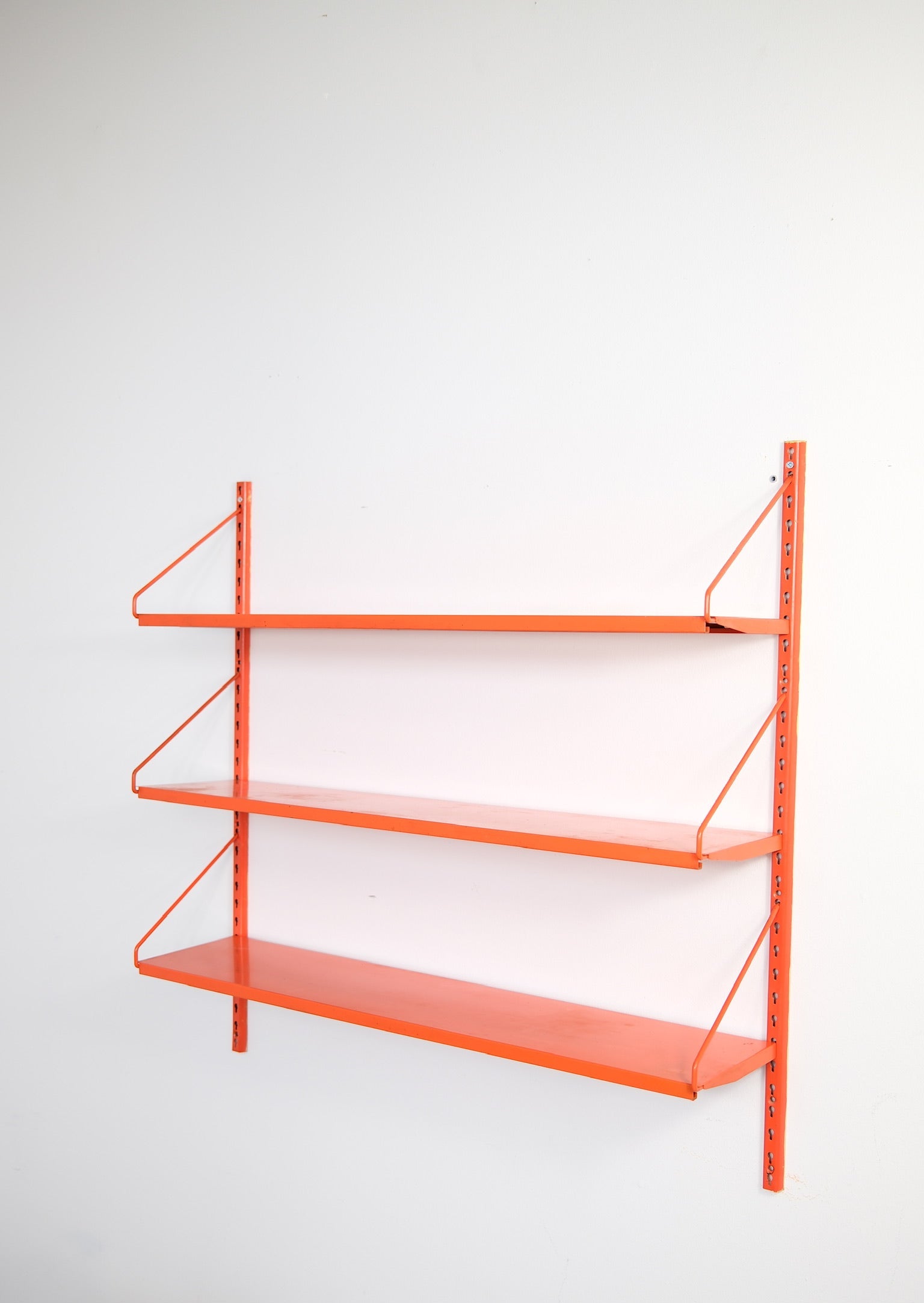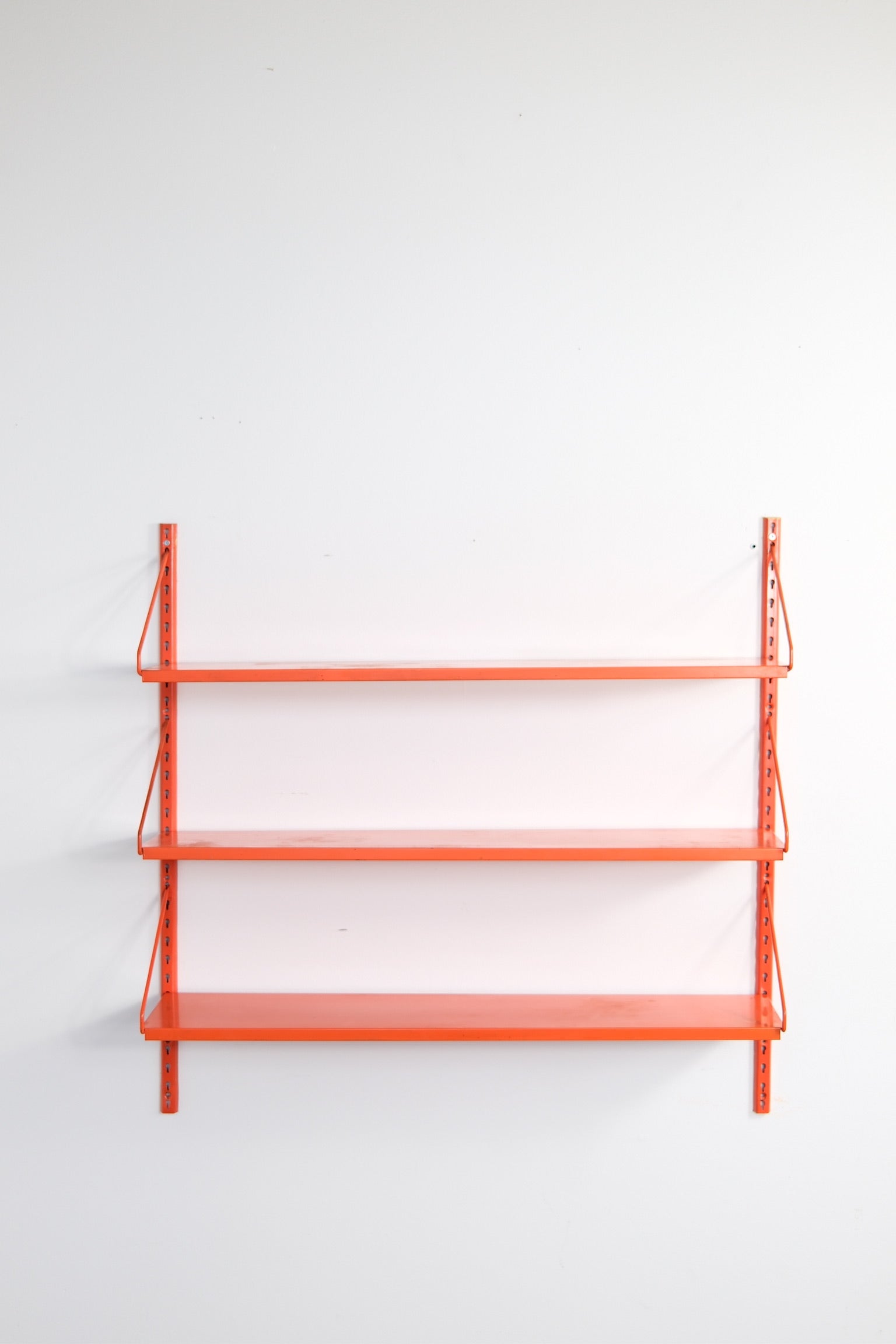 ミッドセンチュリー・デンマークデザインの印象的な一例であるこのヴィンテージのモジュラー式ウォールシェルフは、どんな空間にも大胆な彩りを添えます。鮮やかなオレンジ色のラッカー仕上げのこのユニットは、ミニマルなメタルフレームと3枚のスリムで調節可能な棚板を備え、本、陶器、その他日用品のディスプレイに最適です。