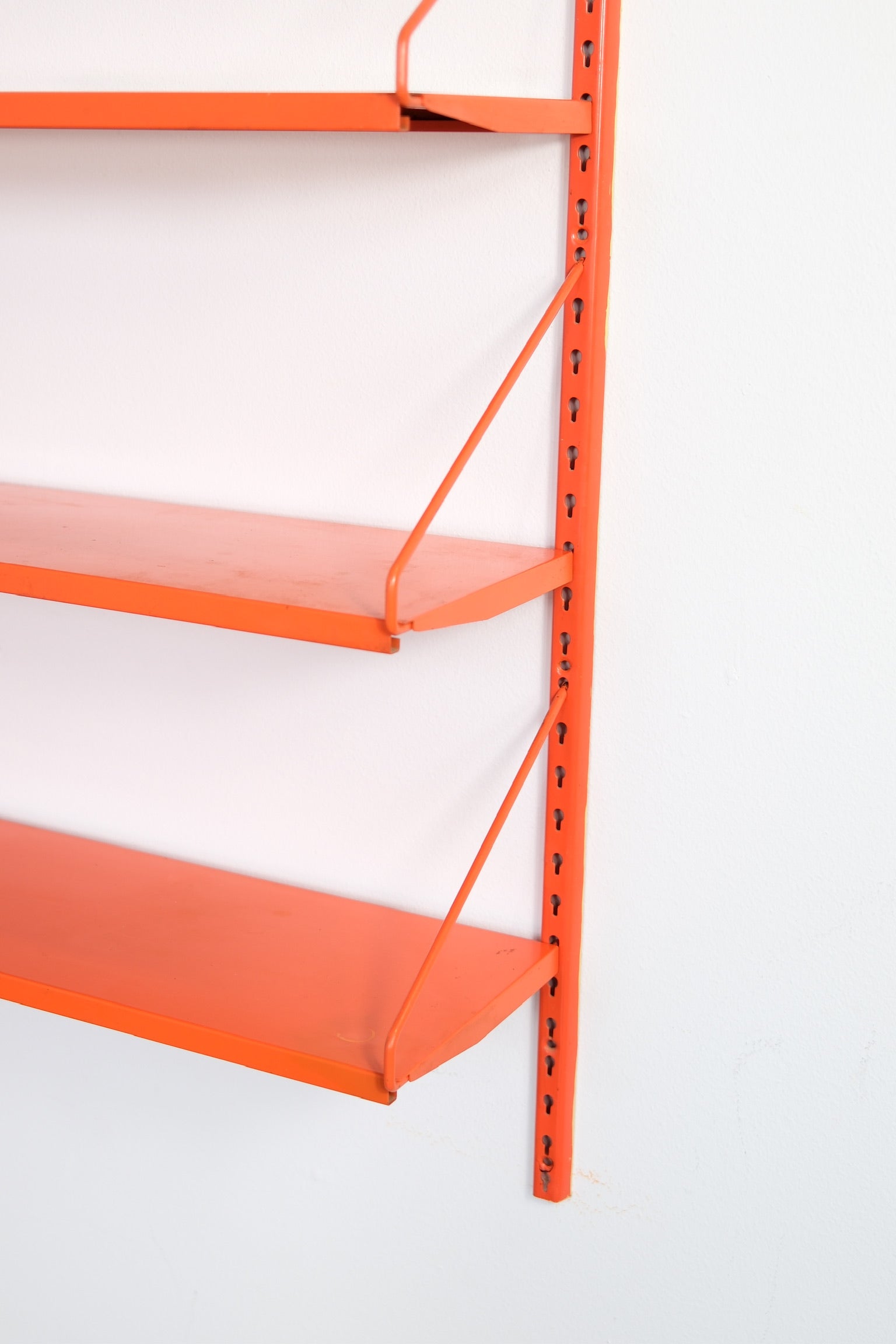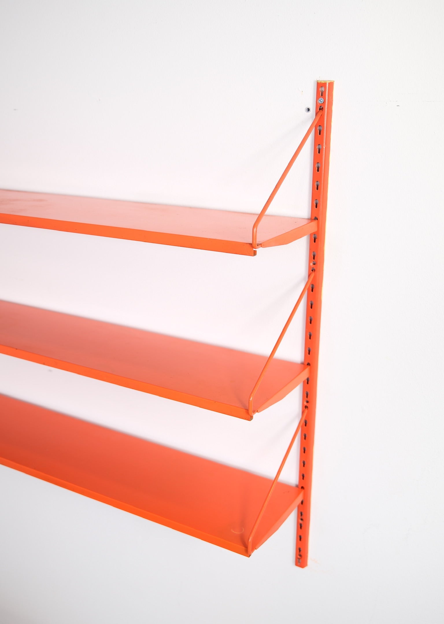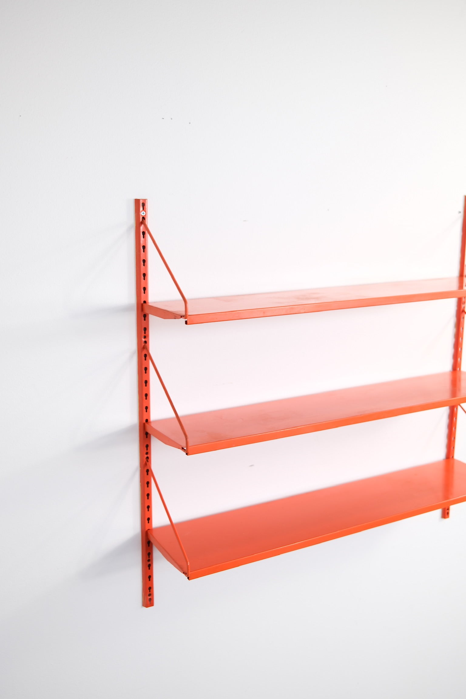 ミッドセンチュリー・デンマークデザインの印象的な一例であるこのヴィンテージのモジュラー式ウォールシェルフは、どんな空間にも大胆な彩りを添えます。鮮やかなオレンジ色のラッカー仕上げのこのユニットは、ミニマルなメタルフレームと3枚のスリムで調節可能な棚板を備え、本、陶器、その他日用品のディスプレイに最適です。