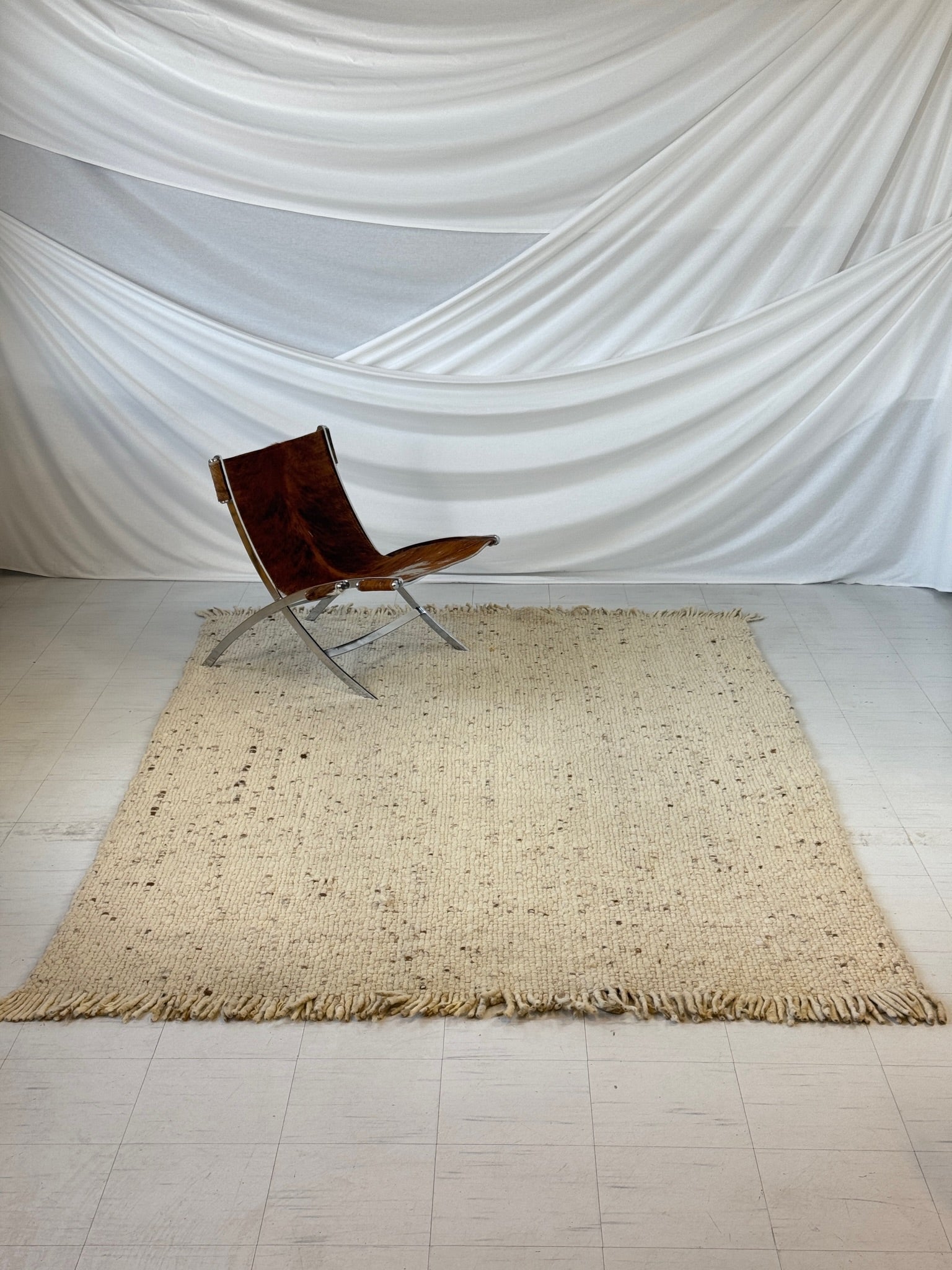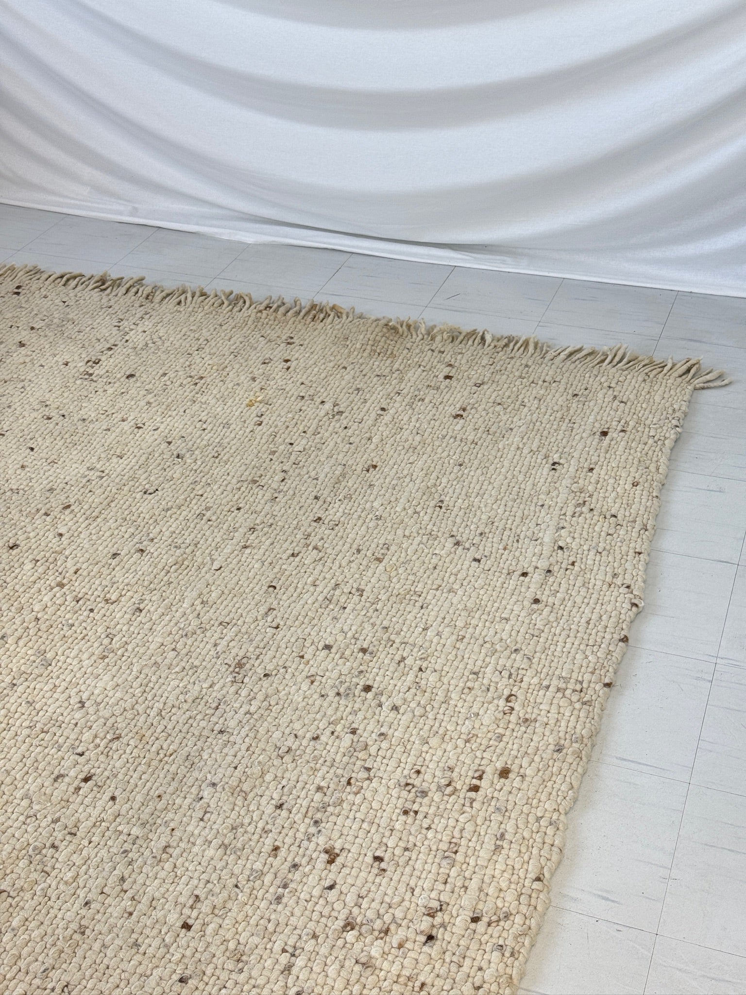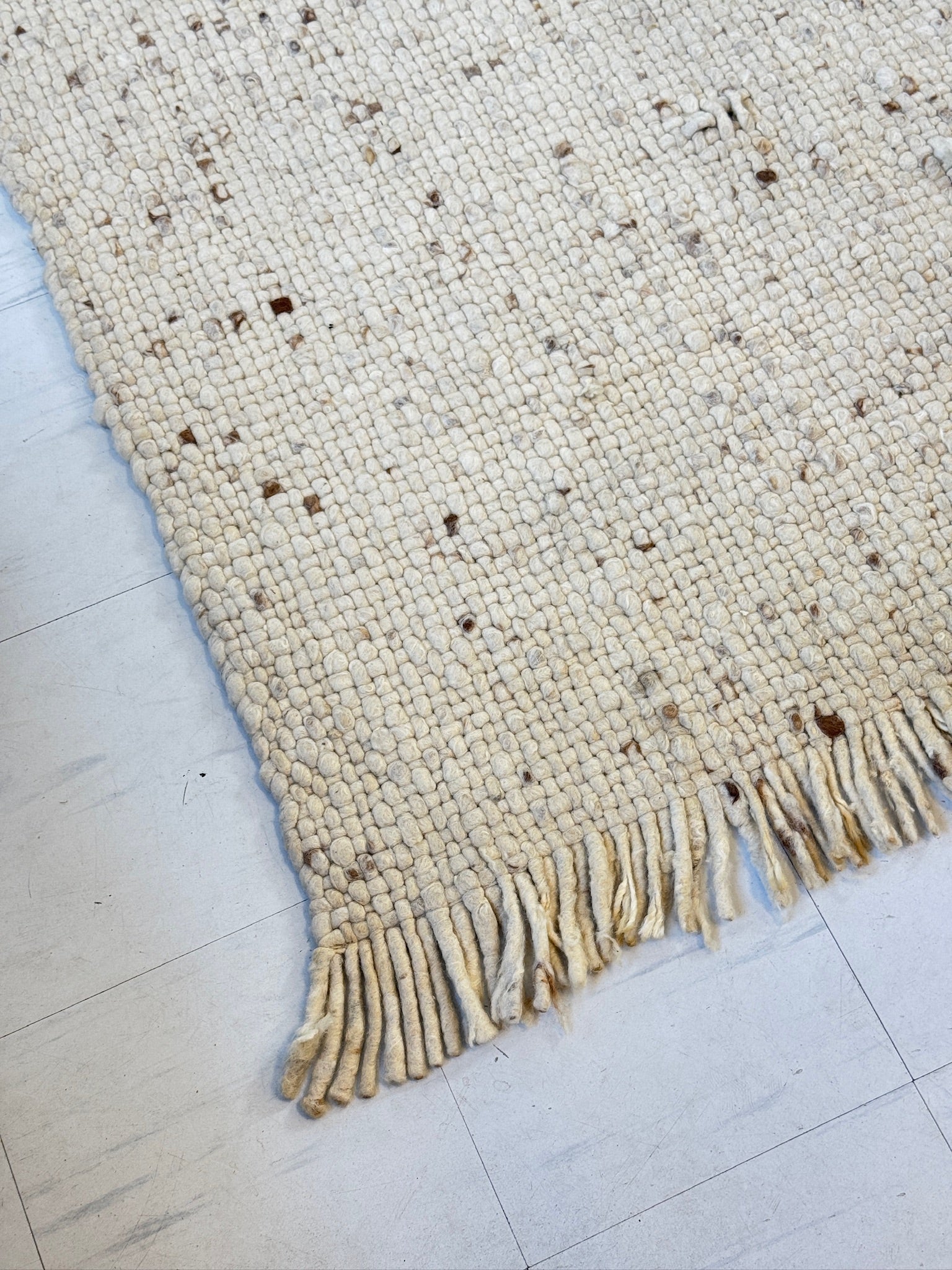 美しい質感の手織りウールラグ。染色されていない自然な色合いで、全体に柔らかな斑点模様が散りばめられています。太めのウール糸で織り上げた表面は、繊細なループ状の質感がインテリアに温かみと深みをもたらします。フリンジの縁取りが、落ち着いた職人技のタッチを添えています。