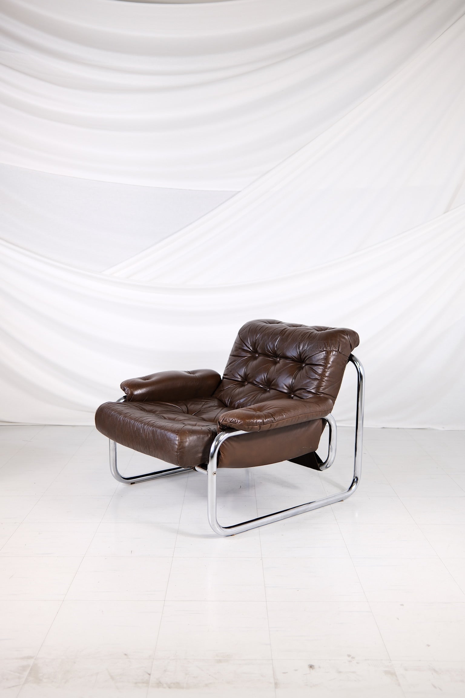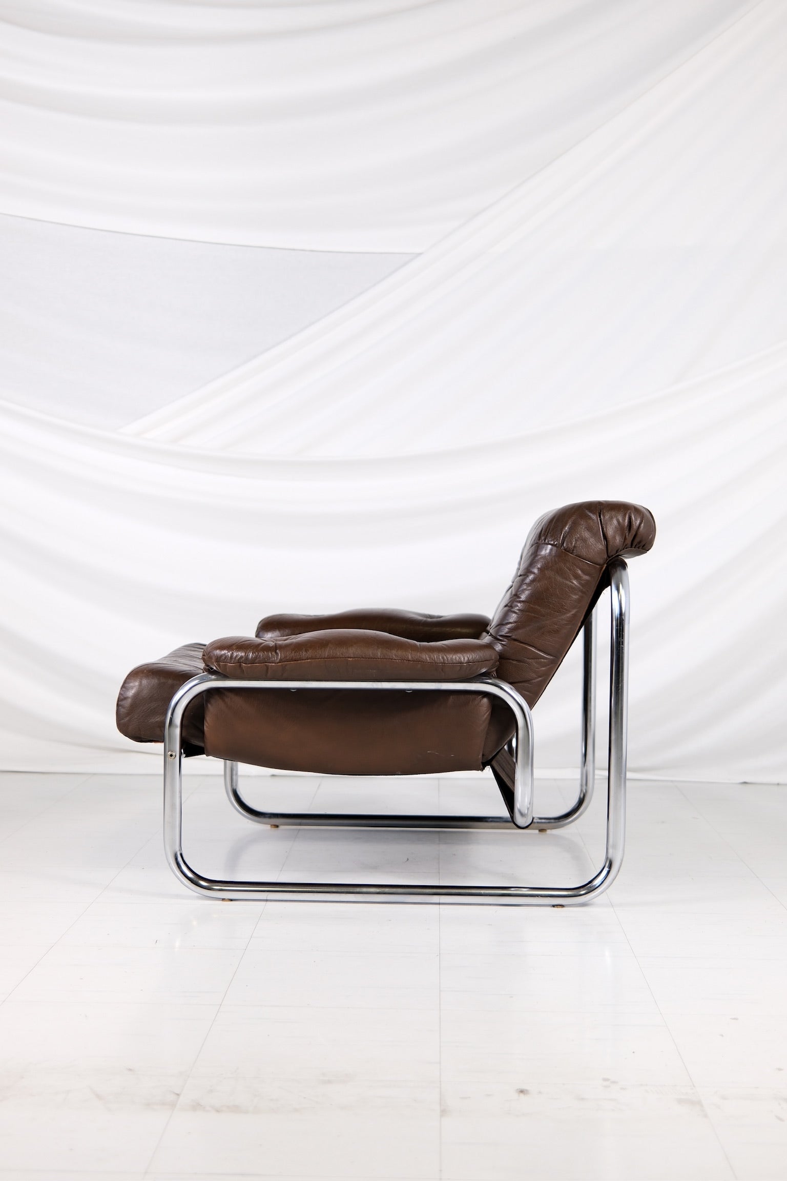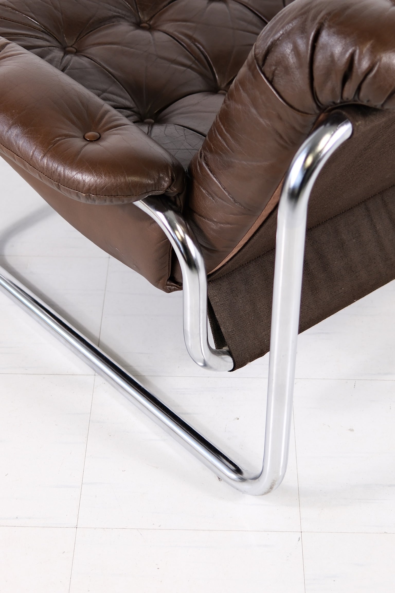 1970年代後半にヨハン・ベルティル・ヘグストロームがデザインした、希少なヴィンテージIKEA Borkumアームチェア。大胆なスチールチューブラーフレームと、贅沢で深いクッションを備えたブラウンレザーの張地を組み合わせたこの象徴的な作品は、彫刻的な存在感と心地よい座り心地の両方を提供します。