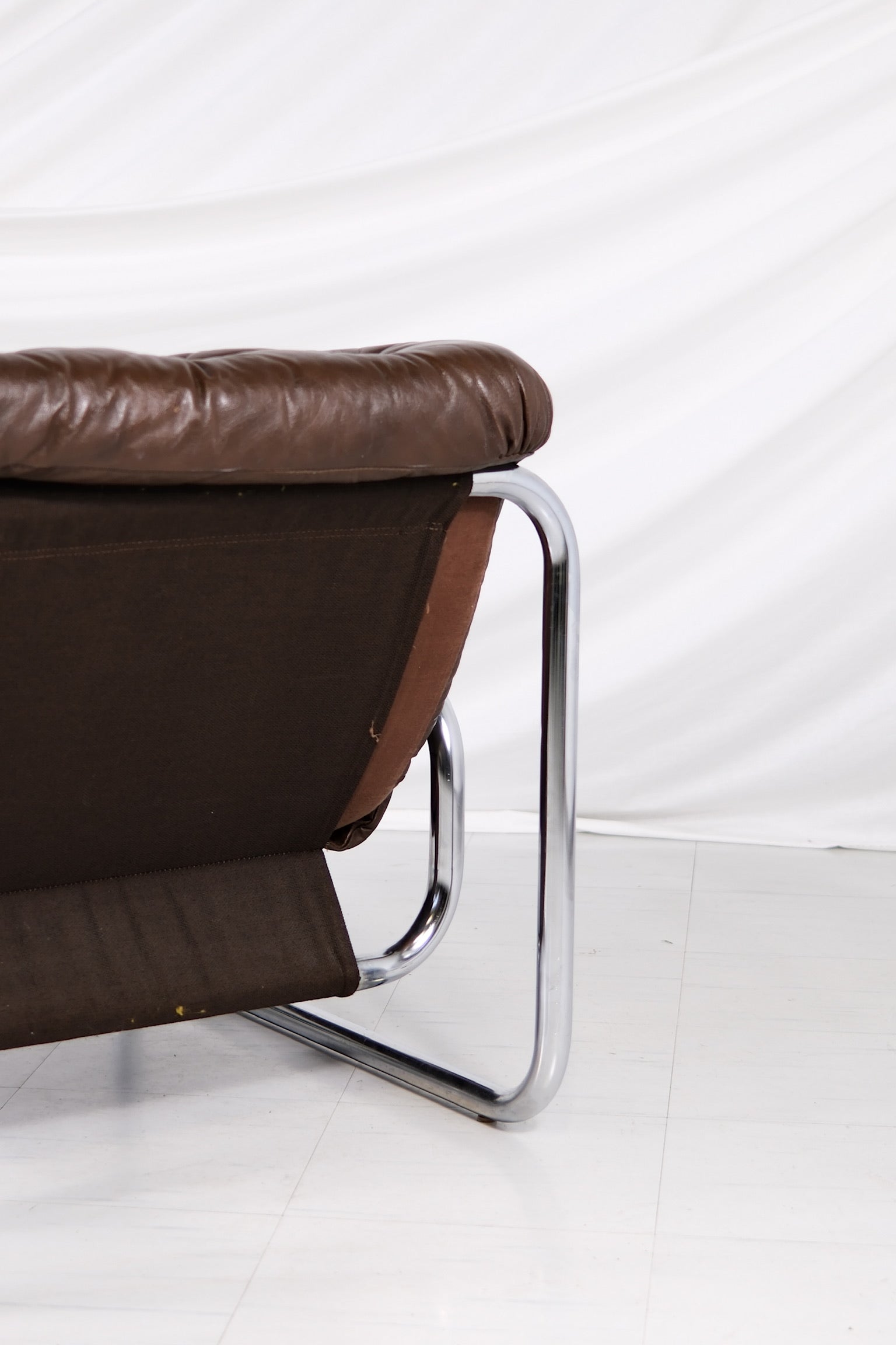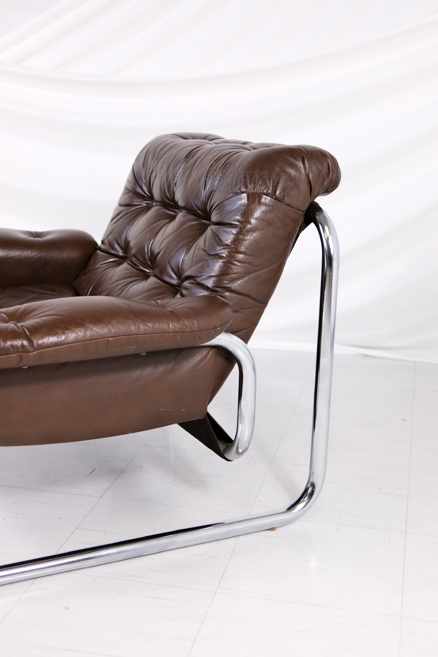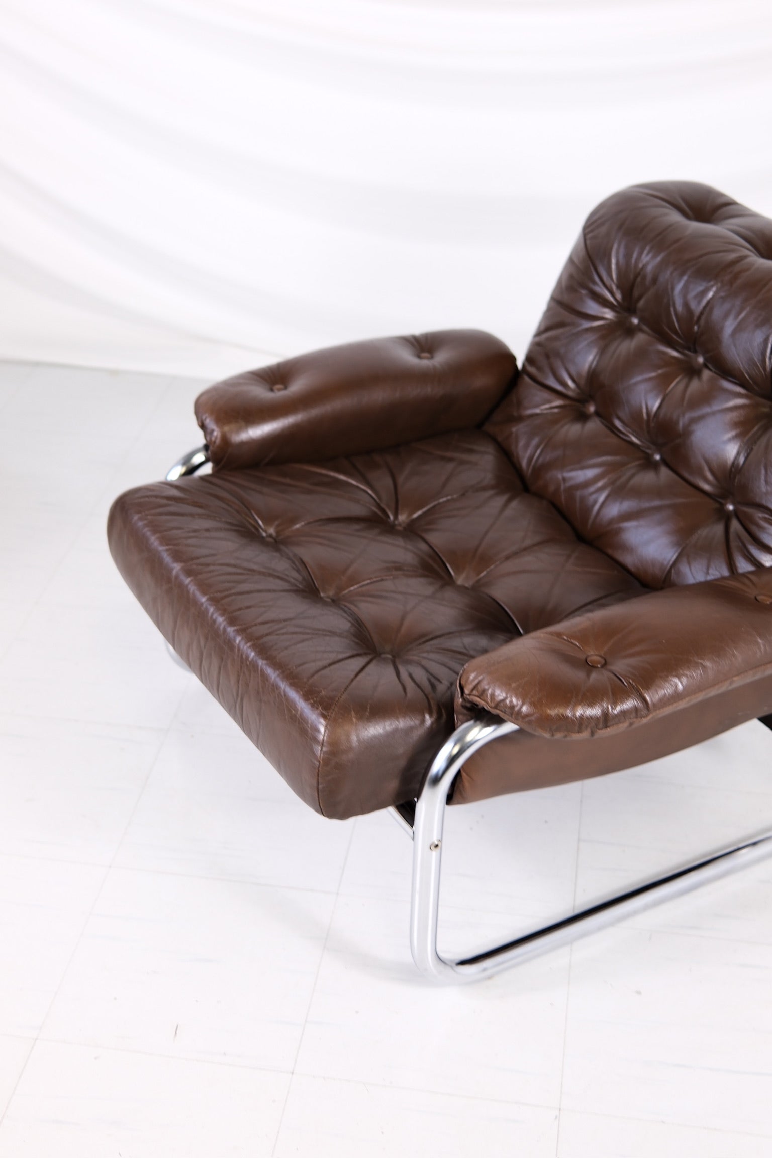 1970年代後半にヨハン・ベルティル・ヘグストロームがデザインした、希少なヴィンテージIKEA Borkumアームチェア。大胆なスチールチューブラーフレームと、贅沢で深いクッションを備えたブラウンレザーの張地を組み合わせたこの象徴的な作品は、彫刻的な存在感と心地よい座り心地の両方を提供します。