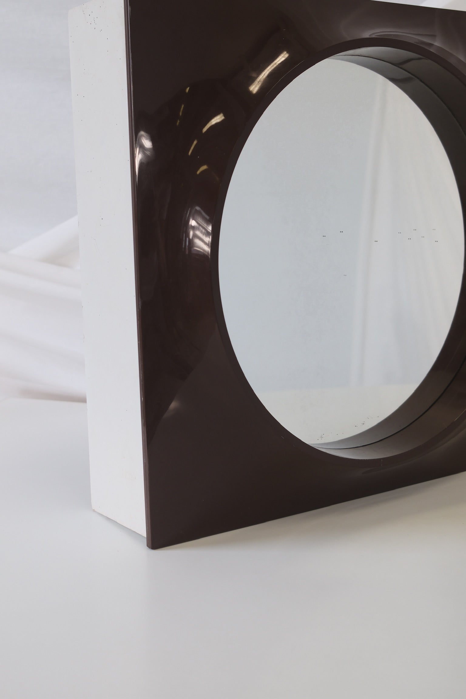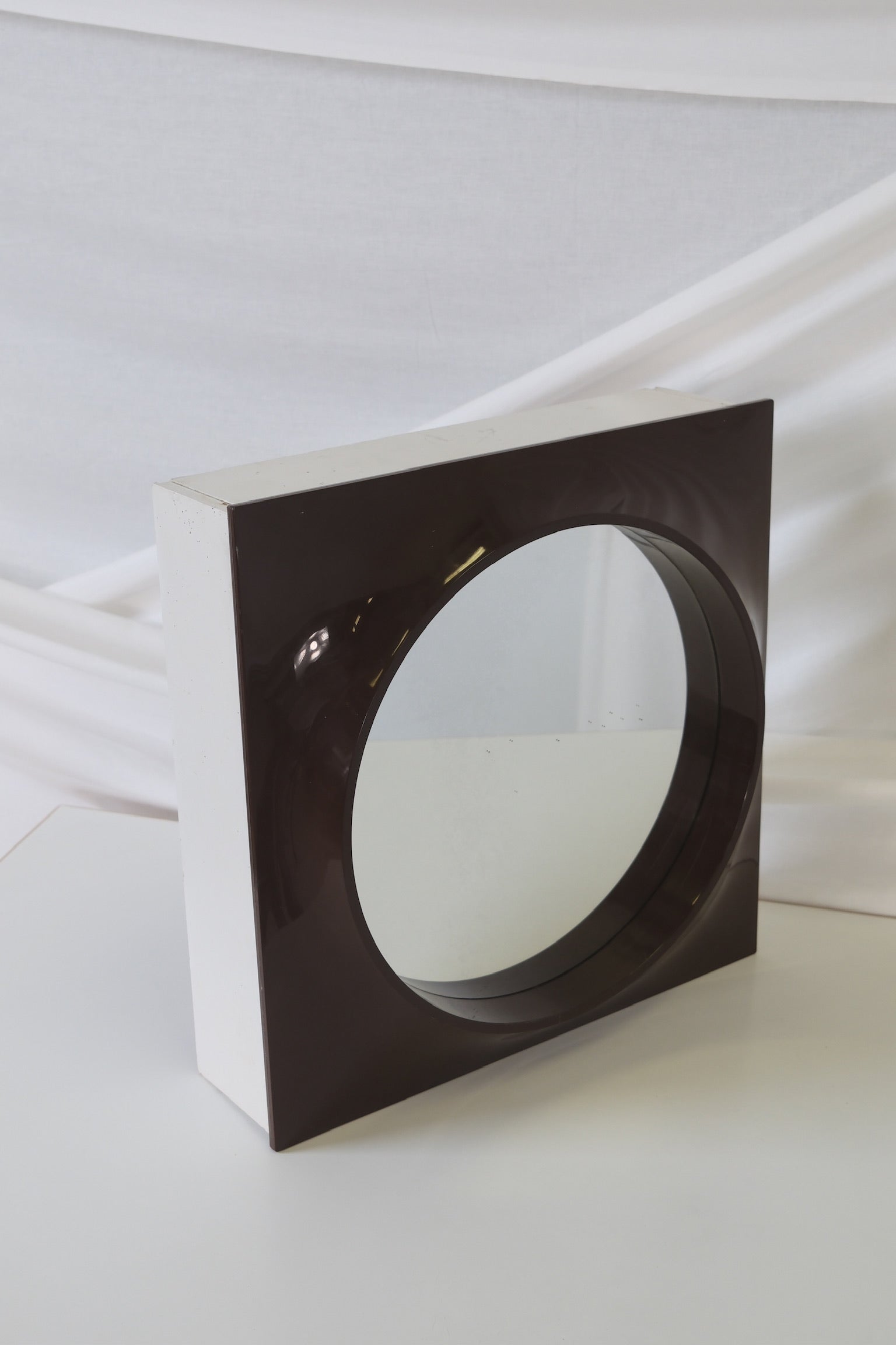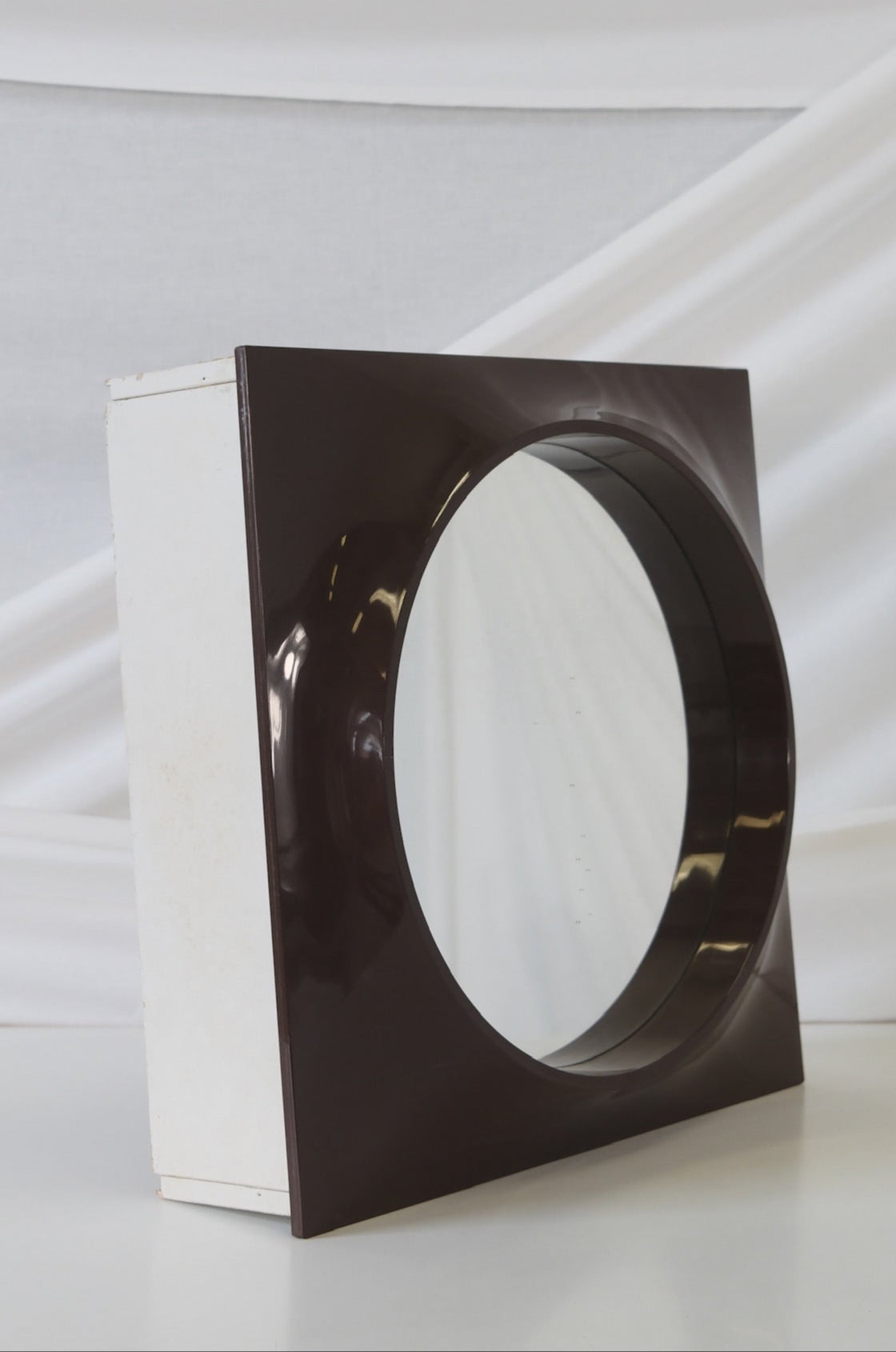 希少なヴィンテージ 大胆なスペースを備えたIKEAのバスルームキャビネット 時代を感じさせるデザイン。深みのあるブラウンのプラスチックフレームと円形の鏡、そして実用的な白い収納キャビネットを組み合わせた作品です。機能的でありながら遊び心のあるこのデザインは、1970年代後半から1980年代初頭の未来的な美学を捉えています。