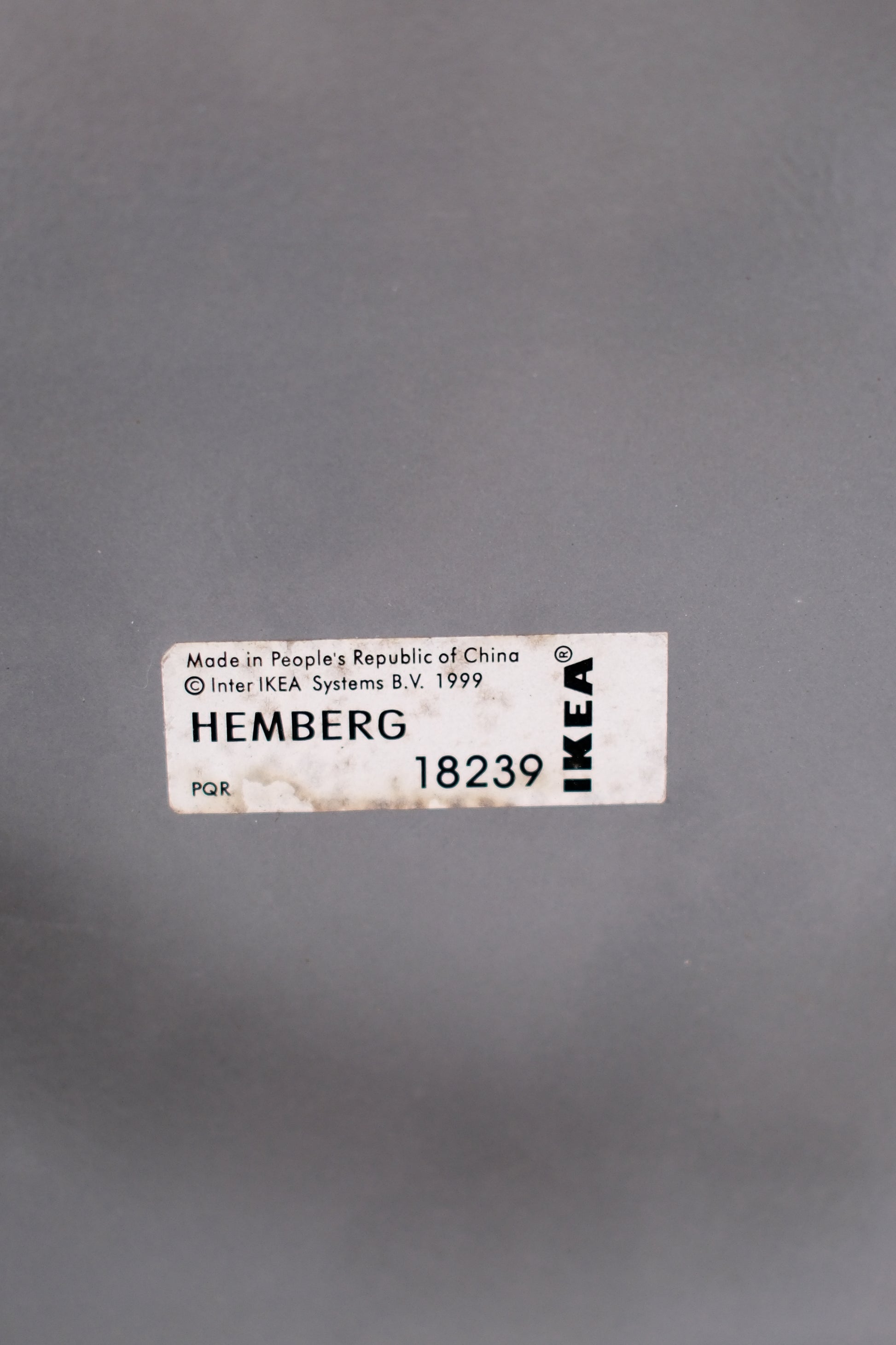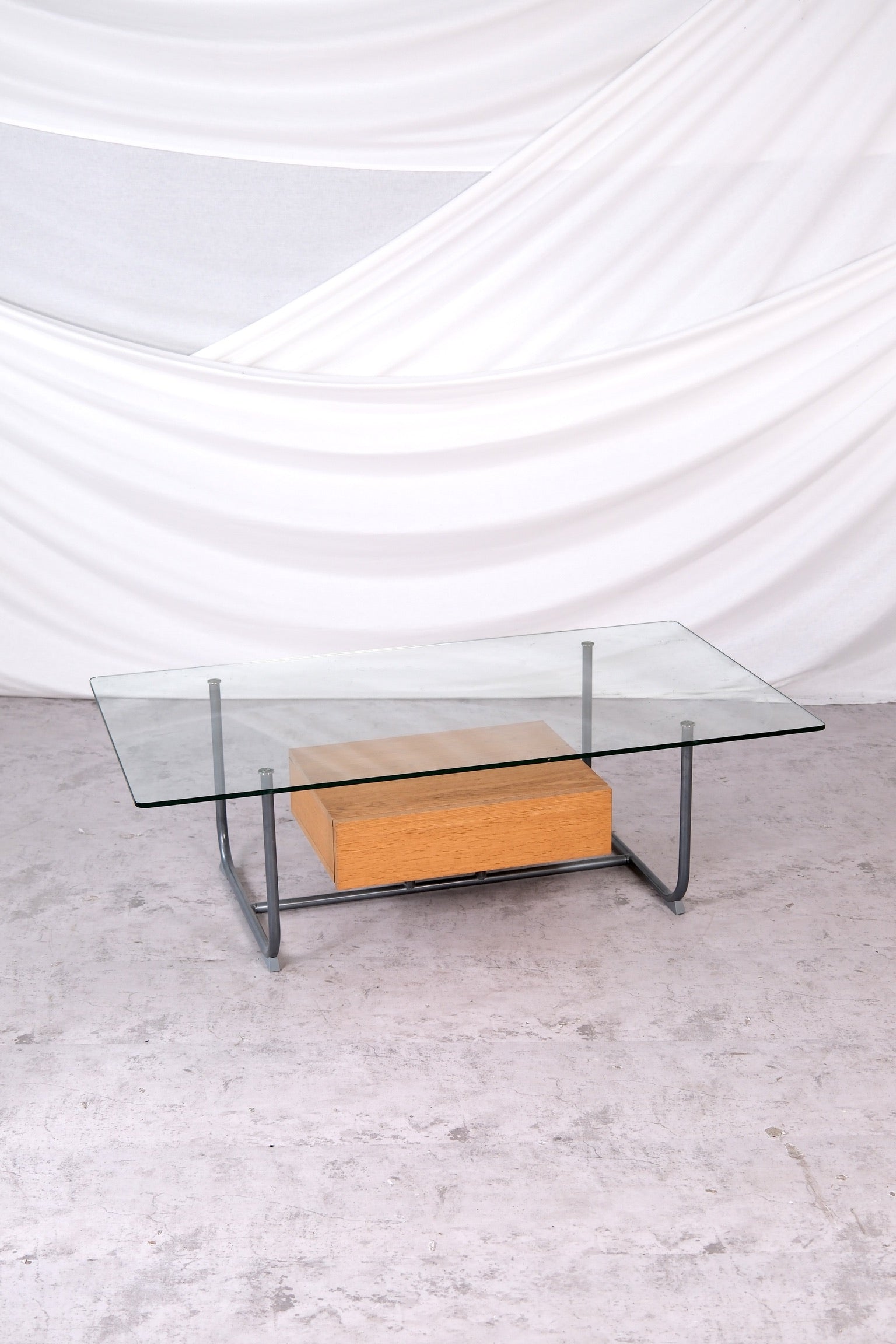 Vintage IKEA Hemberg coffee table from 1999.This rare model combines 1990s minimalism with practical, timeless design: a clear glass top, grey-painted steel frame, and a warm oak-veneered drawer at the center that adds a tactile balance to the modern structure.