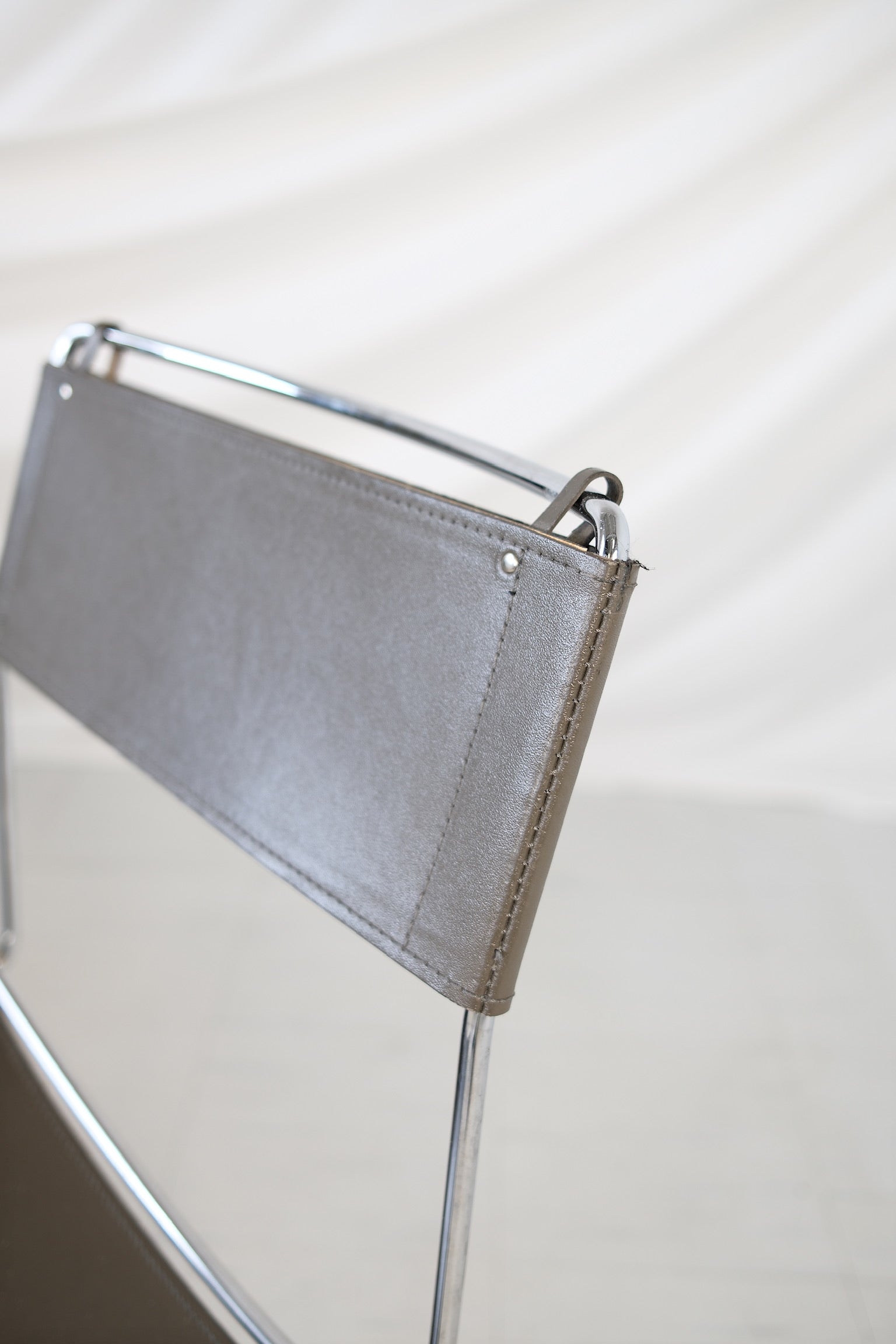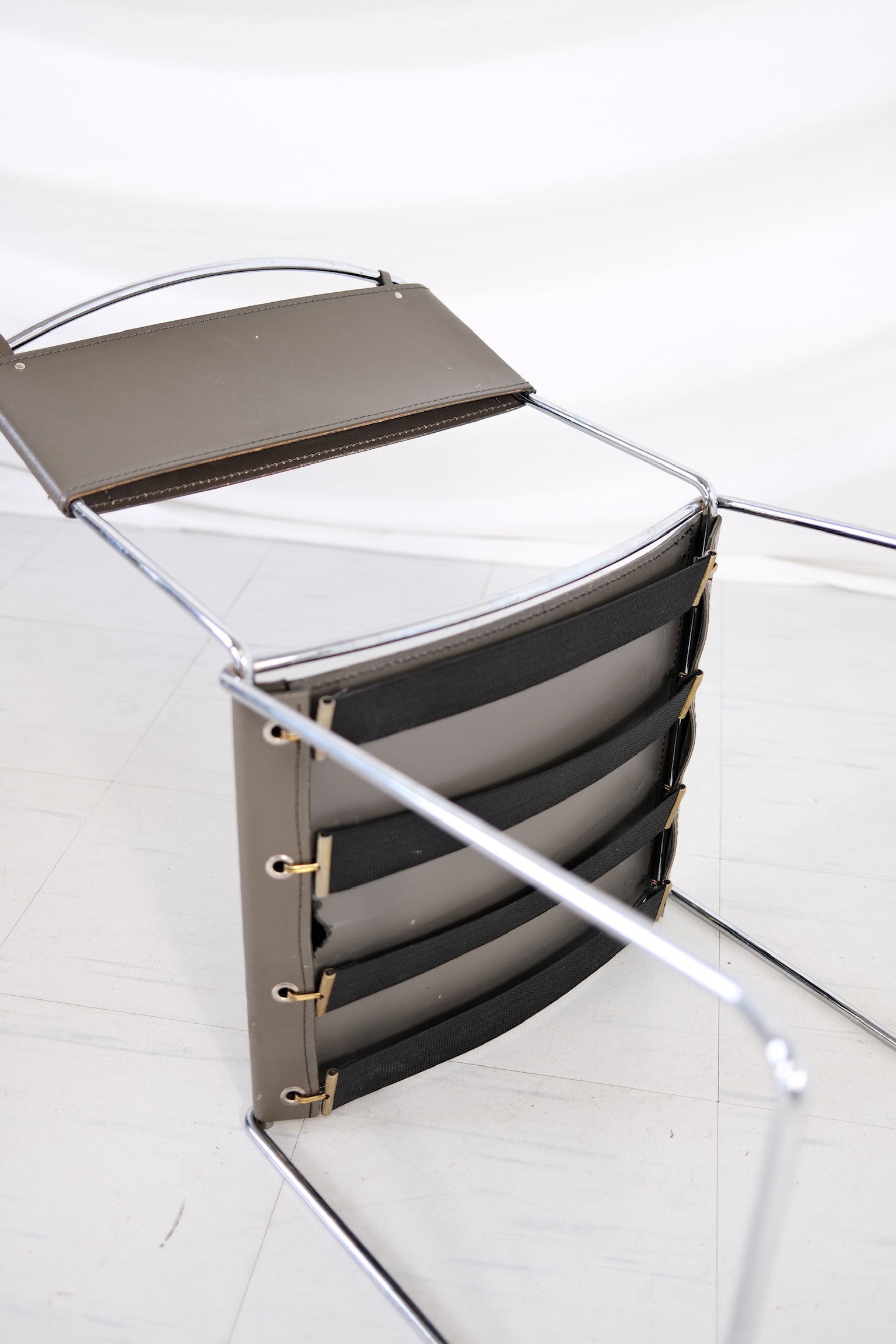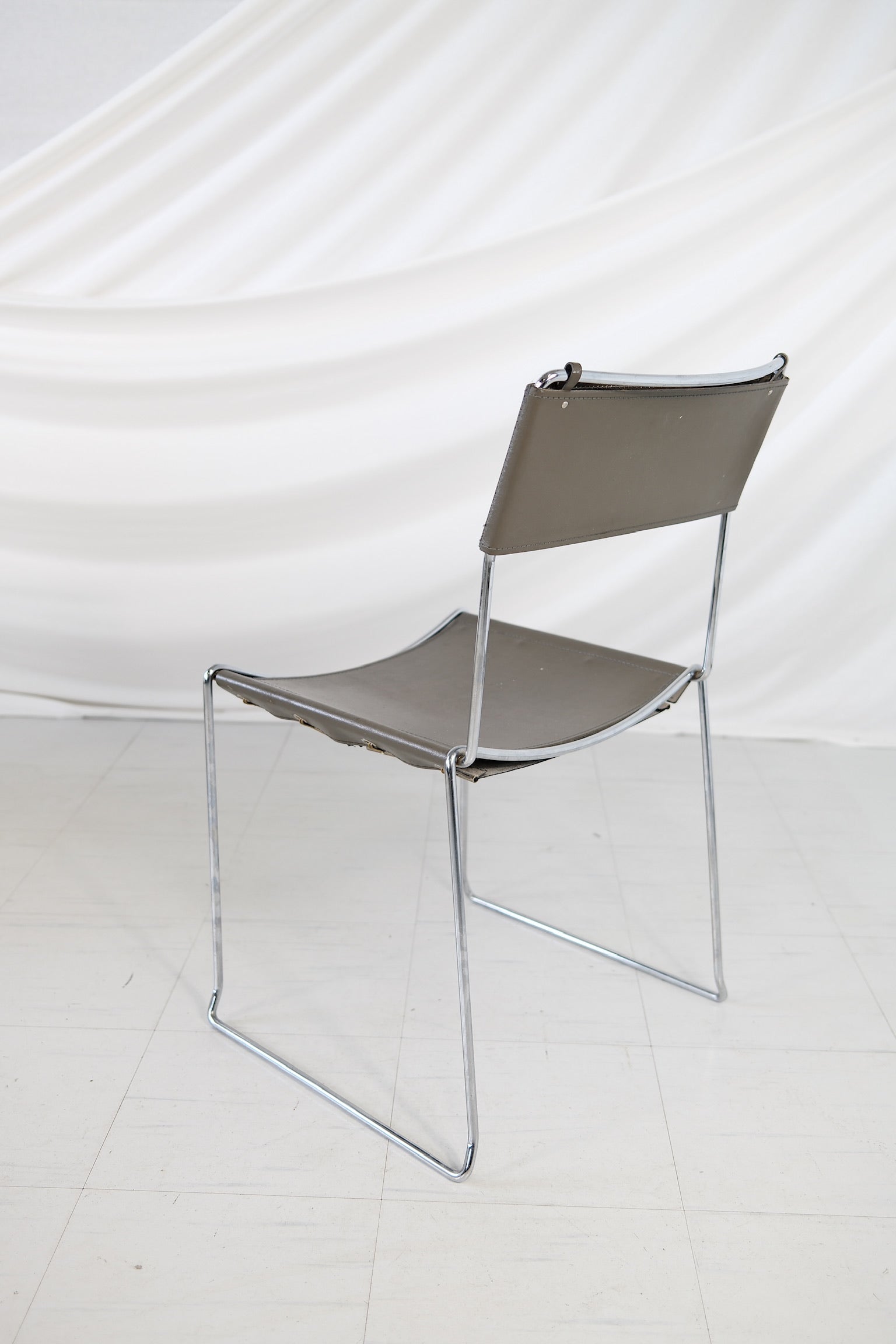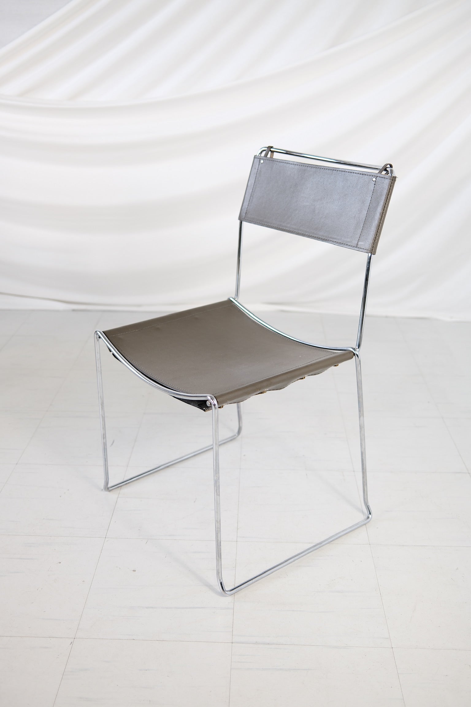 20世紀後半に作られたこの椅子は、洗練されたクロームメッキのスチールフレームに、グレーのレザーシートと背もたれを組み合わせました。ミニマルで軽やかなデザインは、洗練された素材によってさらに洗練されたものとなり、現代的なインテリアにもヴィンテージ風のインテリアにも完璧にマッチします。