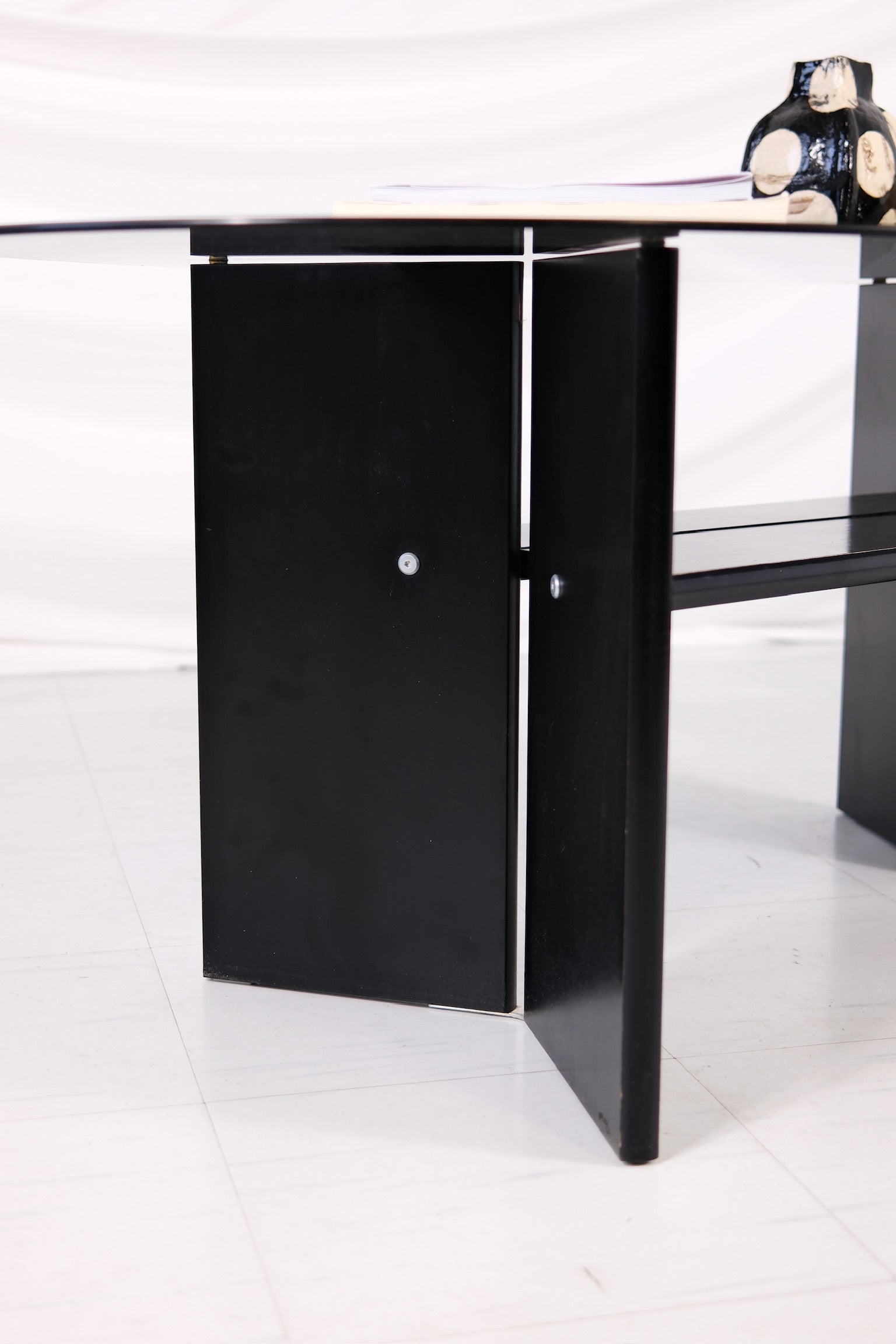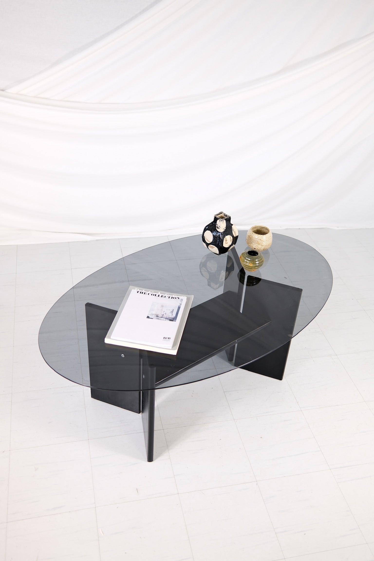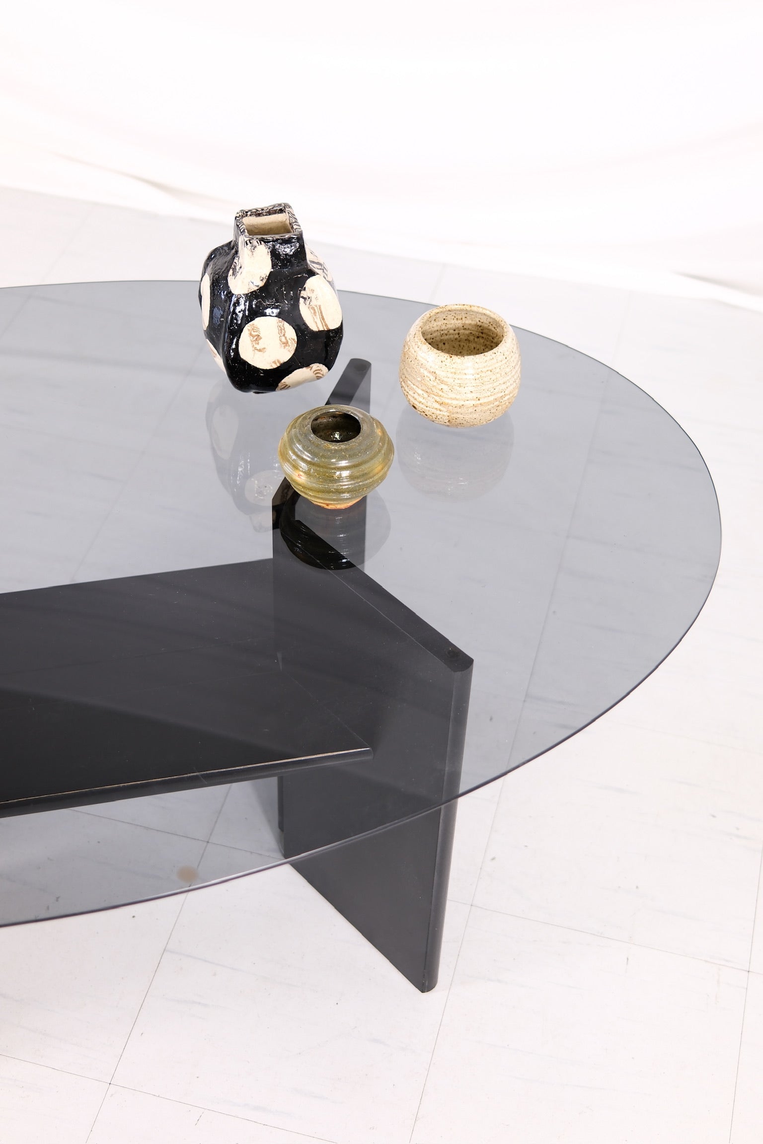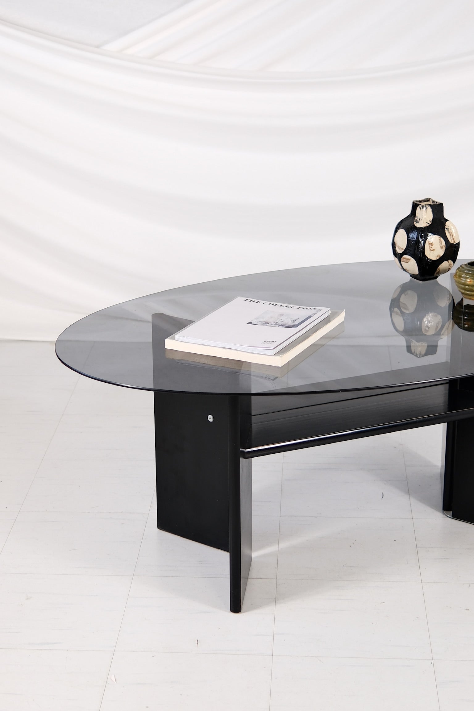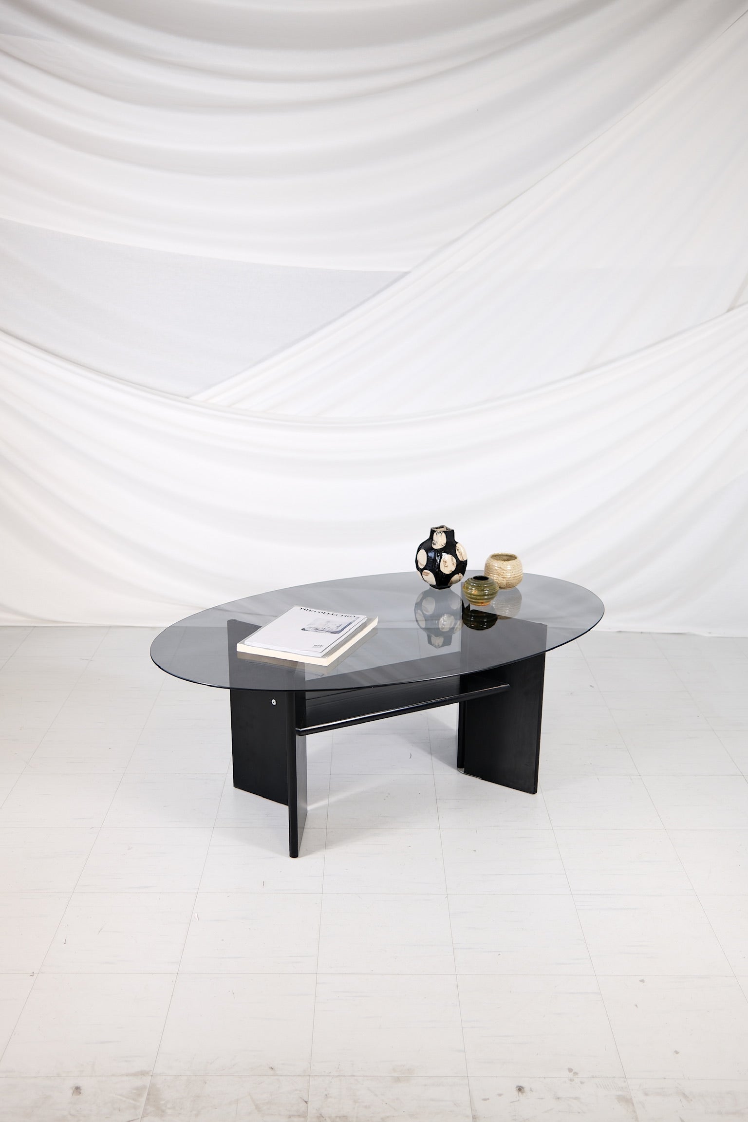 モダンなエレガンスと時代を超えた魅力が見事に調和した、印象的なイタリア製ヴィンテージコーヒーテーブル。楕円形のスモークガラスの天板と彫刻的な黒の木製ベースが、大胆でありながら洗練されたシルエットを演出します。