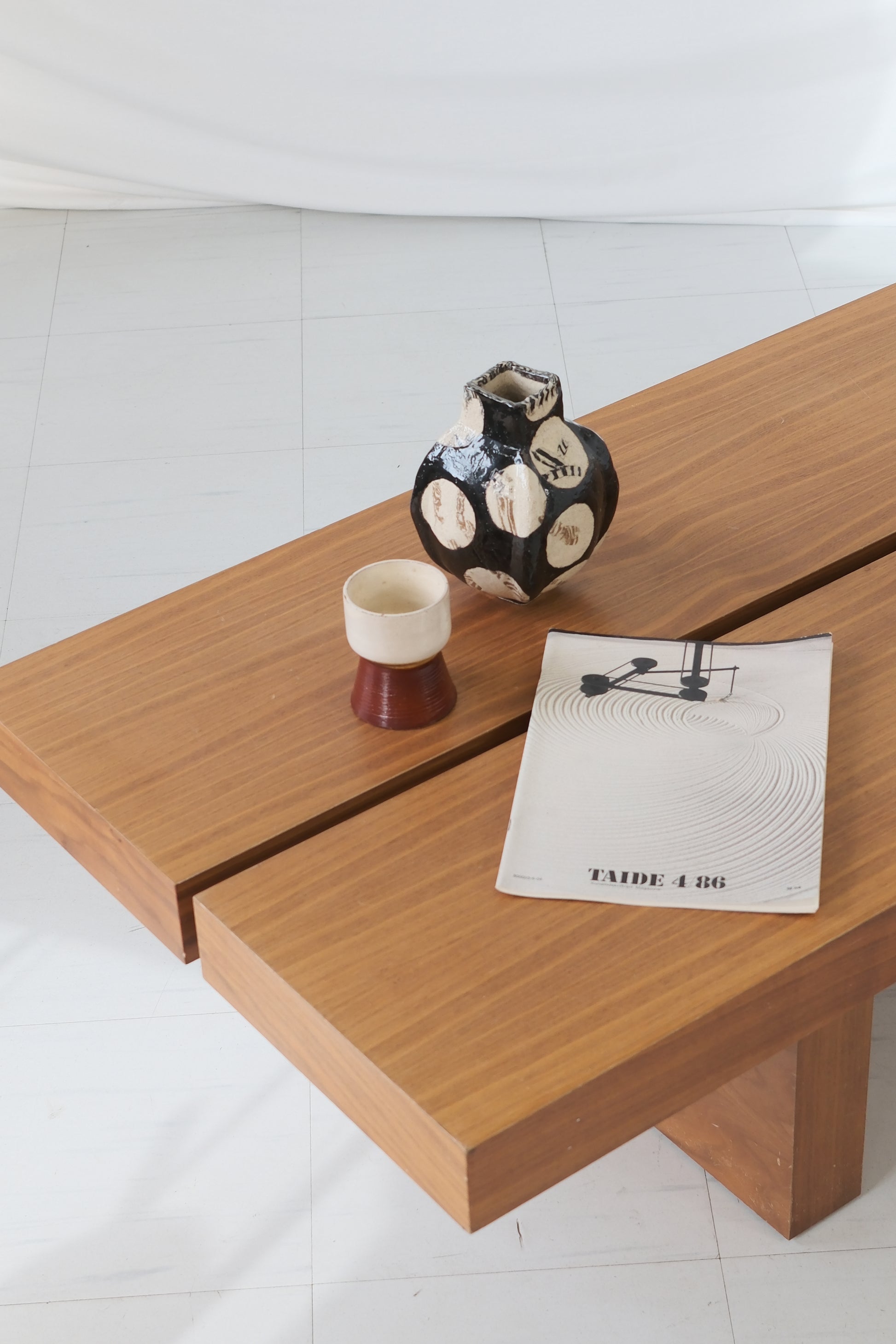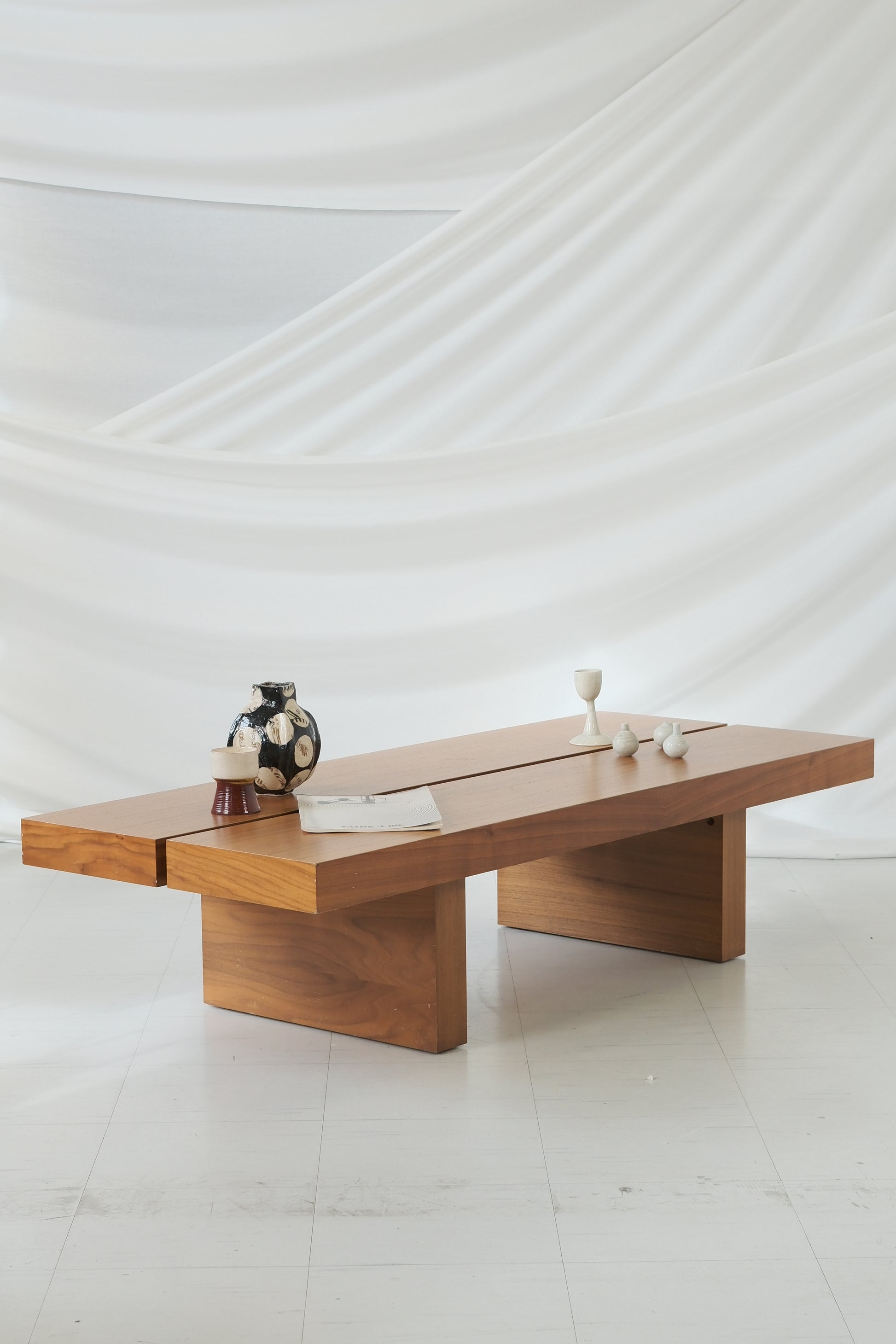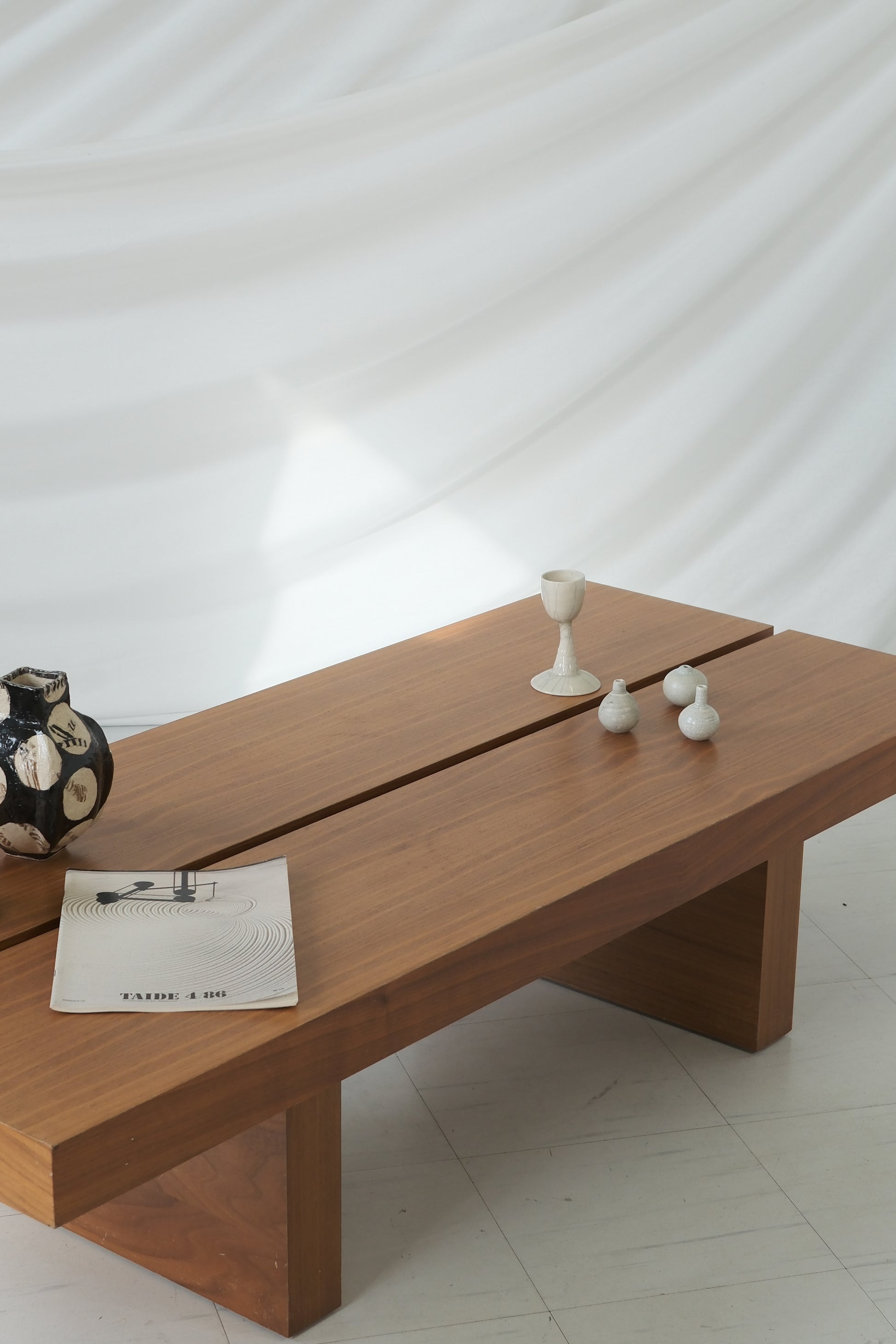 ミニマルでありながら彫刻的な印象のジャパニーズスタイルのコーヒーテーブル。すっきりとしたラインとバランスの取れたプロポーションが、落ち着いた建築的な存在感を醸し出し、中央の隙間のディテールが洗練されたモダンな雰囲気を醸し出しています。