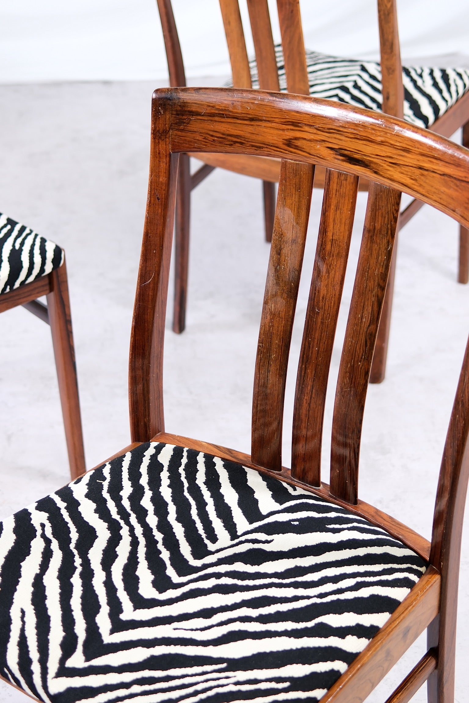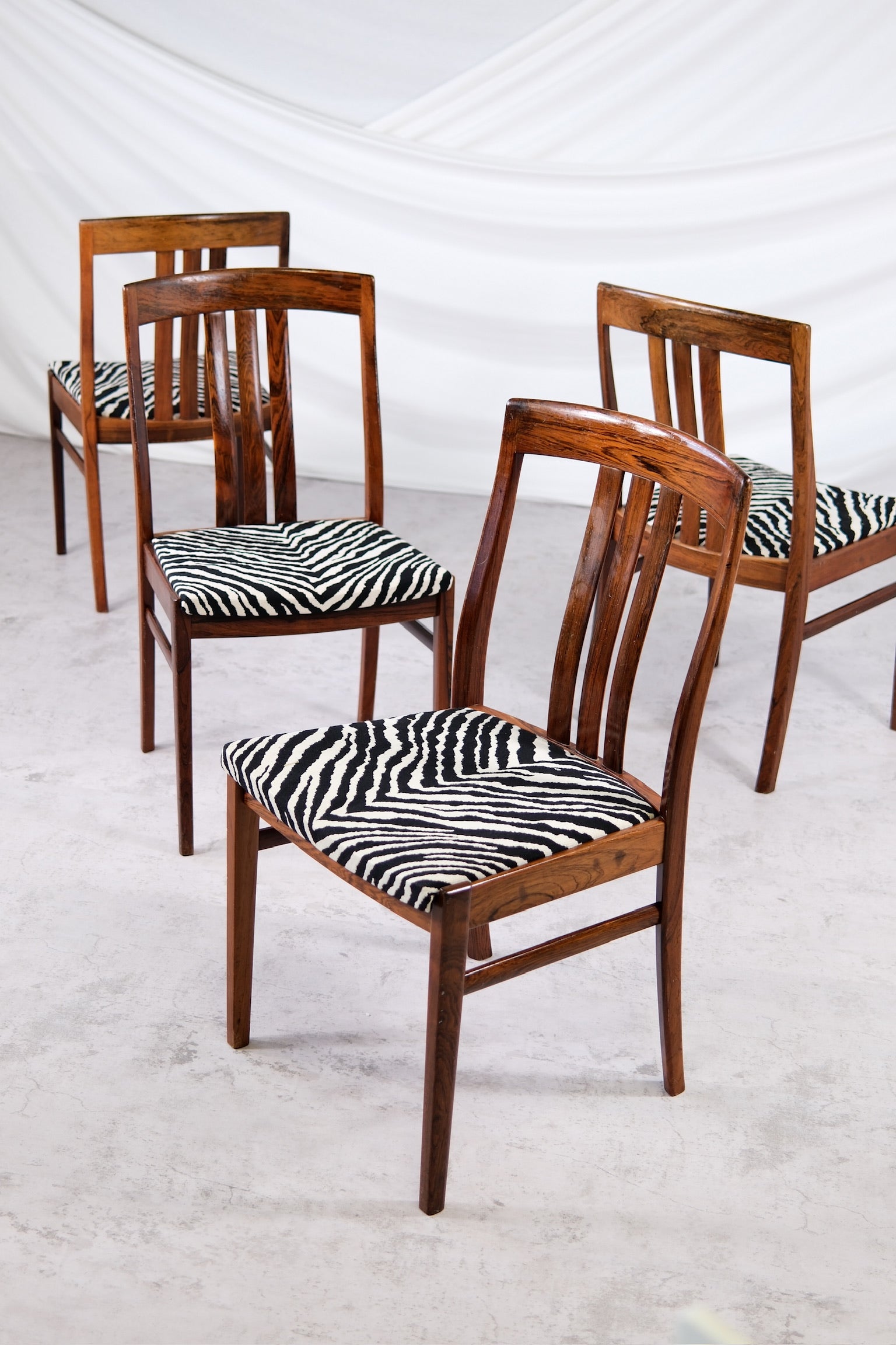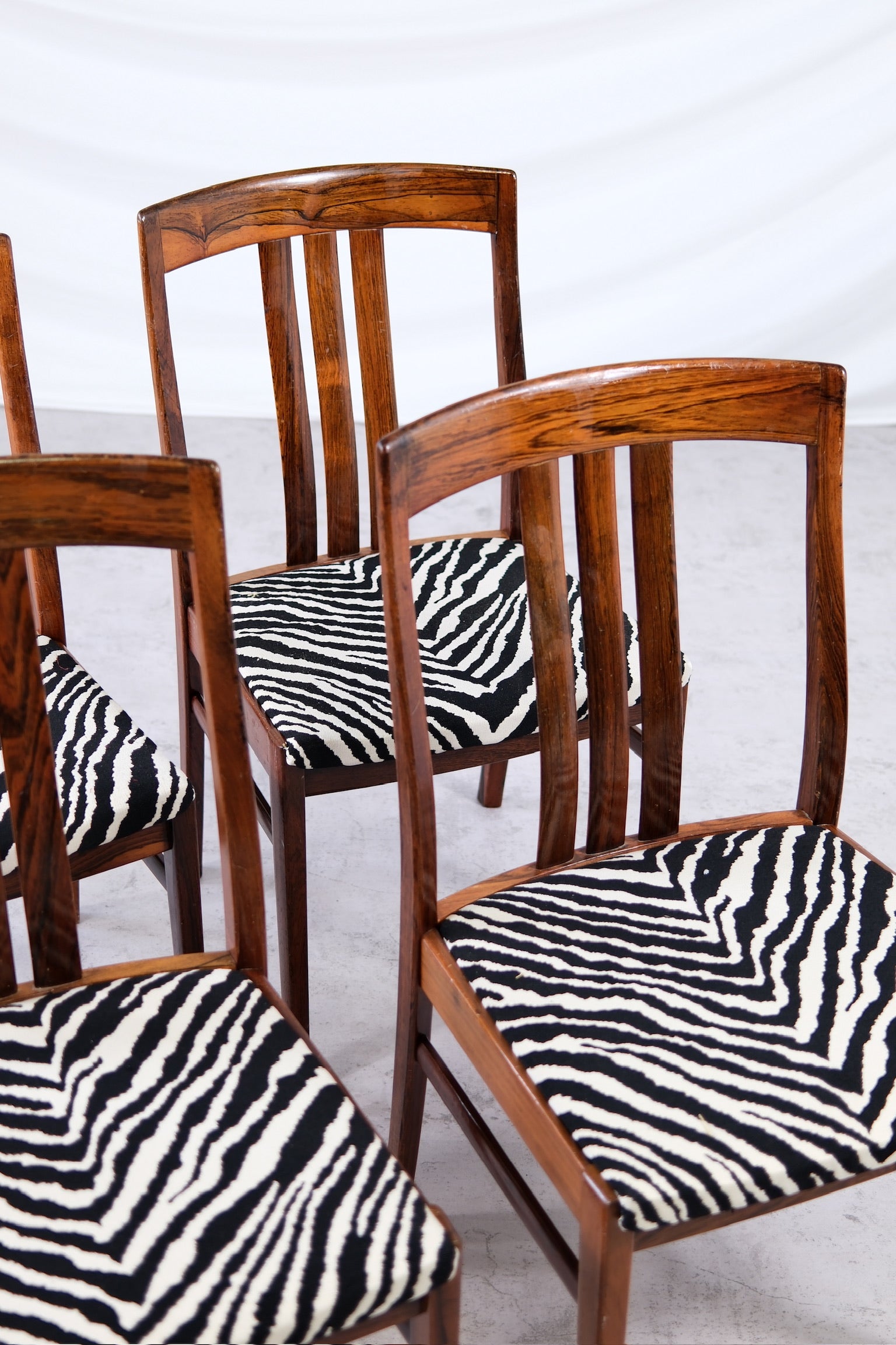 洗練されたヴィンテージダイニングチェアのセット。深みのある豊かな木目が美しいローズウッド無垢材のフレームで仕立てられています。ローズウッドの温かみのある色合いと、印象的なゼブラ柄の張地が美しく調和し、どんなインテリアにも大胆でありながら時代を超越した存在感を放ちます。