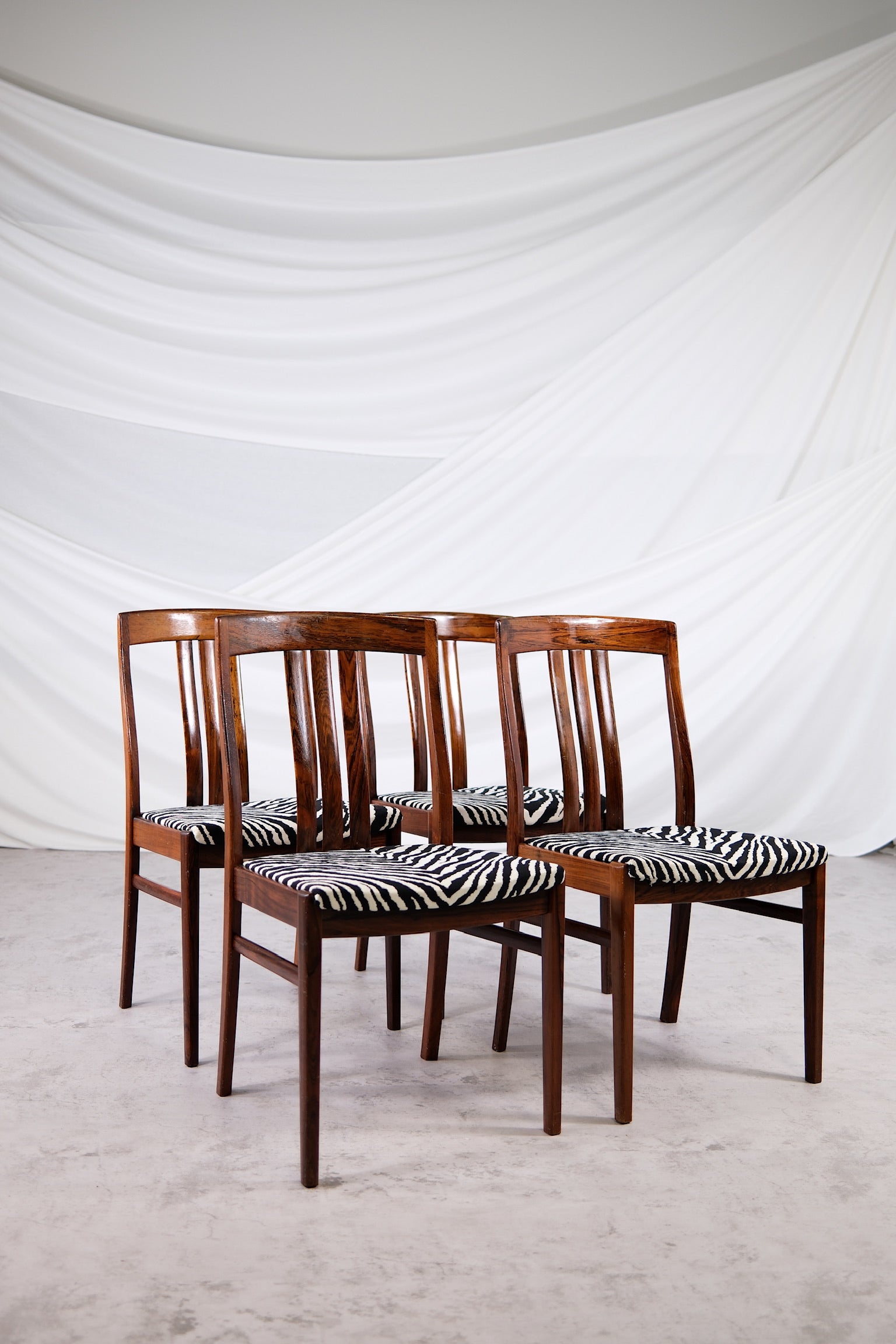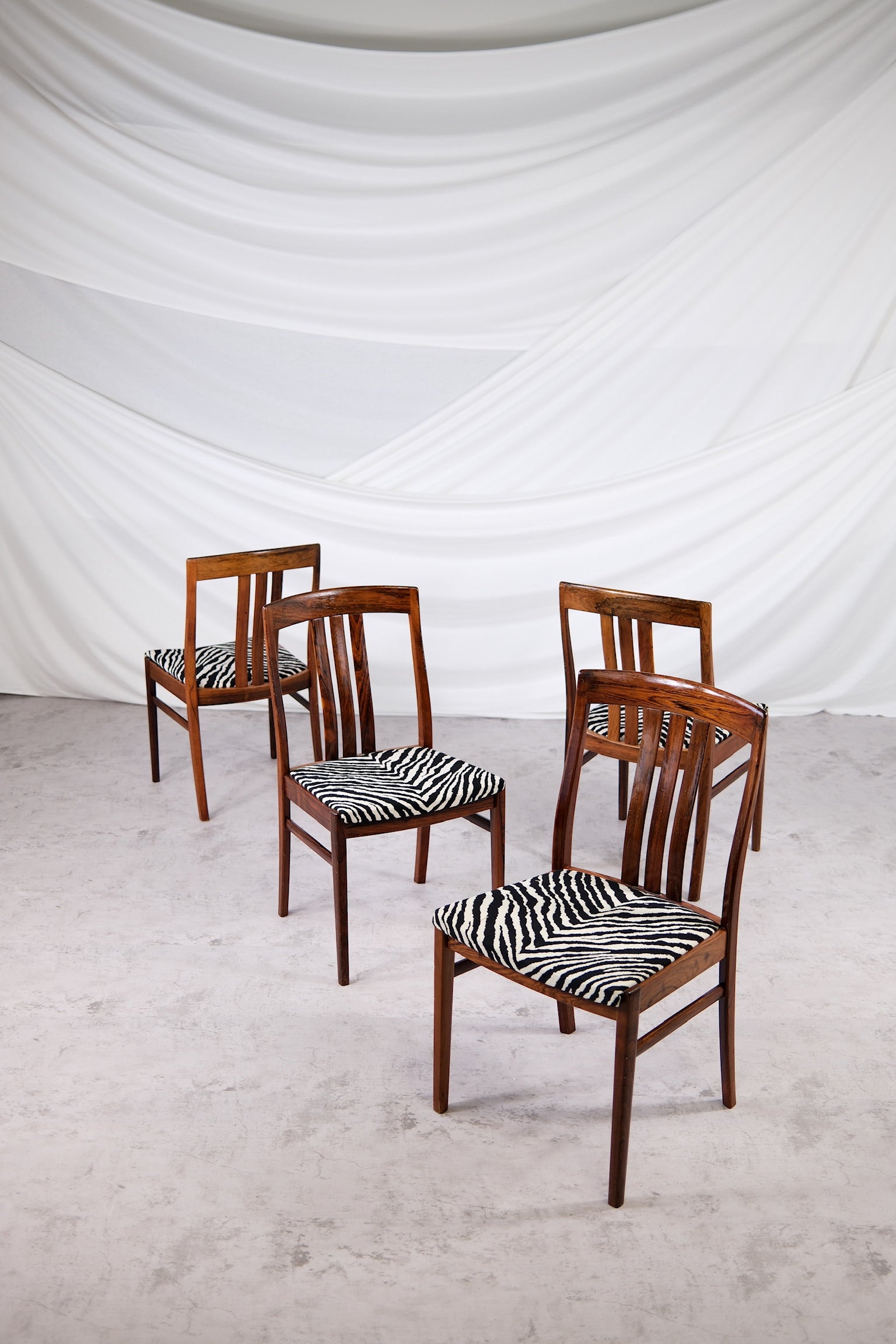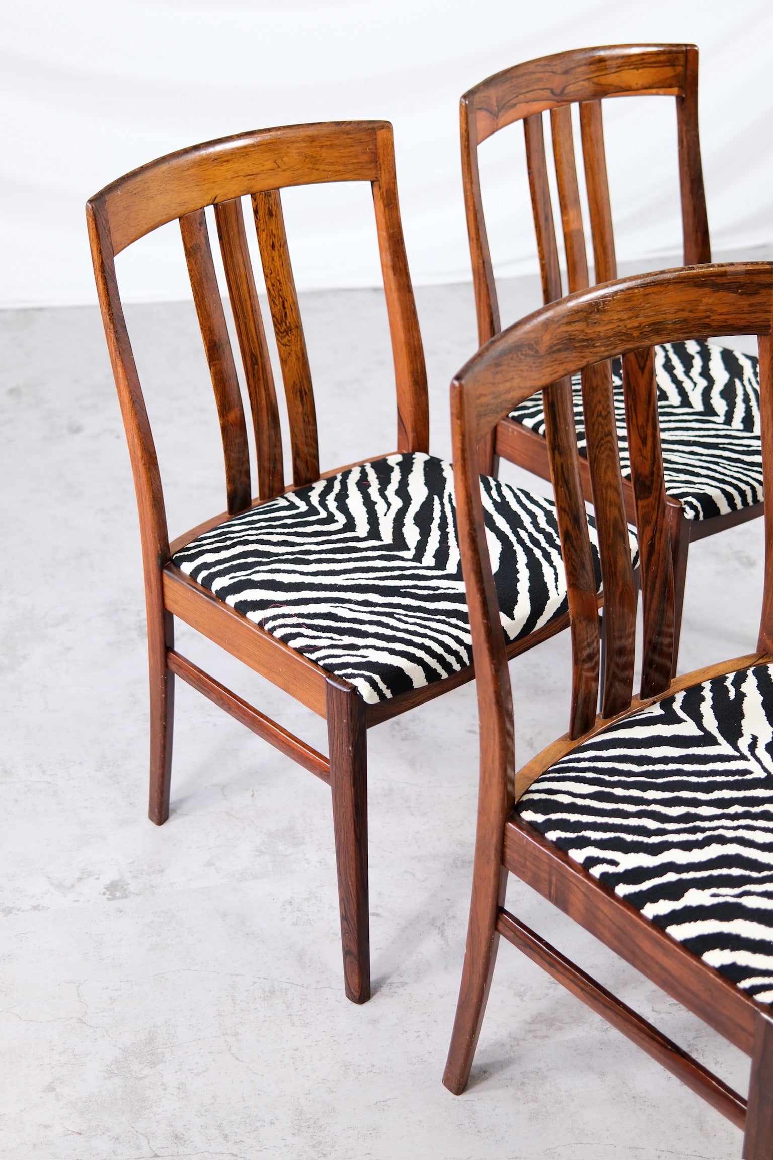 洗練されたヴィンテージダイニングチェアのセット。深みのある豊かな木目が美しいローズウッド無垢材のフレームで仕立てられています。ローズウッドの温かみのある色合いと、印象的なゼブラ柄の張地が美しく調和し、どんなインテリアにも大胆でありながら時代を超越した存在感を放ちます。