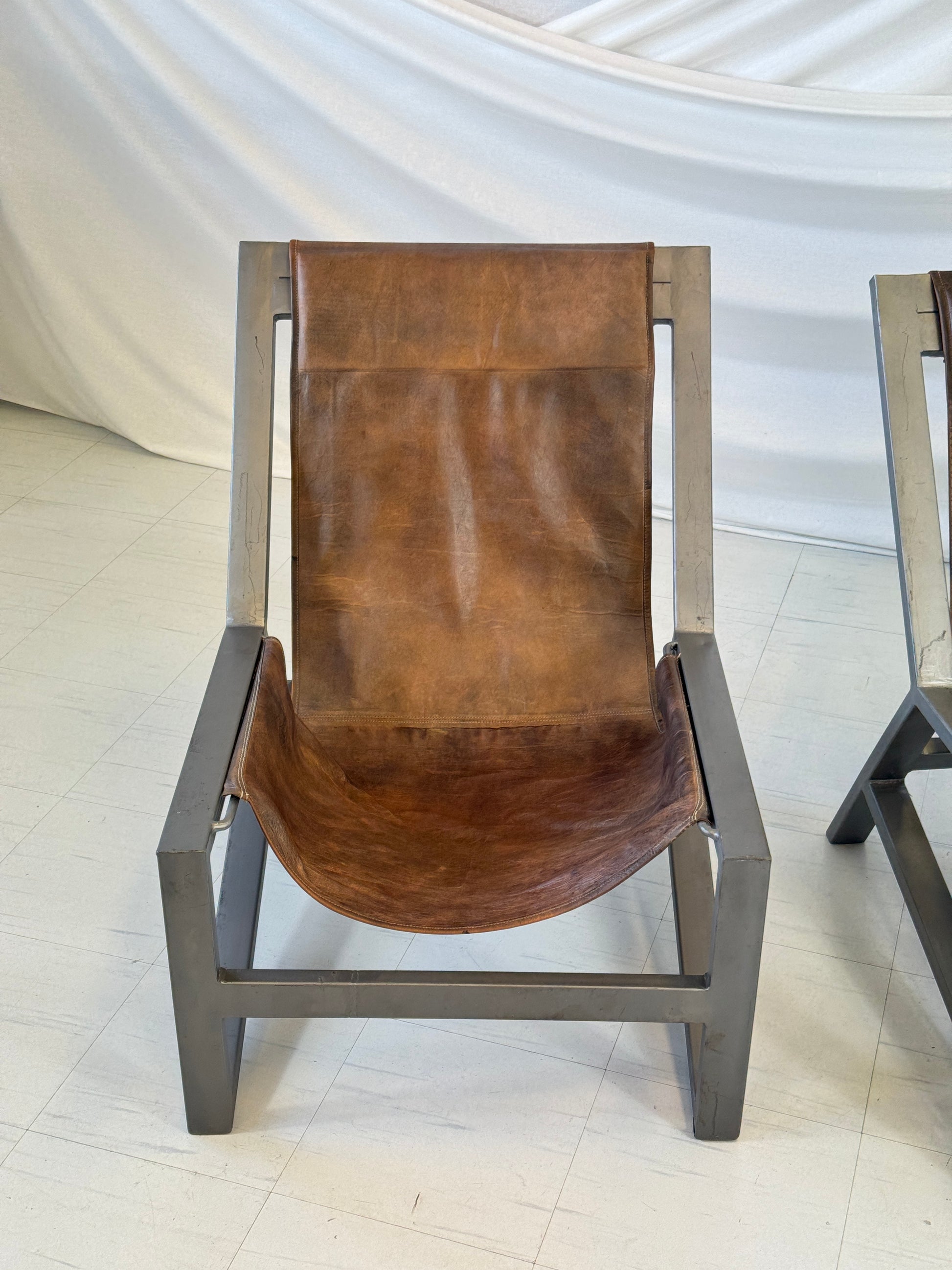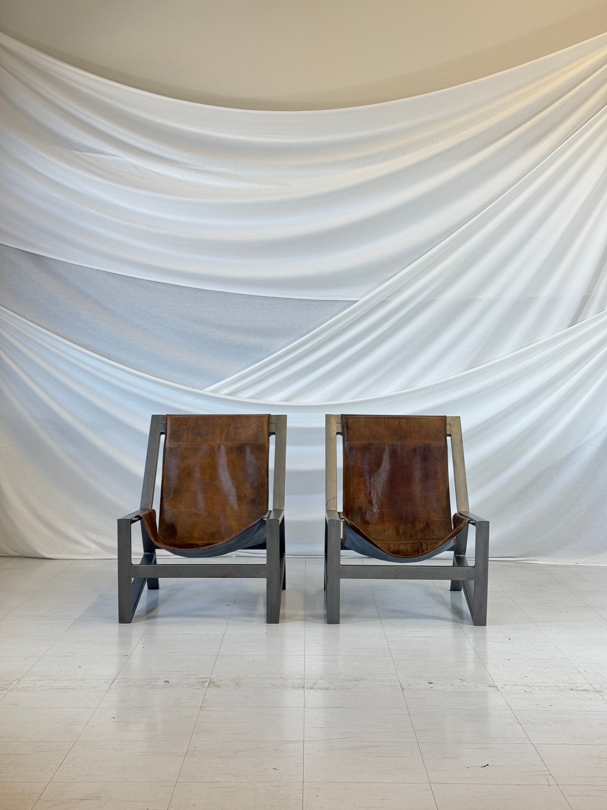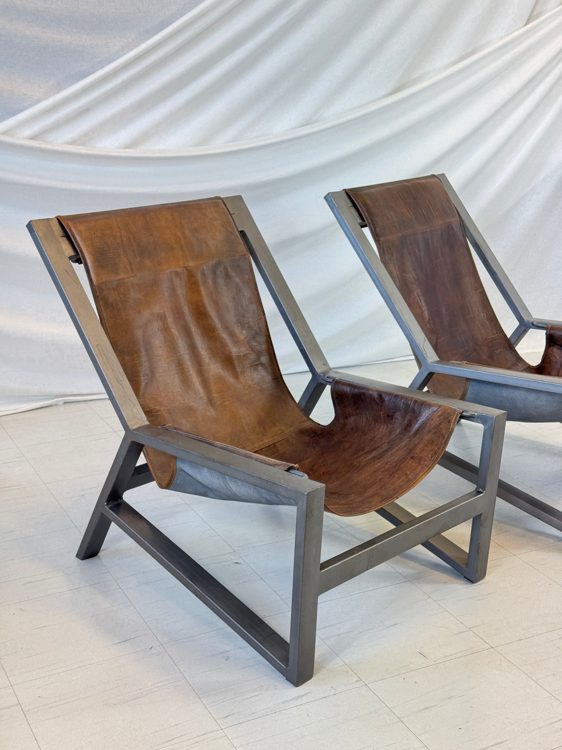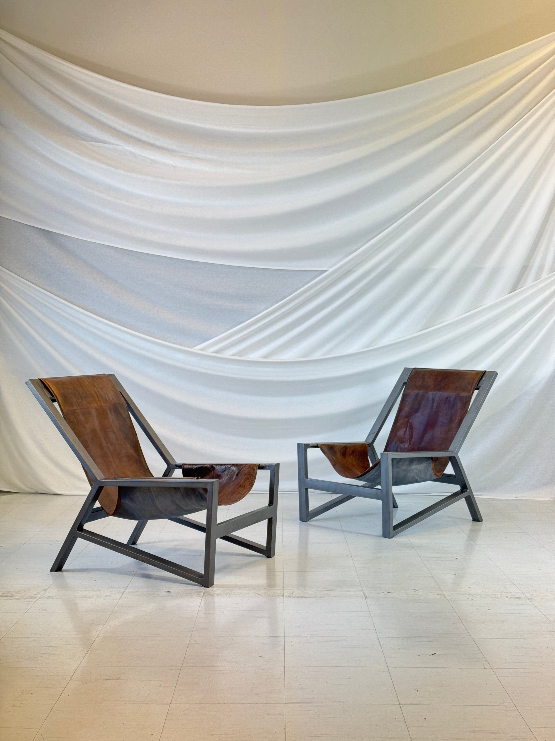 彫刻的で、自信があり、穏やか。 この印象的なスリングラウンジチェア2脚は、力強い幾何学的形状と落ち着いたエレガンスを融合させています。落ち着いたチャコールトーンに仕上げられた角張ったスチールフレームは、重厚なブラウンレザーのスリングの豊かな風合いと美しいコントラストを織りなします。スリングは、まるで柔らかなハンモックのように、構造の中で吊り下げられています。ミニマルでありながら落ち着いた雰囲気を醸し出すこれらのチェアは、静寂の中に存在感を放ちます。