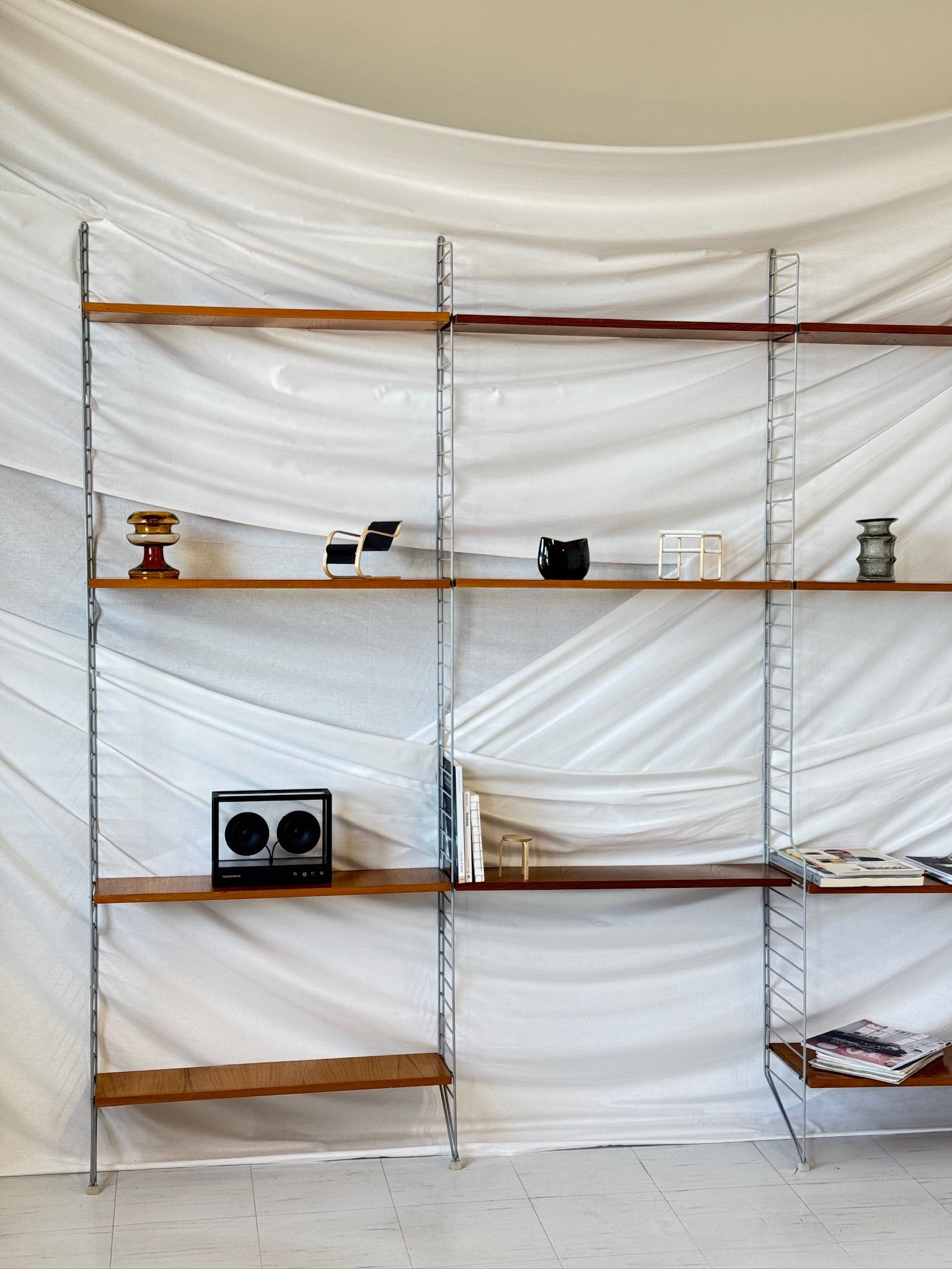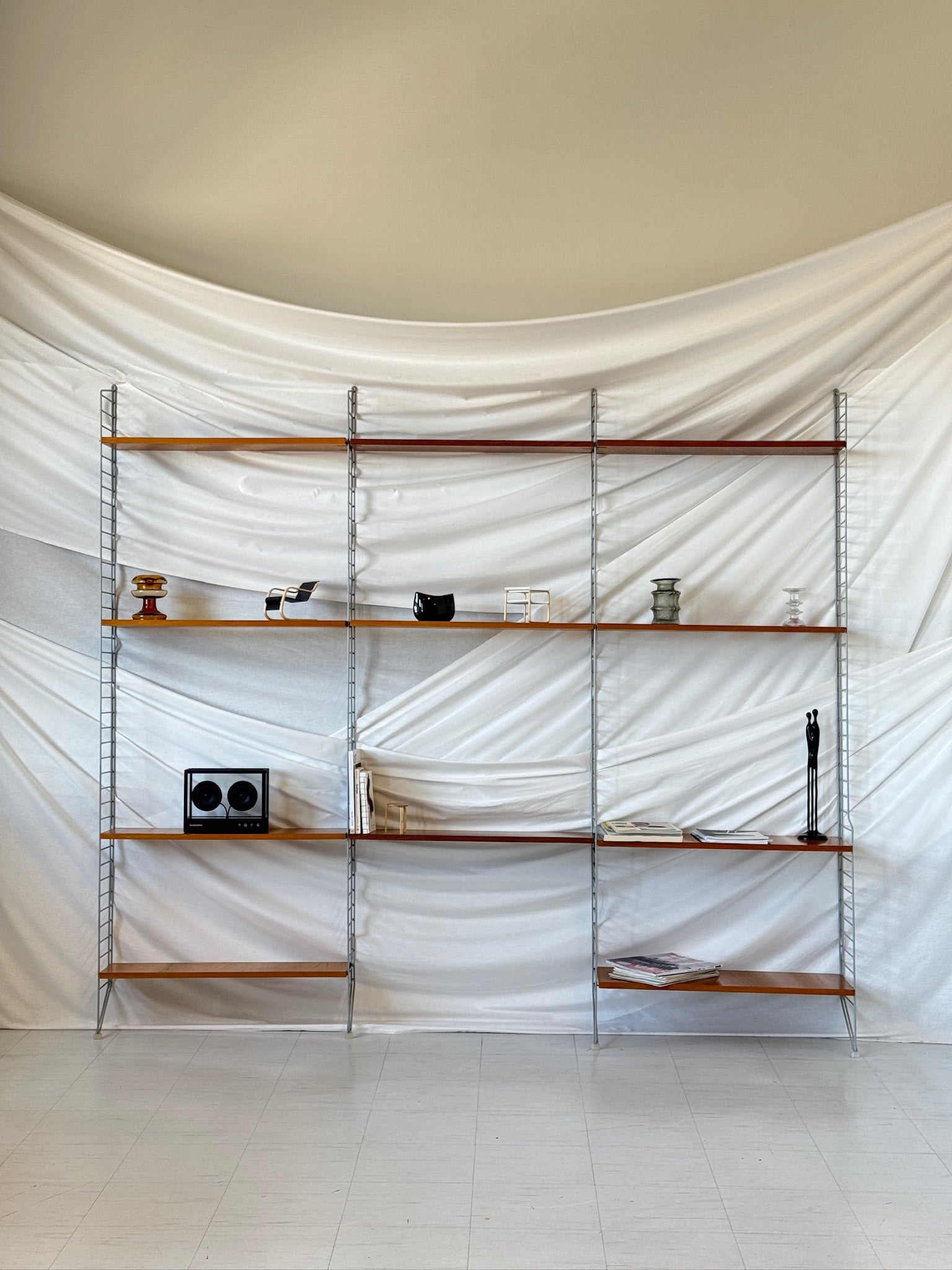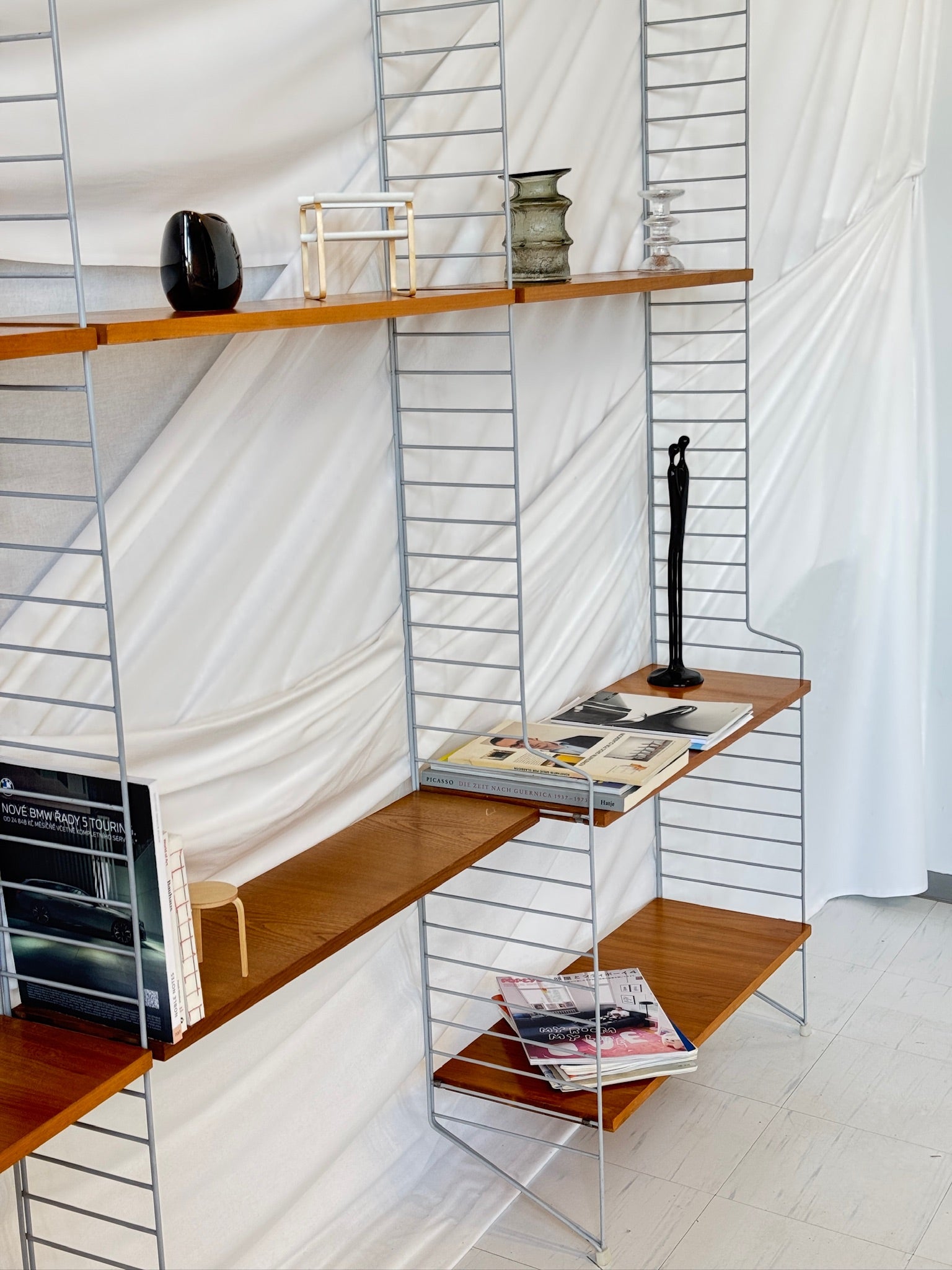 象徴的なストリングデザインを彷彿とさせる、大きくエレガントなヴィンテージシェルフシステム。3ベイ構成で、金属製の支柱5本とチーク材の突板棚11枚を備えています。ミニマルな構造と温かみのある木目調が、モダンなインテリアにもクラシックなインテリアにもマッチする、多用途の収納・ディスプレイソリューションです。