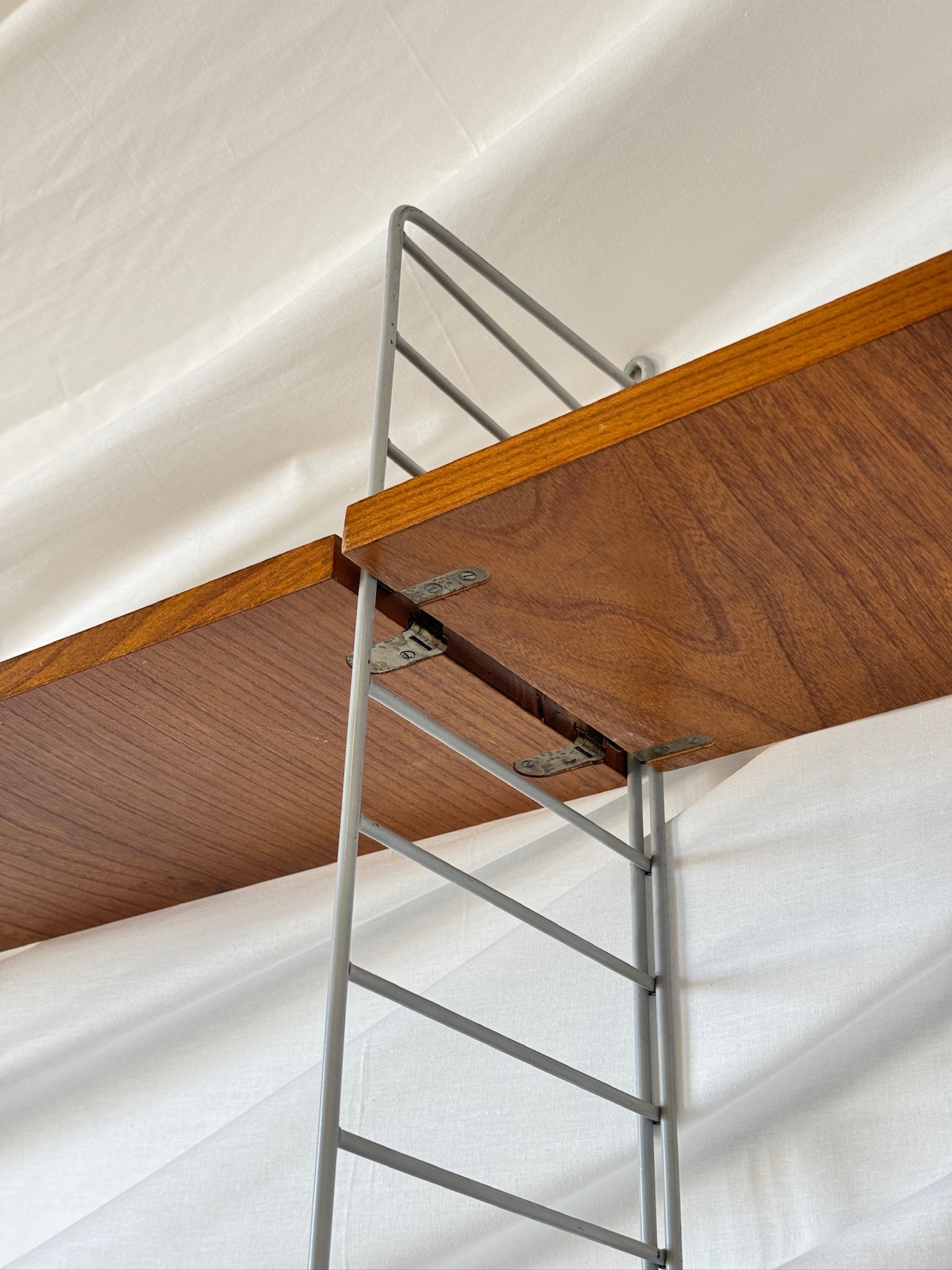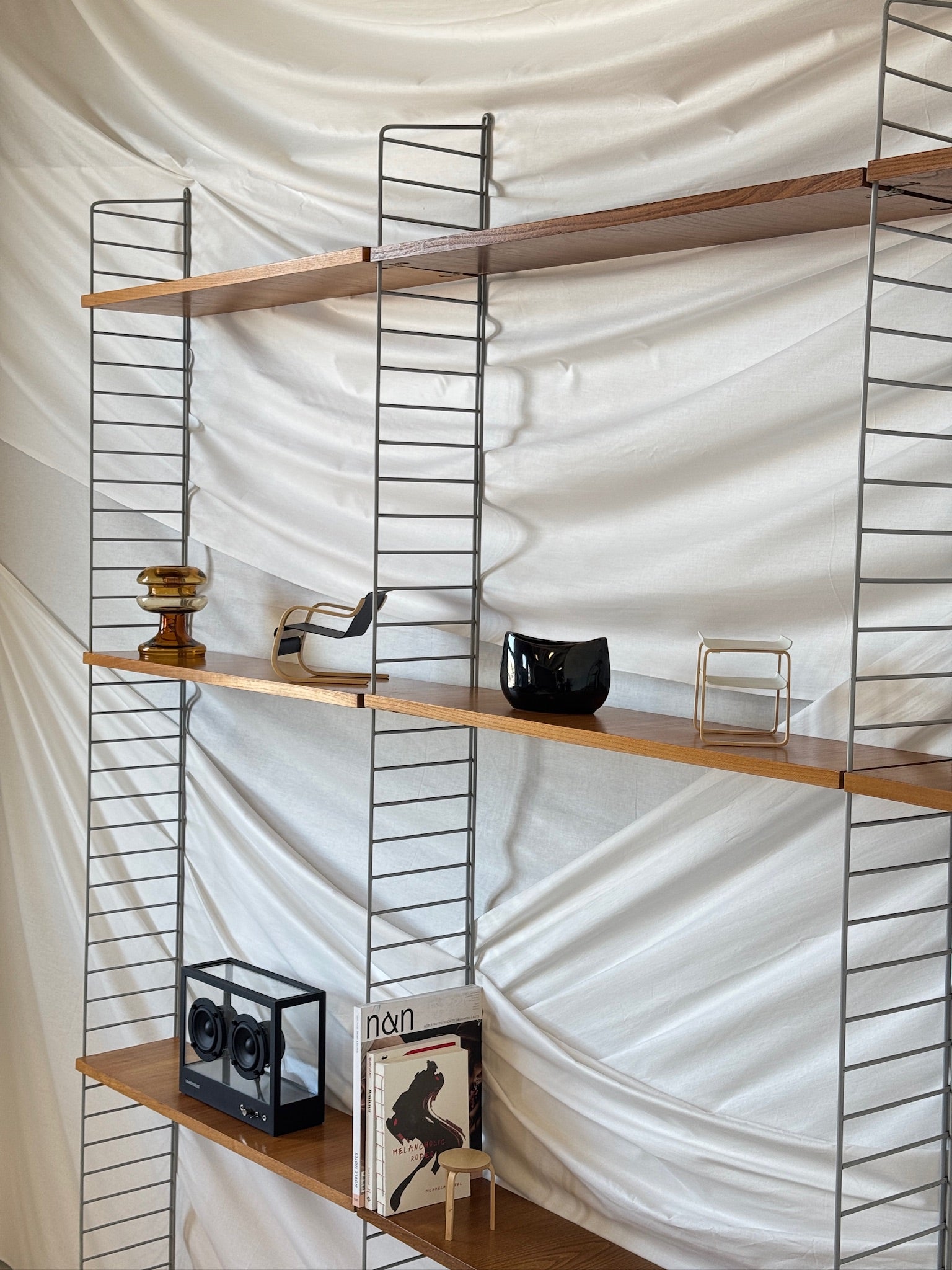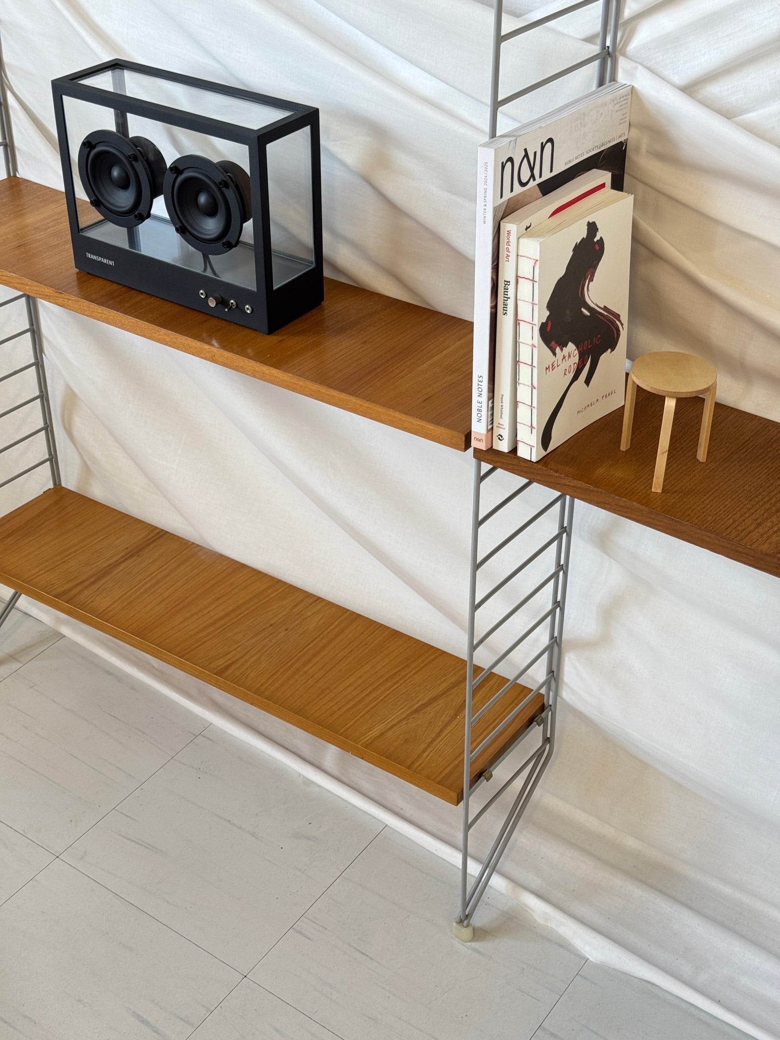 象徴的なストリングデザインを彷彿とさせる、大きくエレガントなヴィンテージシェルフシステム。3ベイ構成で、金属製の支柱5本とチーク材の突板棚11枚を備えています。ミニマルな構造と温かみのある木目調が、モダンなインテリアにもクラシックなインテリアにもマッチする、多用途の収納・ディスプレイソリューションです。