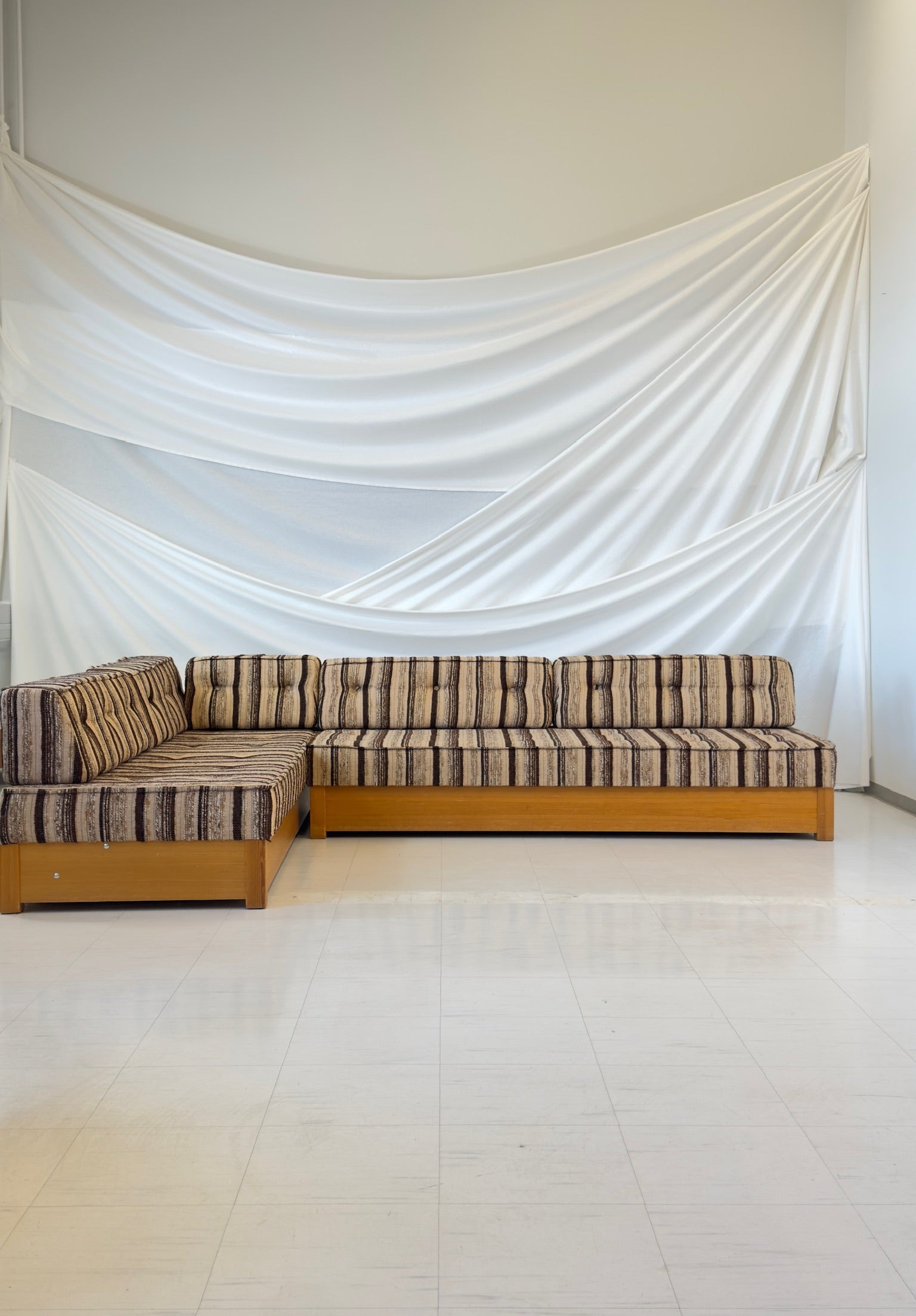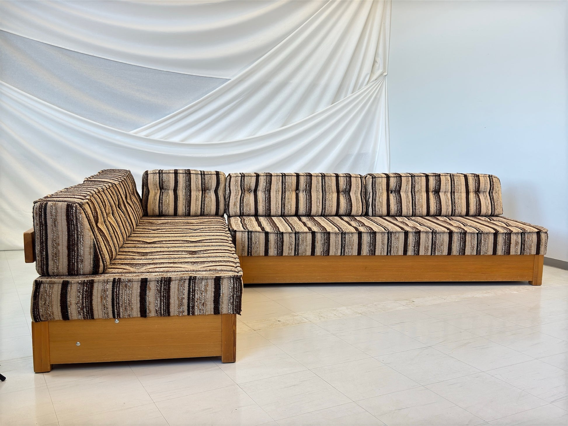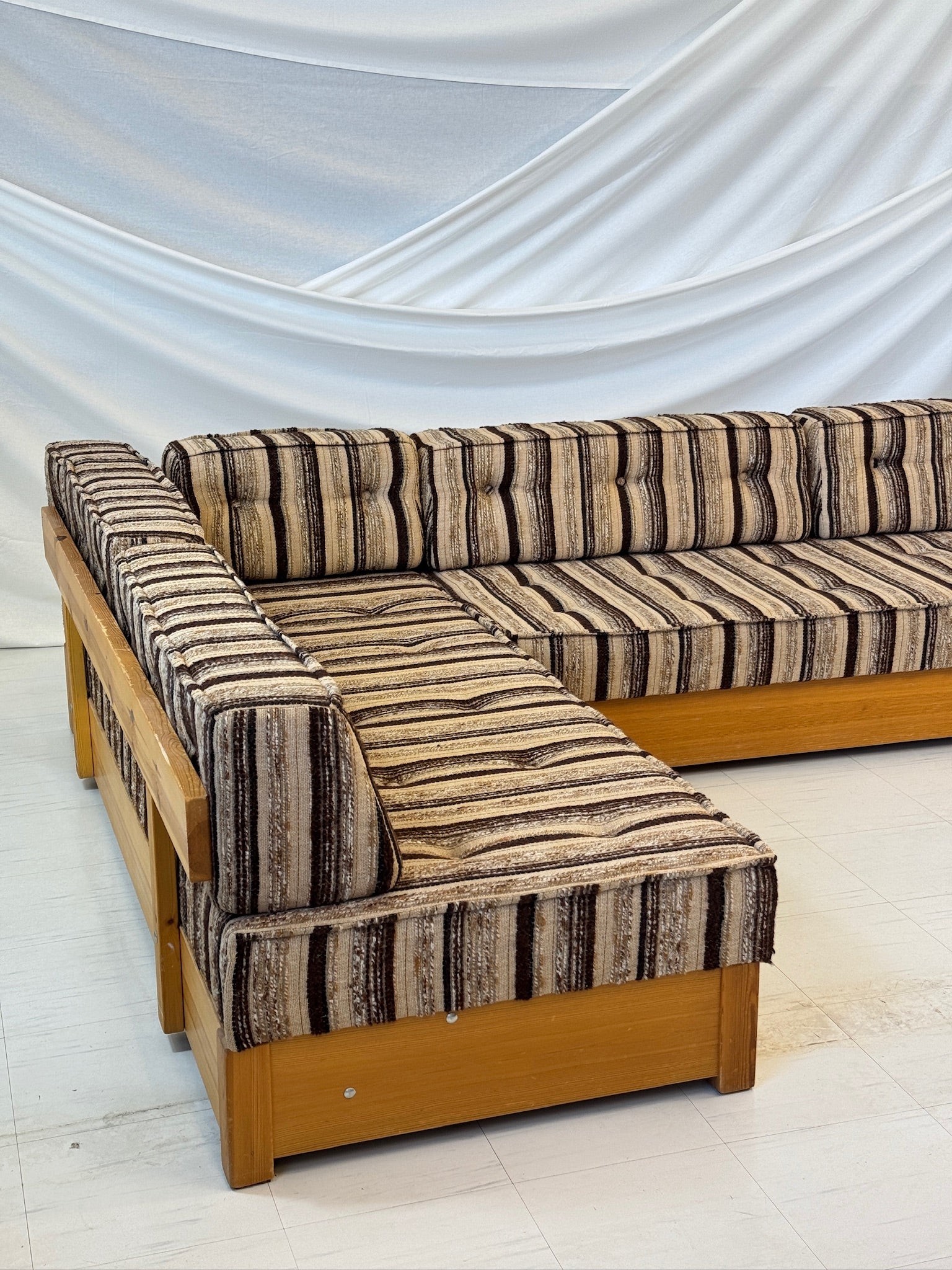 フィンランドのブランド、Vilkaが1960年代にデザインしたこのモジュール式ソファは、すっきりとしたラインが特徴のスカンジナビア・モダニズムを体現しています。堅牢なパイン材のフレームが、ゆったりとしたサイズ感のウール張りのオリジナルシートモジュールを支えています。コーナーパーツや直線パーツなど、柔軟なレイアウトが可能なため、リビングスペースに合わせて自在にアレンジできます。