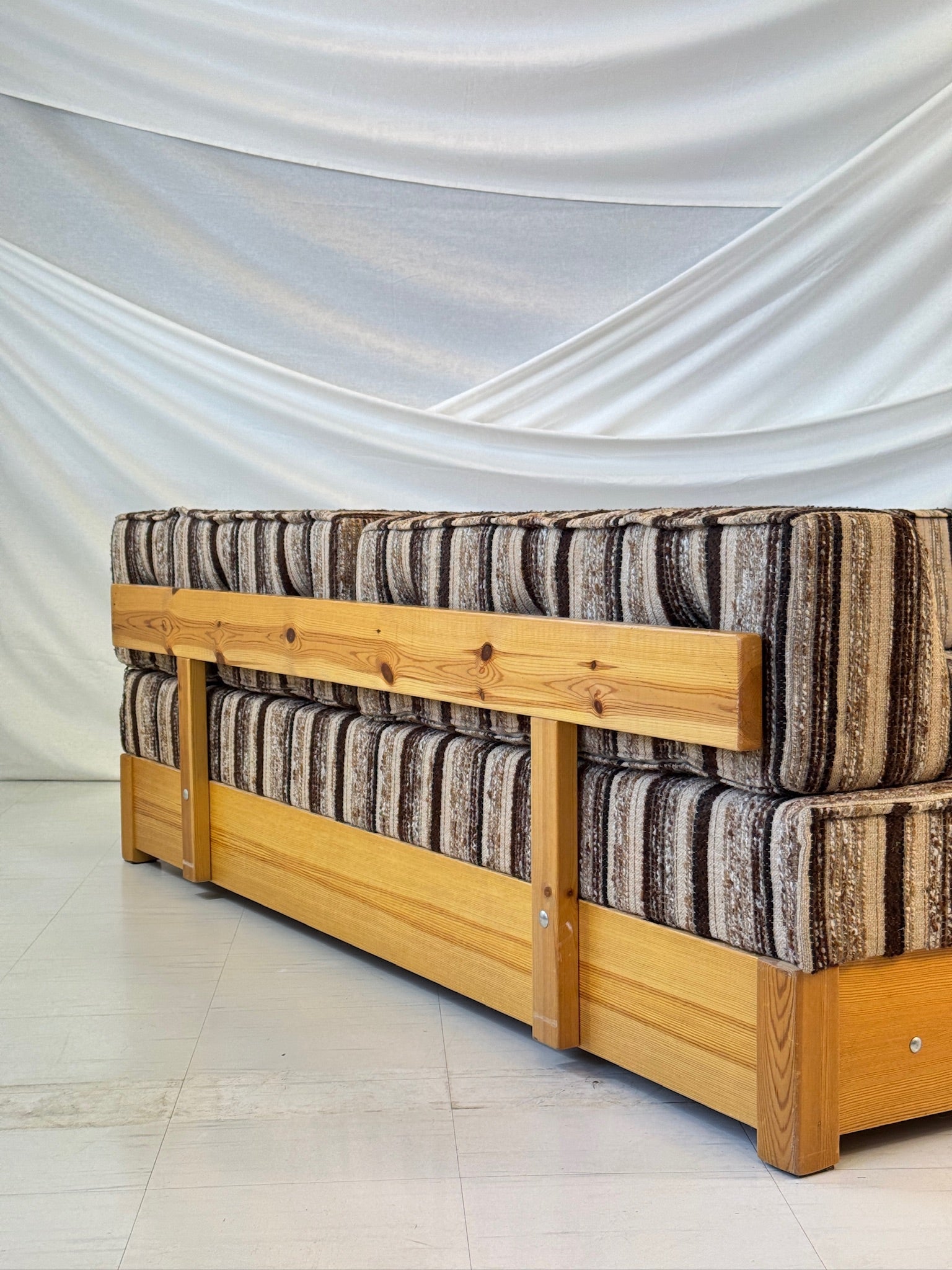 こちらの家具はヴィンテージ品として良好なコンディションです。パイン材のフレームには温かみのある古色が見られ、経年によるわずかな表面の摩耗が見られます。張り地はわずかな使用感はあるものの、無傷の状態です。詳細については、詳細な写真をご覧ください。