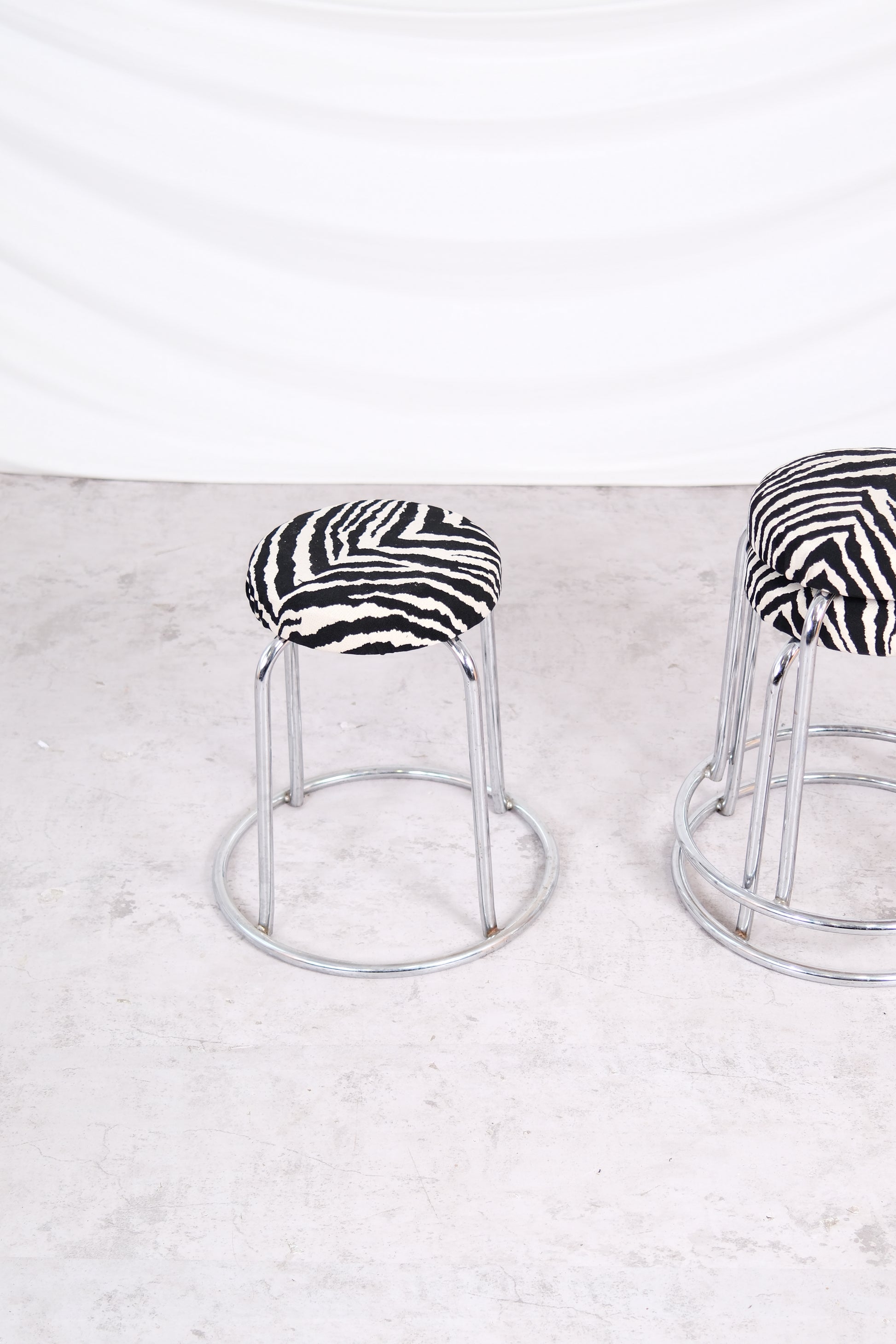 Playful yet sophisticated, these vintage bar stools feature zebra-patterned upholstery paired with a polished chrome frame. The combination of bold fabric and sleek metal gives them a unique character that works beautifully in both modern and eclectic interiors.