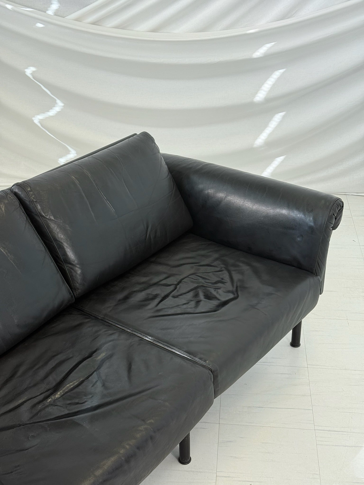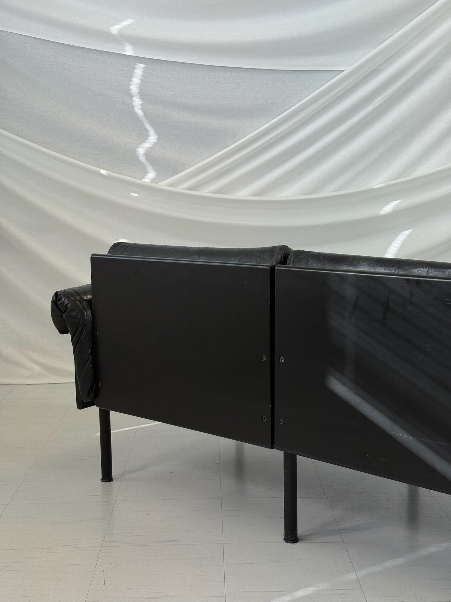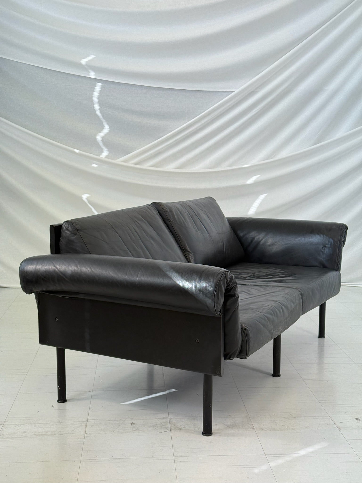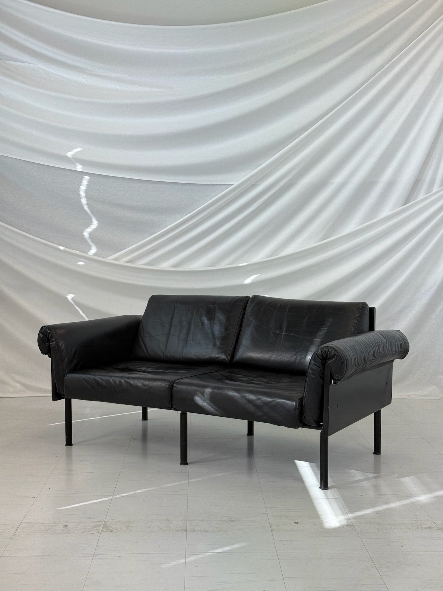 1960年代にユルヨ・クッカプロがハイミのためにデザインしたアテルジェーソファは、フィンランドのモダニズムデザインを代表する作品の一つです。この2人掛けソファは、オリジナルのブラックレザーの張地、円筒形のアームレスト、マットブラックのスチールパイプフレームとラッカー仕上げのサイドパネルが特徴です。