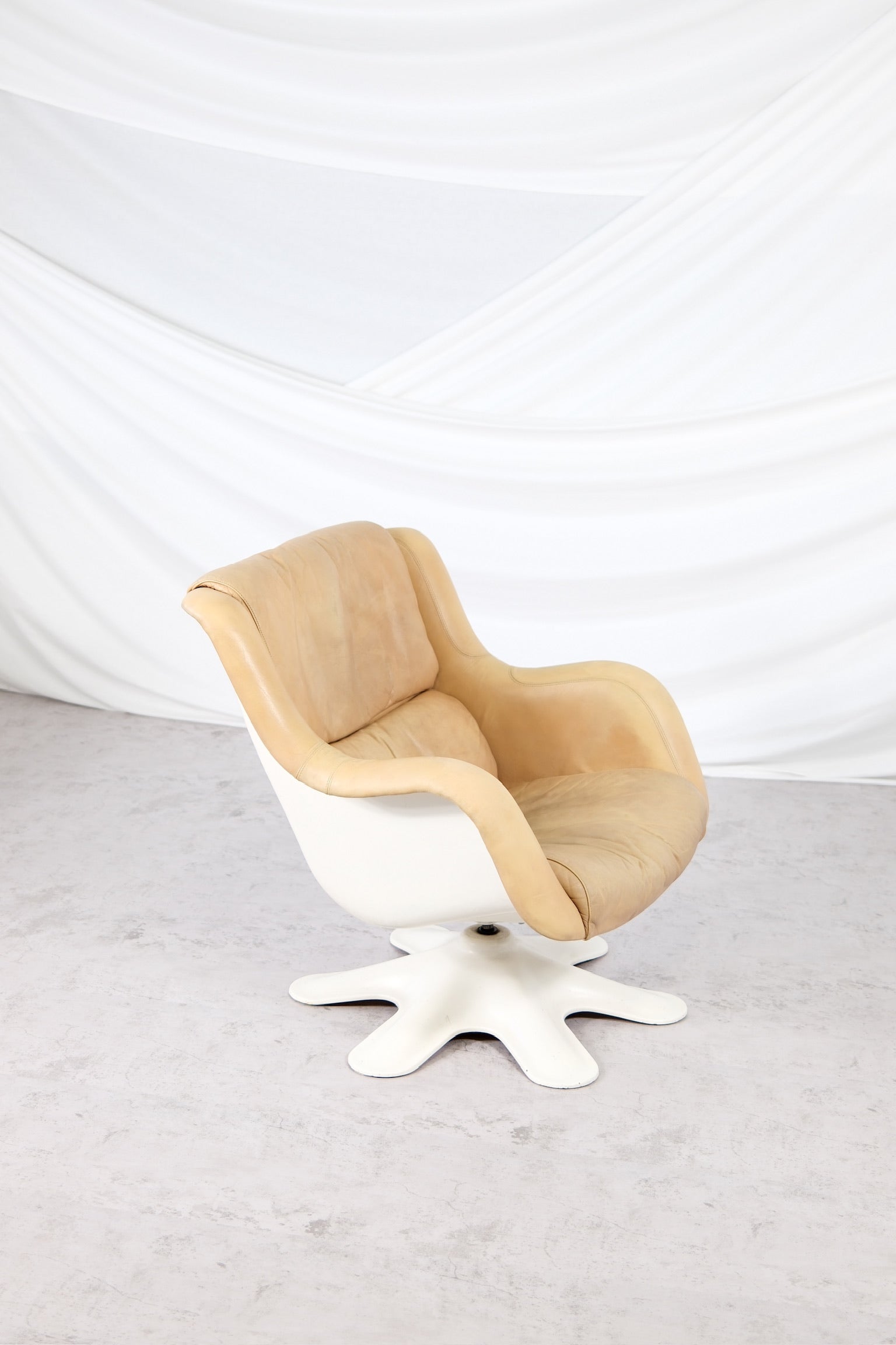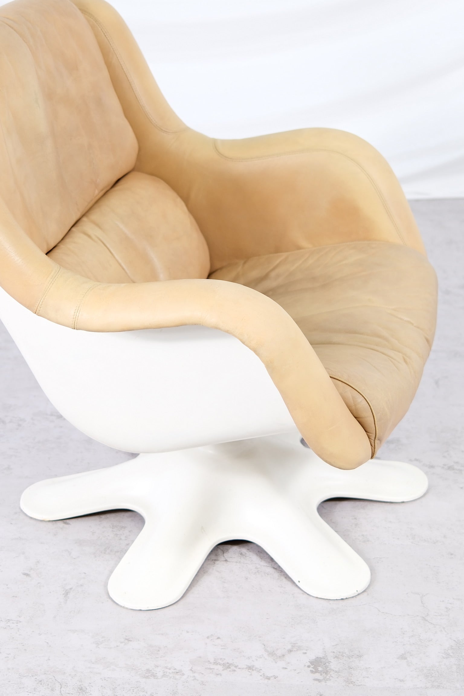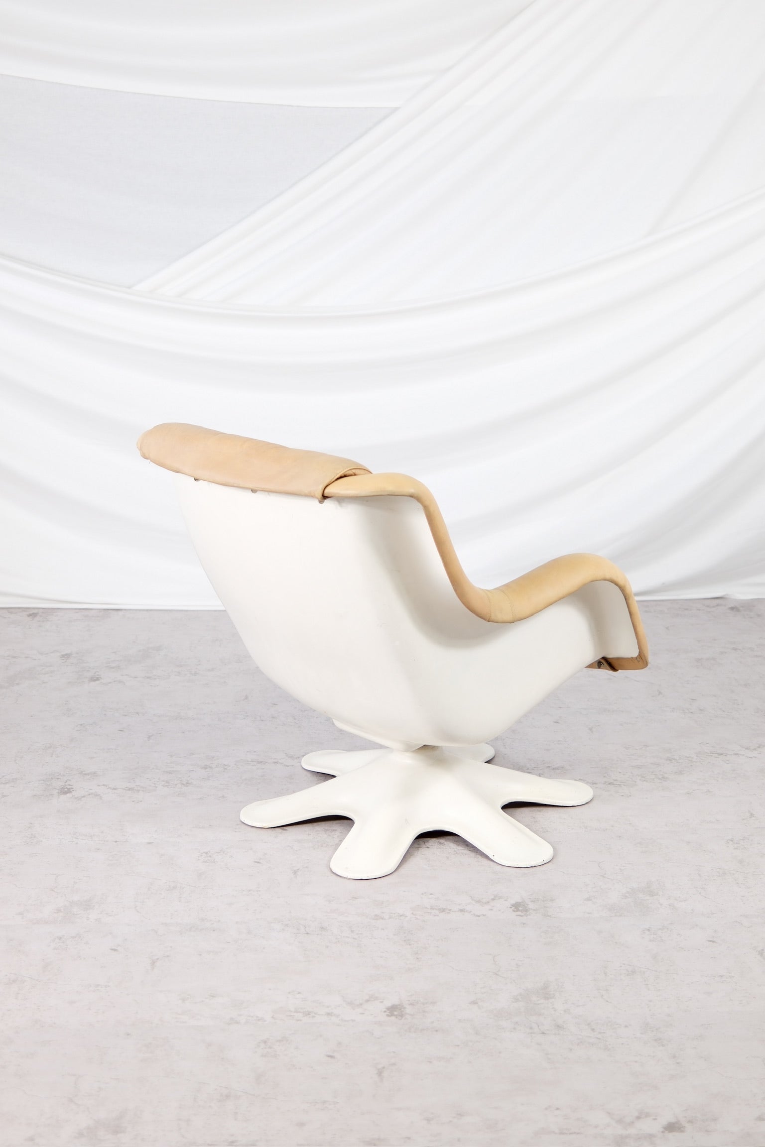 フィンランドモダンデザインの真のアイコンとも言える、ユルヨ・クッカプロによる418ピック・カルセリラウンジチェアは、有機的なフォルムと卓越した快適性を体現しています。1960年代にデザインされたこのチェアは、彫刻的な白いファイバーグラスシェルと星型の回転ベース、そしてヌガートーンのオリジナルレザー張りが特徴です。レザーは、時を経て温かみのある自然な風合いを醸し出しています。