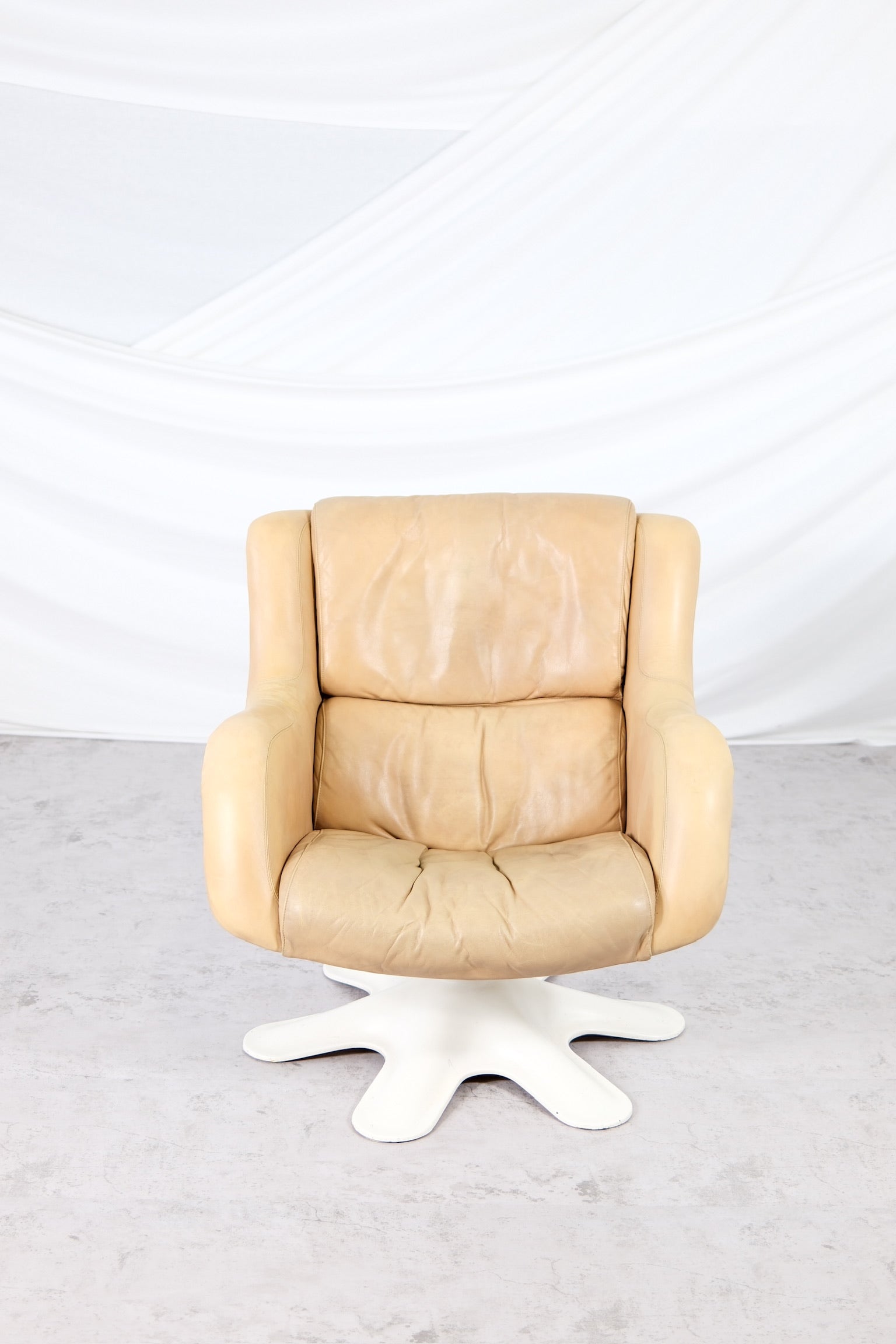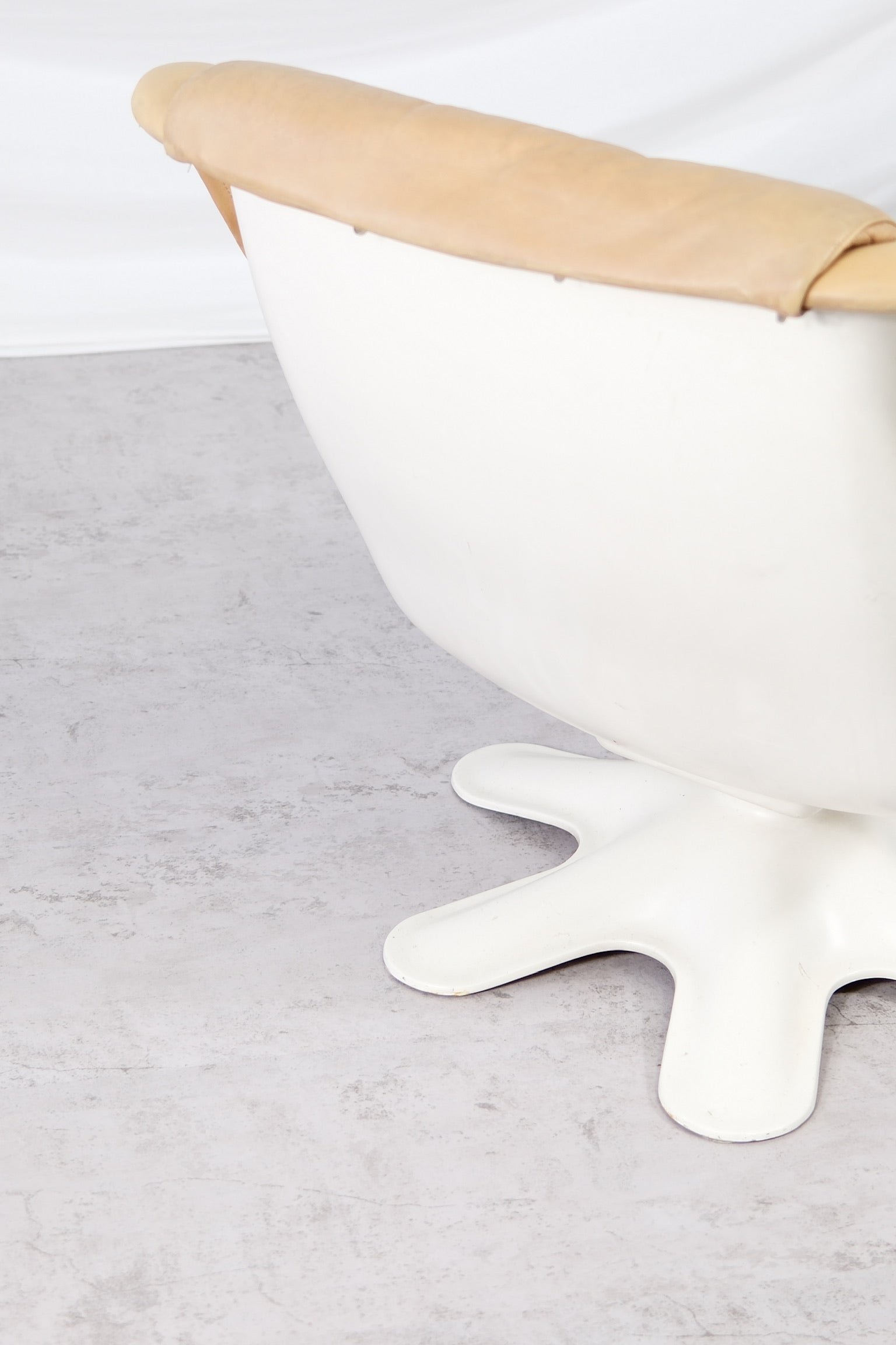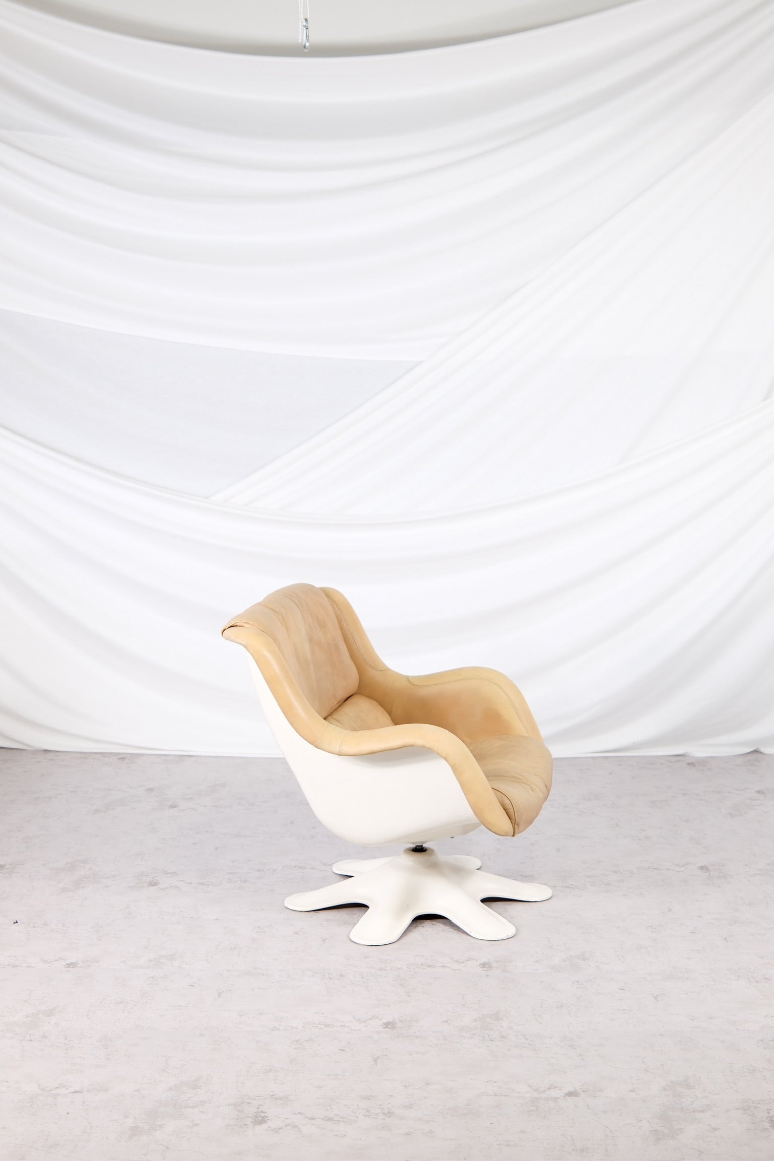 フィンランドモダンデザインの真のアイコンとも言える、ユルヨ・クッカプロによる418ピック・カルセリラウンジチェアは、有機的なフォルムと卓越した快適性を体現しています。1960年代にデザインされたこのチェアは、彫刻的な白いファイバーグラスシェルと星型の回転ベース、そしてヌガートーンのオリジナルレザー張りが特徴です。レザーは、時を経て温かみのある自然な風合いを醸し出しています。
