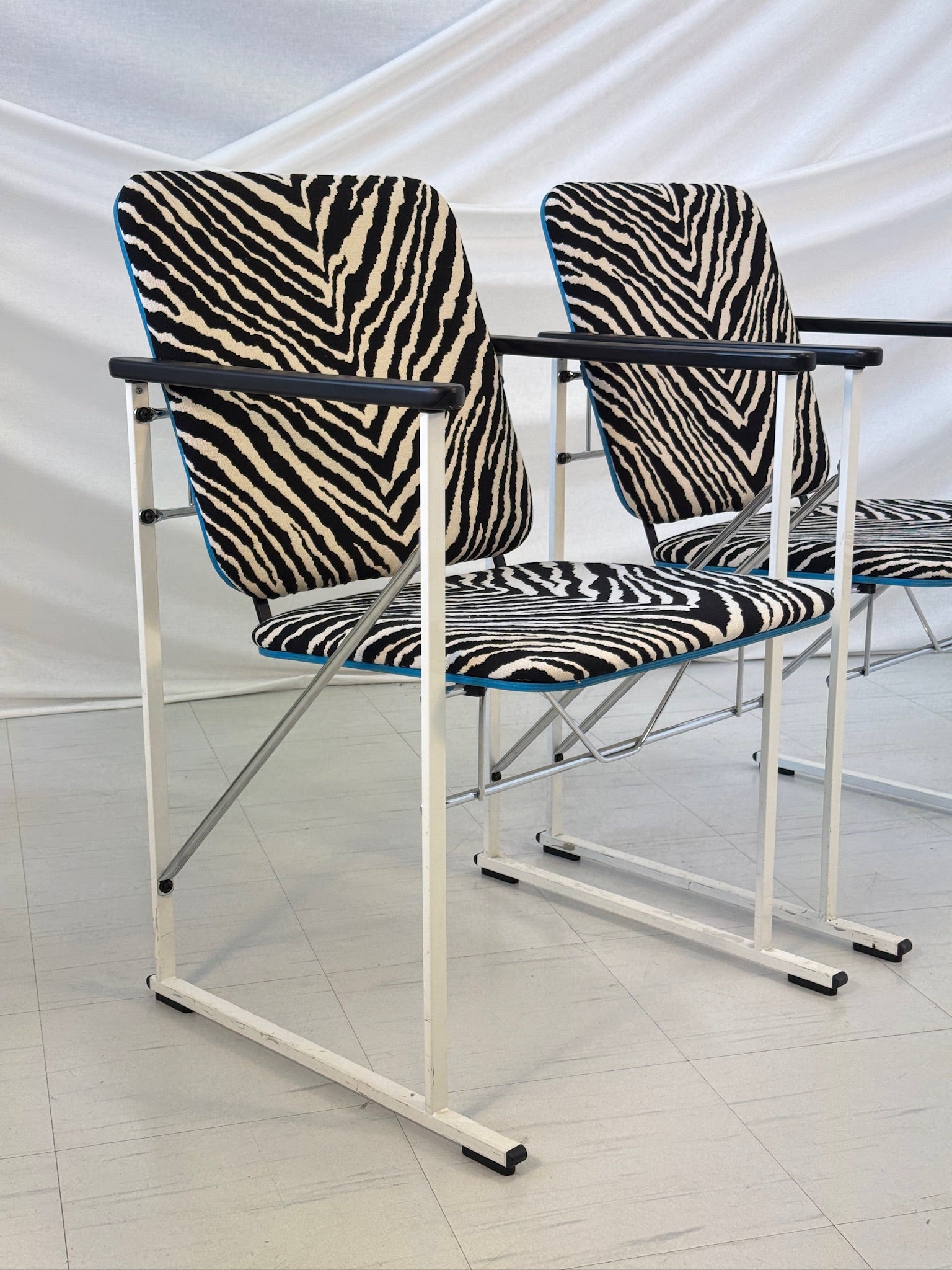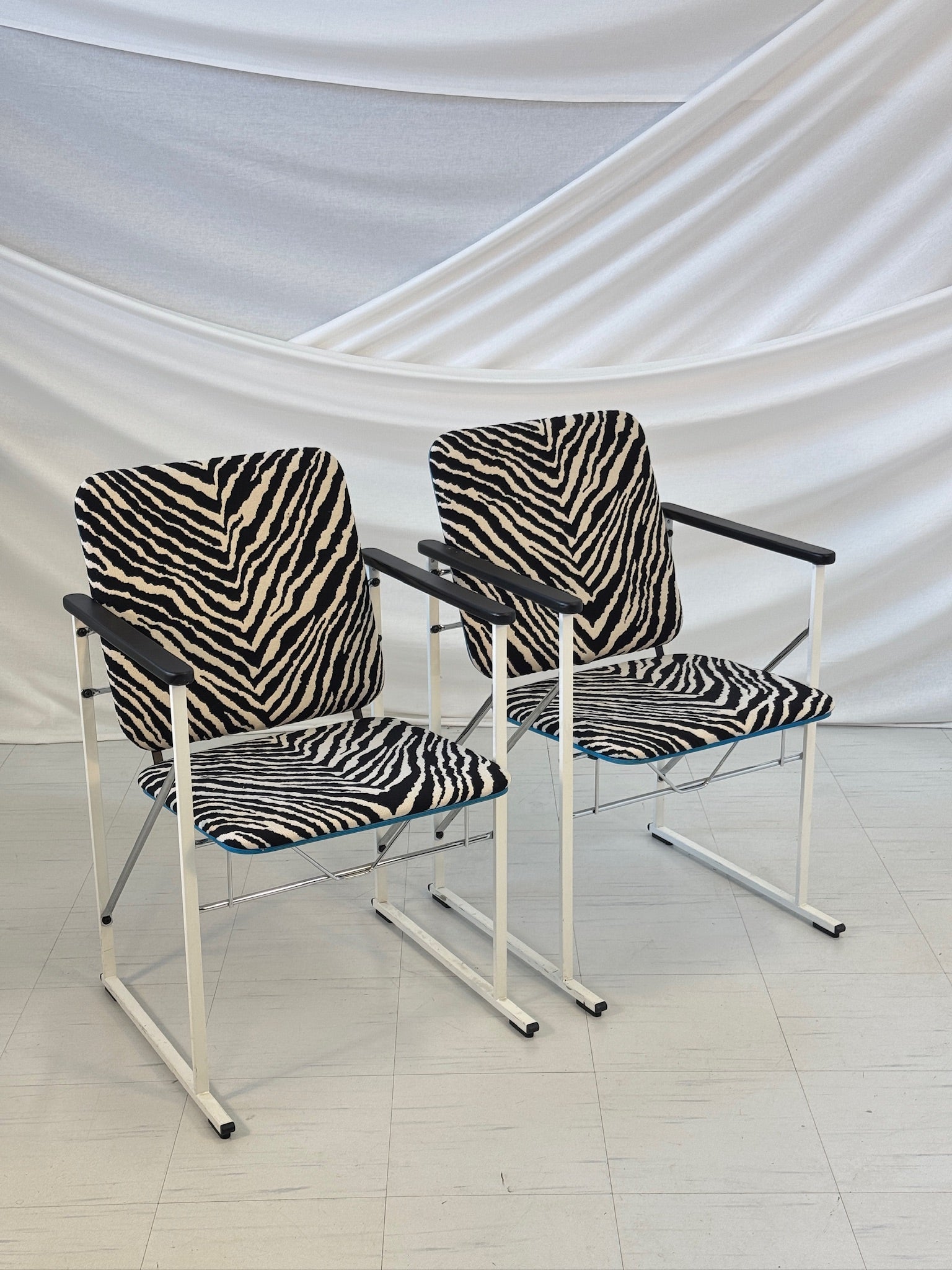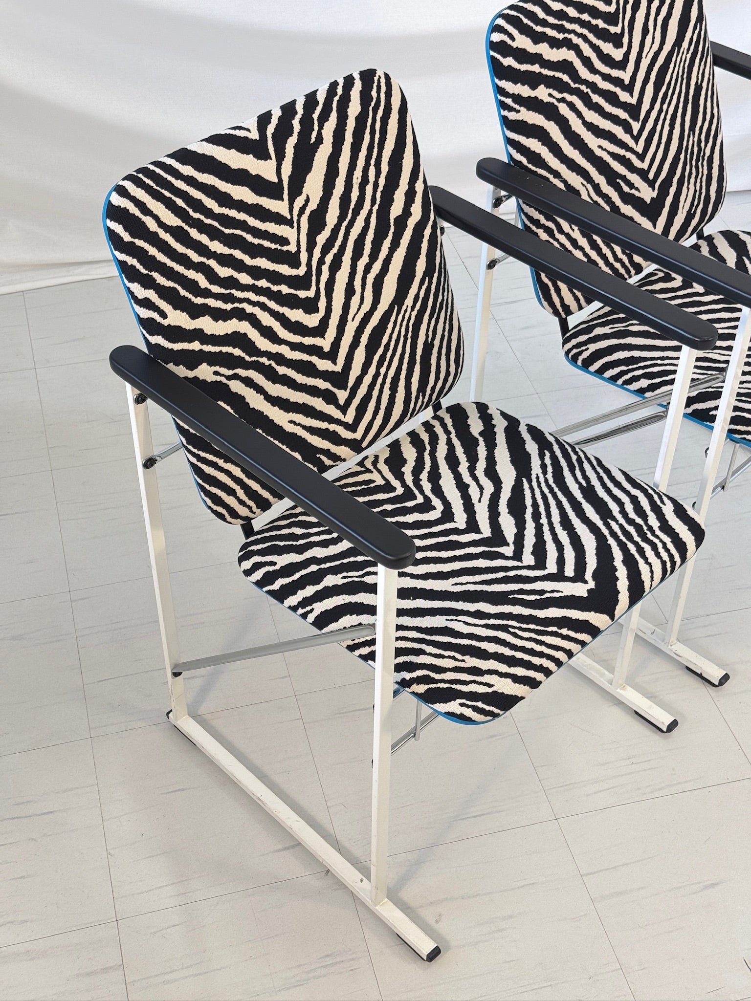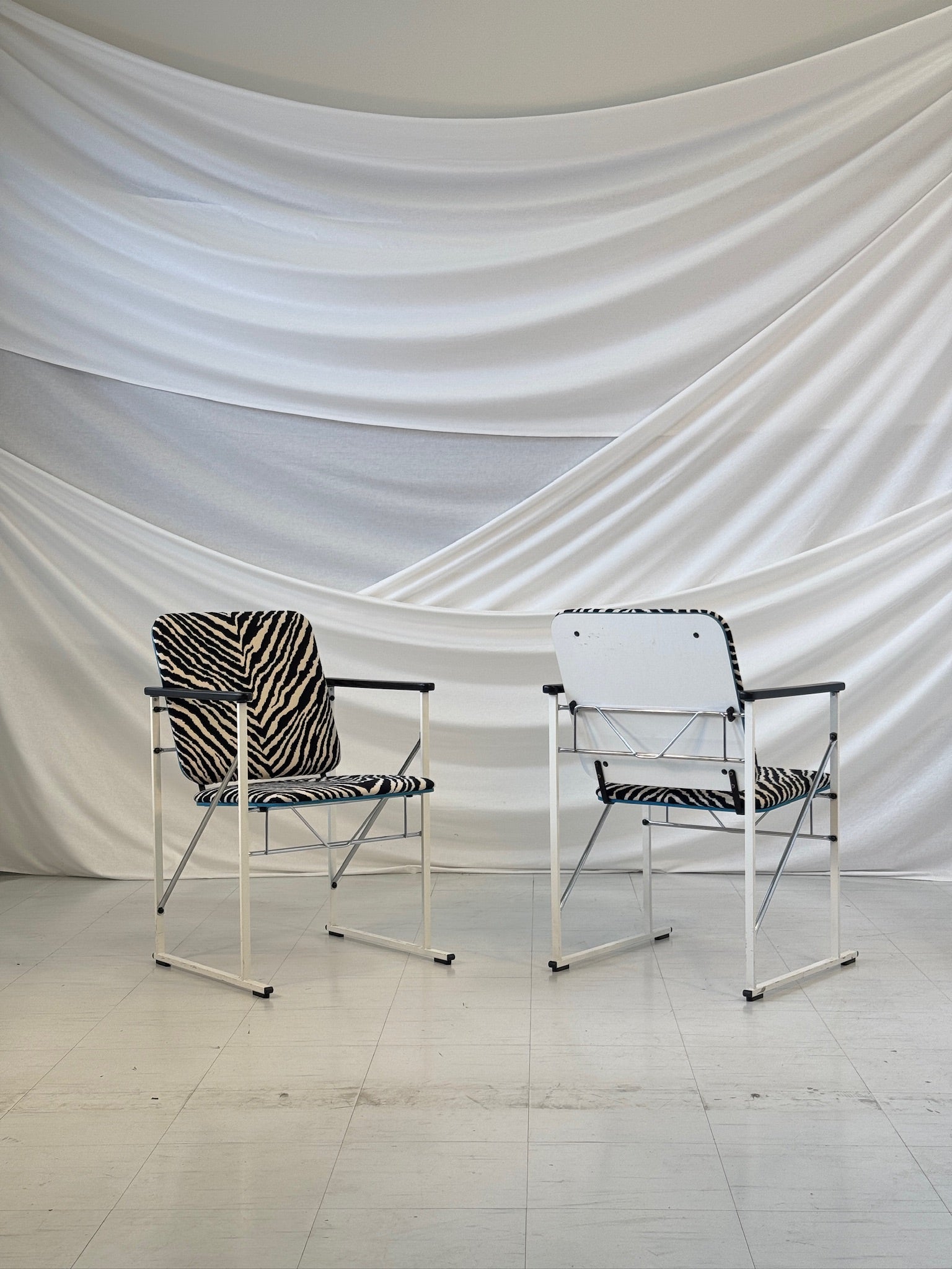 大胆でグラフィカルなクッカプロ。フィンランド人デザイナー、ユルヨ・クッカプロによる希少なA502チェアは、彫刻的なフォルムと機能的なミニマリズムが見事に融合しています。ホワイトパウダーコーティングのフレーム、クロームのディテール、そしてゼブラ柄の張地が特徴で、遊び心と合理性を兼ね備えた1980年代デザインの精神を体現しています。