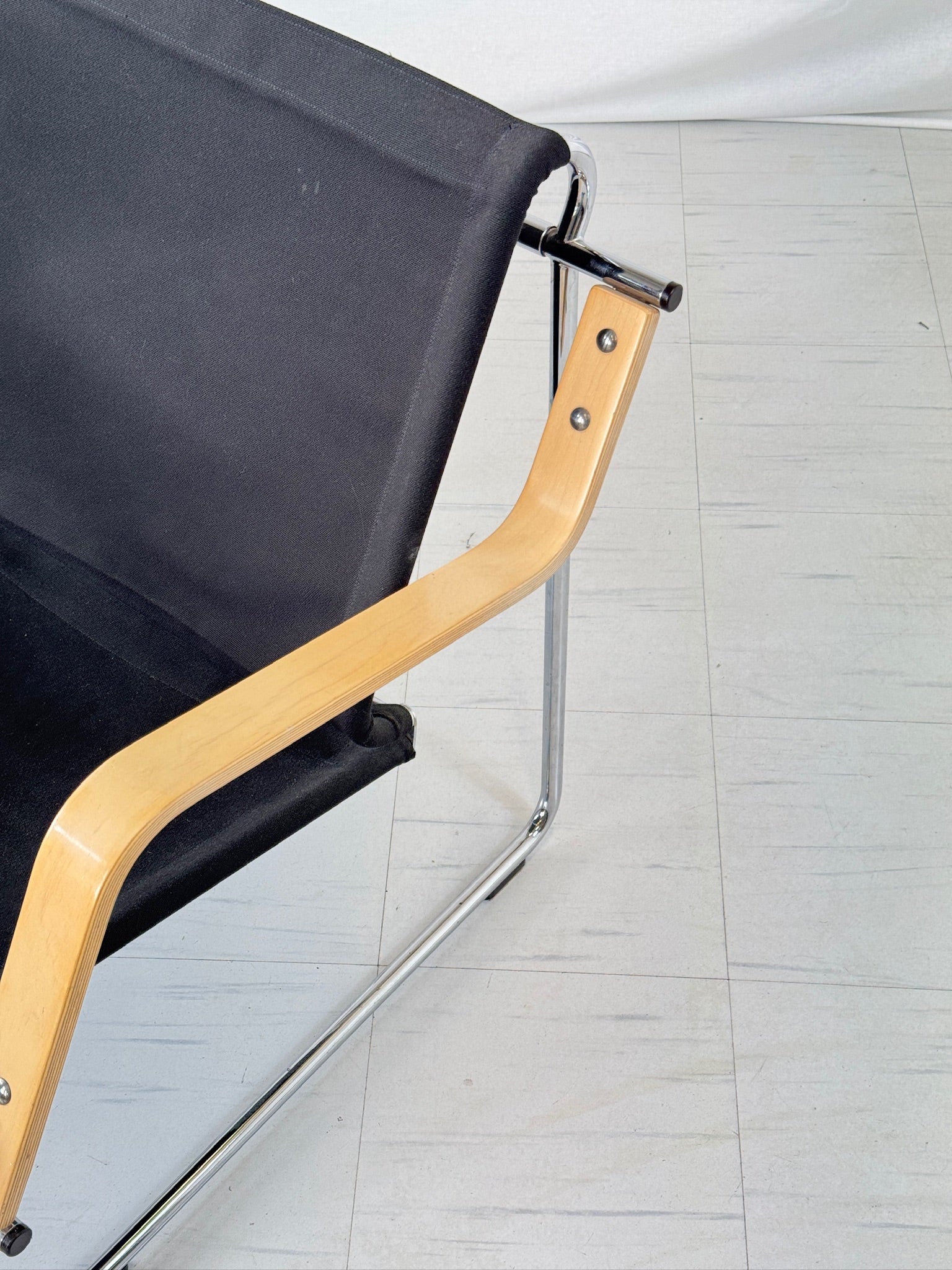 こちらの商品はヴィンテージ品として良好なコンディションです。スチールフレームは堅牢で腐食もなく、ファブリックシートには汚れや破れはなく、多少の使用感は見られます。木製のアームレストは柔らかな古色を帯びており、表面にわずかな傷が見られますが、安定性を損なうことなく個性を添えています。詳細については、詳細な写真をご覧ください。