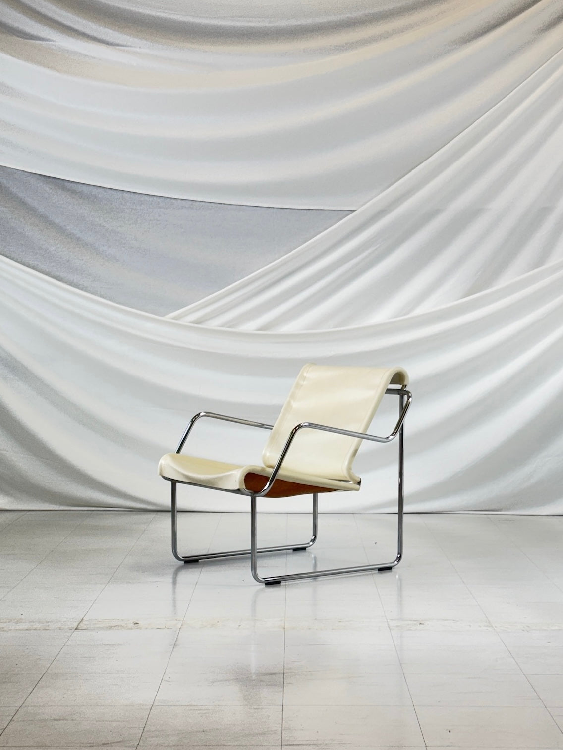 フィンランドの建築家ユルヨ・クッカプロが1980年代にデザインした「プレッス」アームチェアは、人間工学に基づいたフォルムとミニマルな構造への彼のこだわりを体現しています。洗練されたチューブラースチールフレームにホワイトレザーの張地をあしらい、軽快で機能的なシルエットと心地よい座り心地を両立しています。