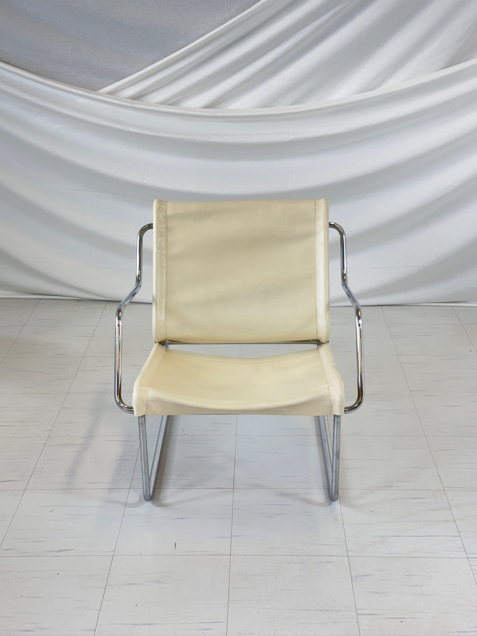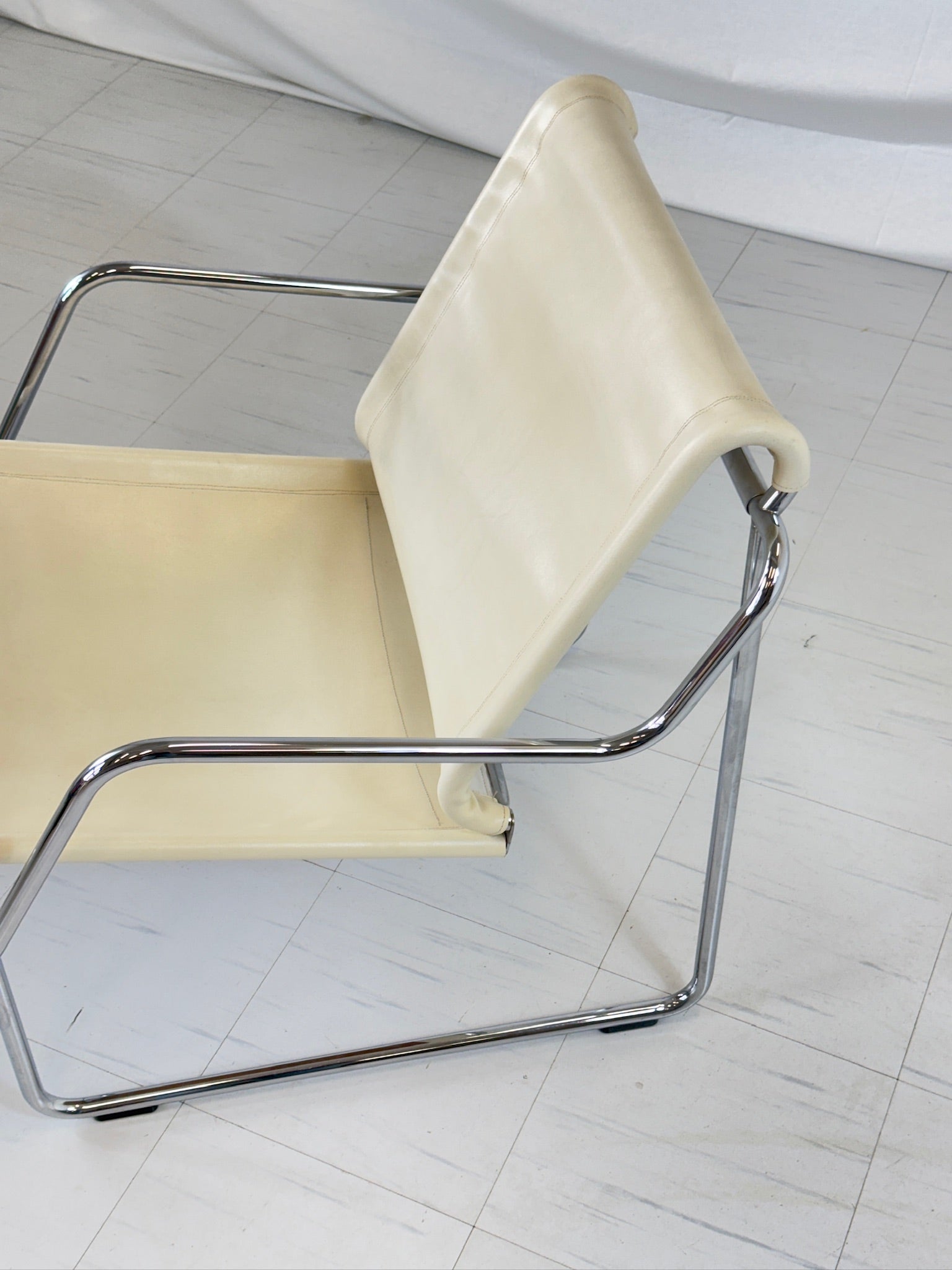 この椅子はヴィンテージとして良好なコンディションです。白いレザーには経年によるわずかな古色が見られますが、クロームフレームはわずかな使用感はあるものの、輝きを保っています。