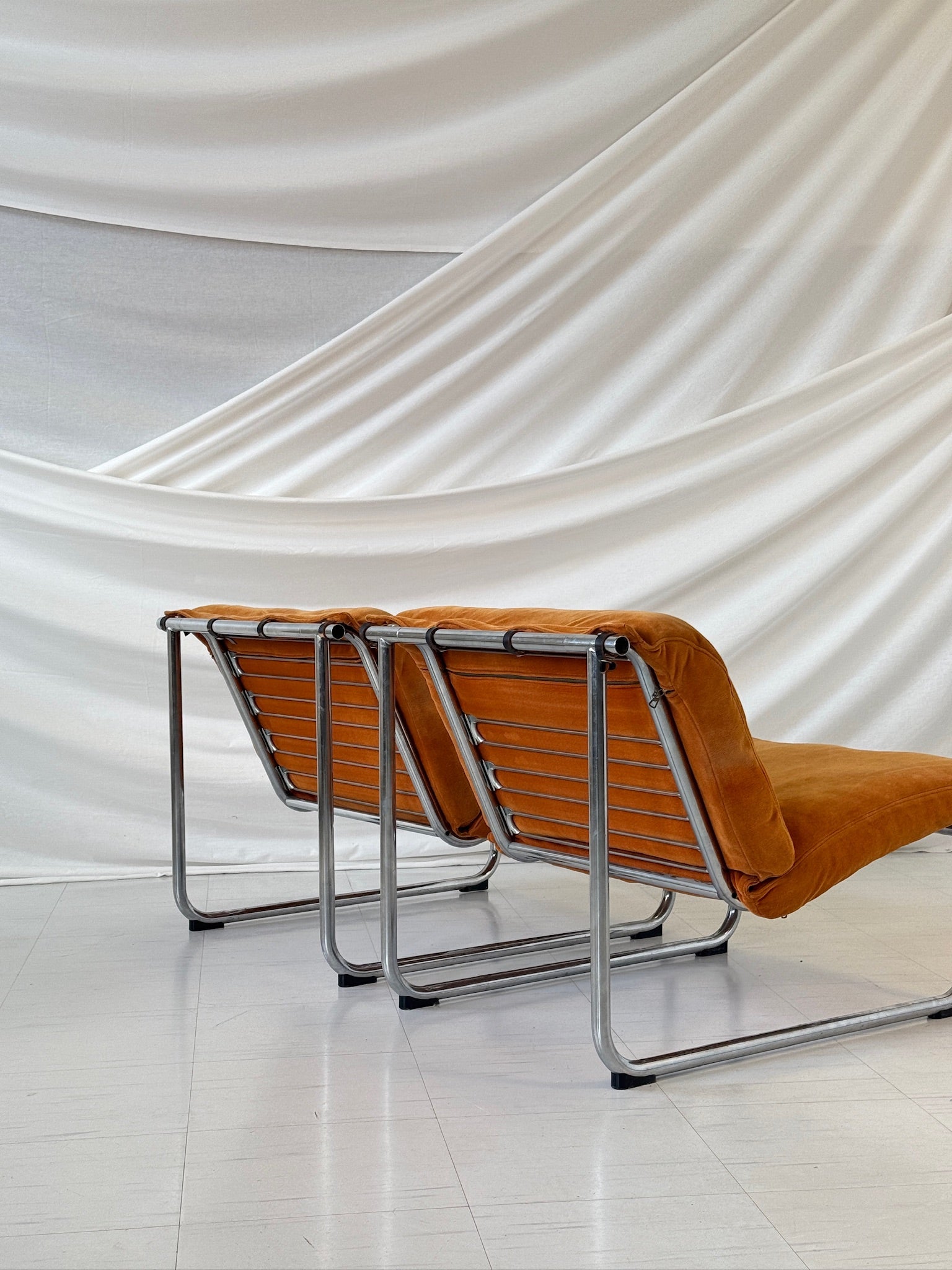 鮮やかなオレンジ色の豪華な張地が特徴的な、象徴的なレミラウンジチェアの印象的なバージョン。クッカプロの特徴である人間工学に基づいたフォルムと、遊び心のある質感と色彩が融合しています。クローム仕上げのスチール管フレームが、フローティングシートと調節可能なヘッドレストを支え、快適性と彫刻的な魅力を両立しています。フィンランドデザインとレトロフューチャリスティックな雰囲気が融合した、類まれな逸品です。
