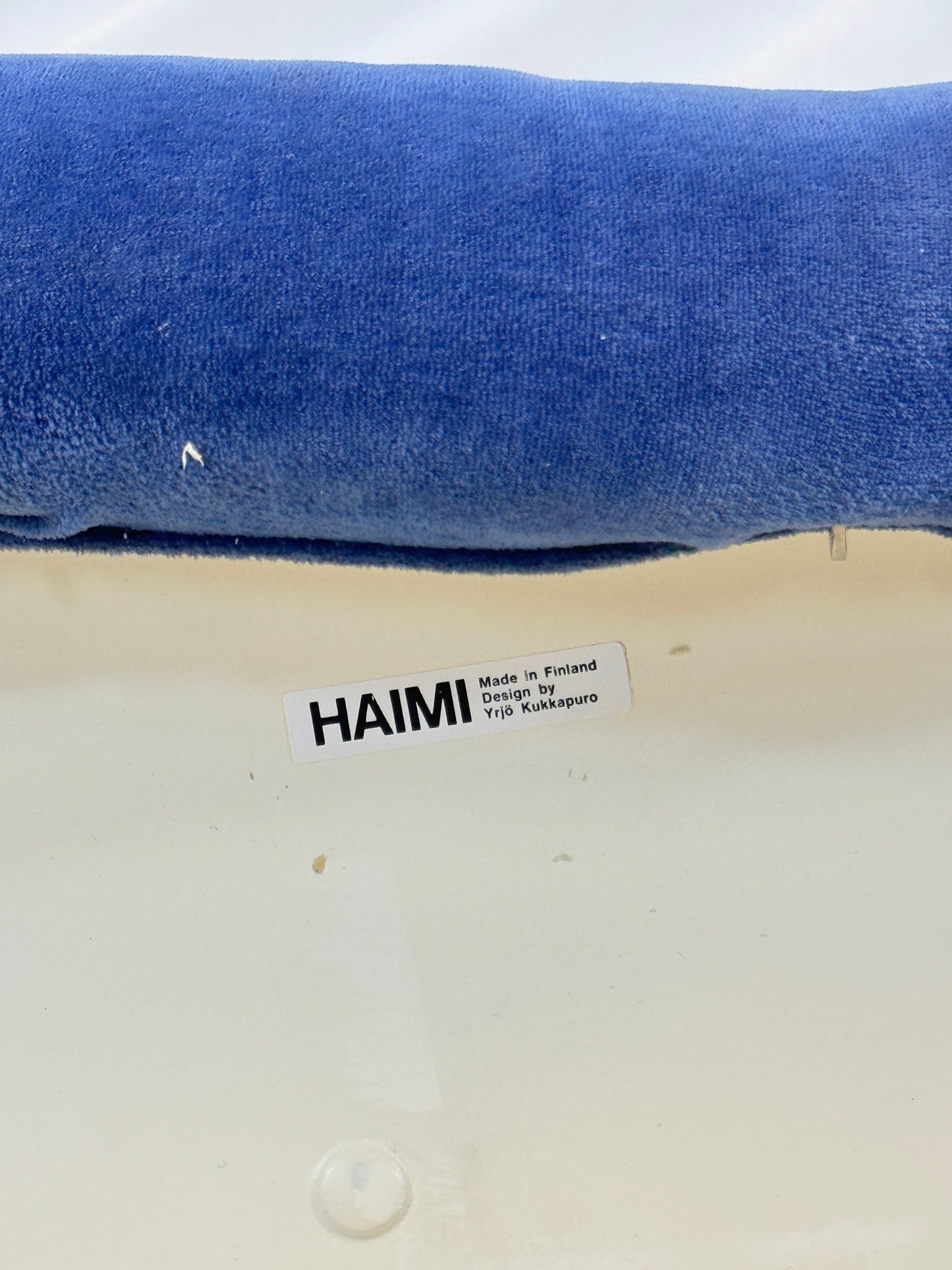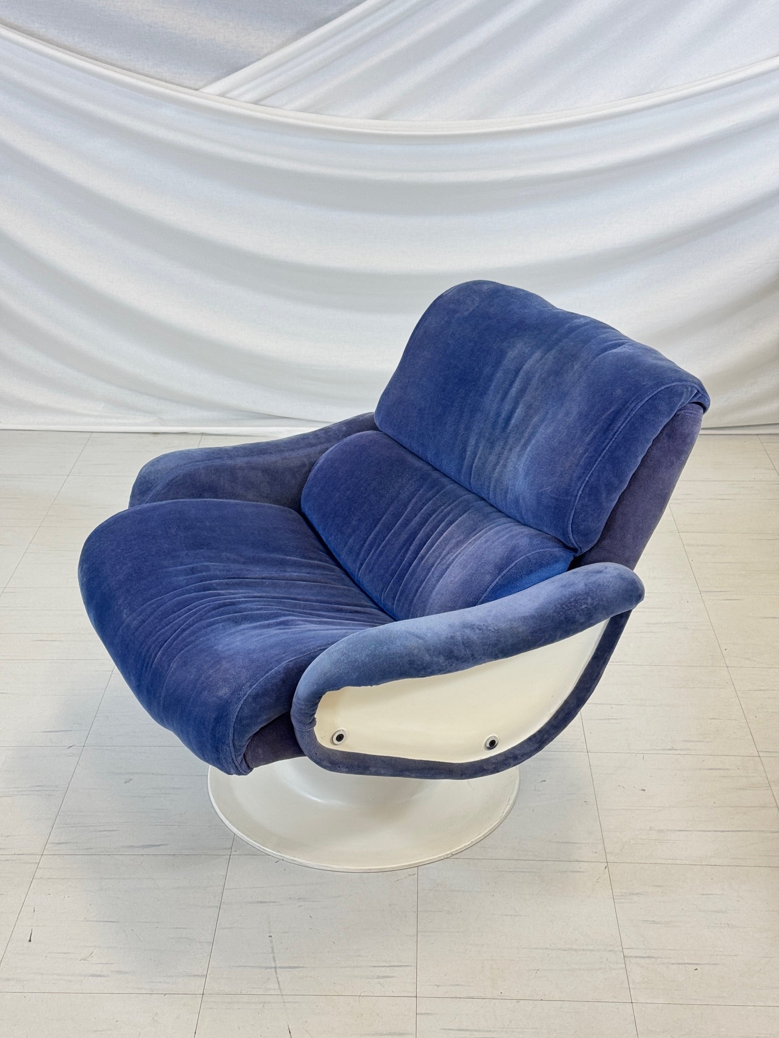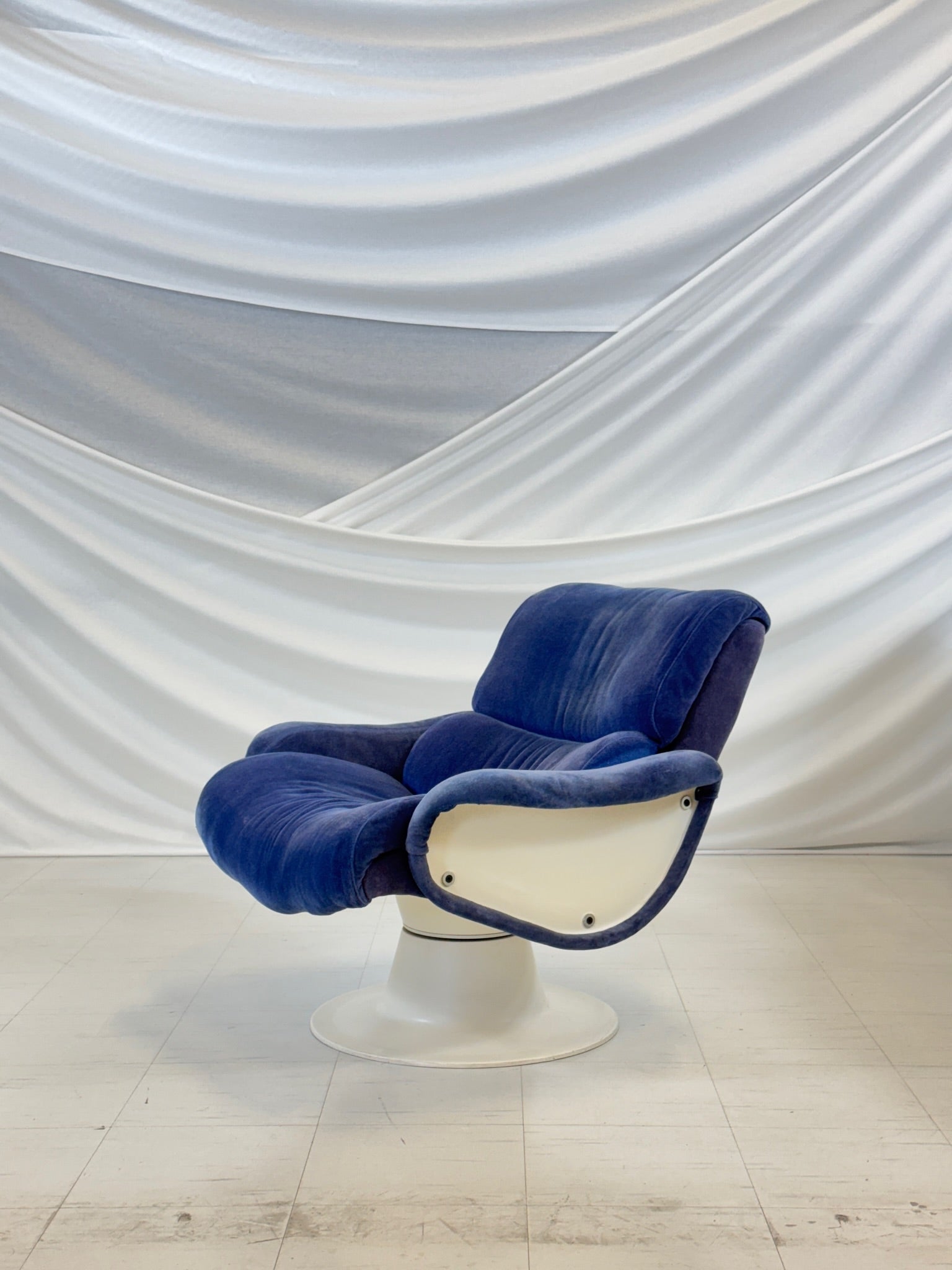 大胆なブルーのベルベットの張り地が白いグラスファイバーのシェルと美しく調和し、1970 年代にクッカプロがハイミのために手がけた作品に典型的な印象的なコントラストを生み出しています。